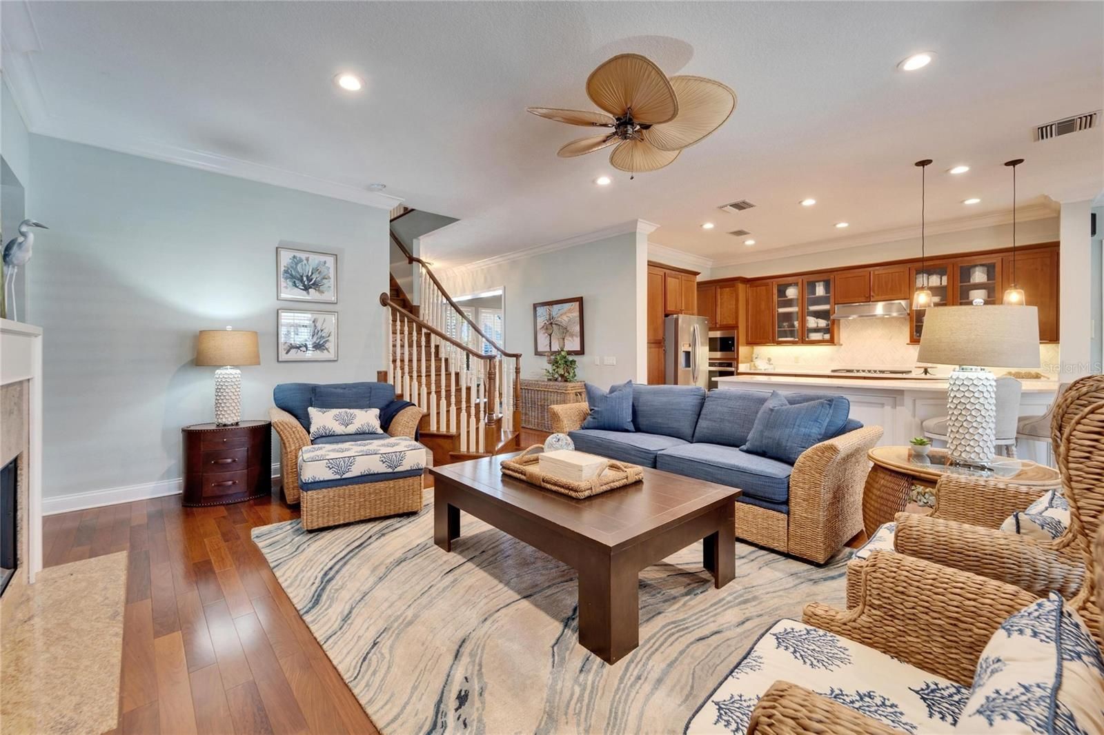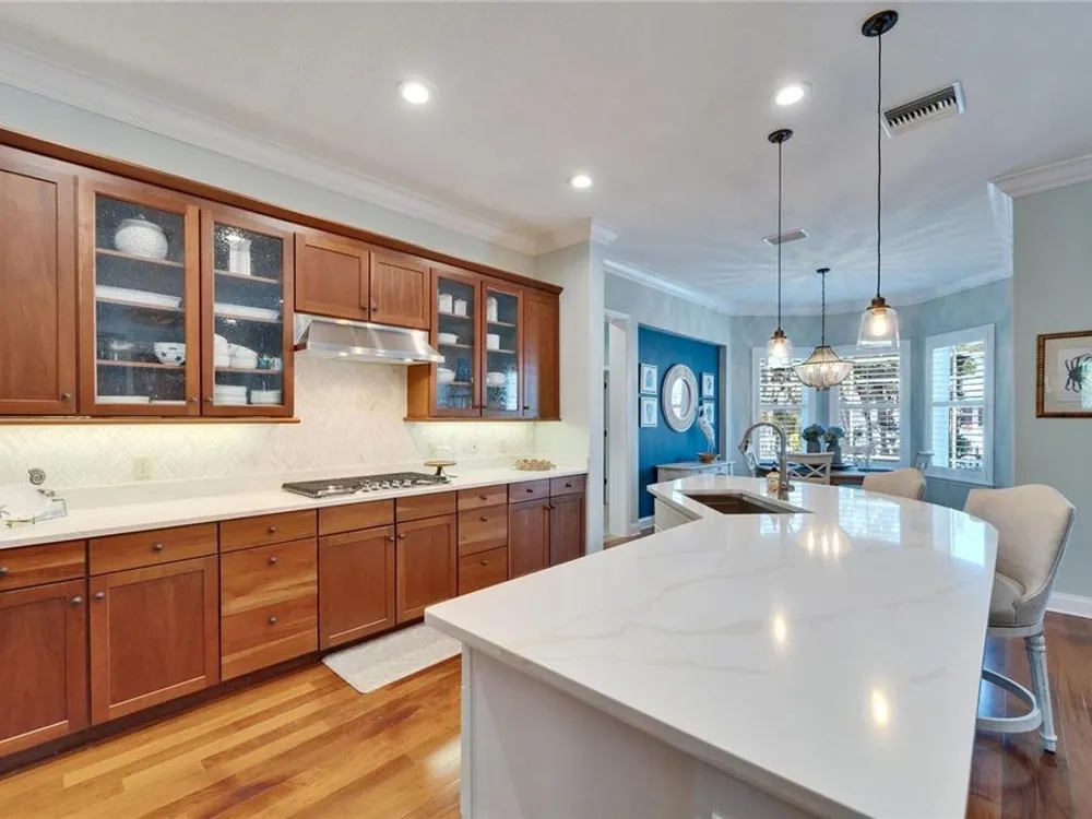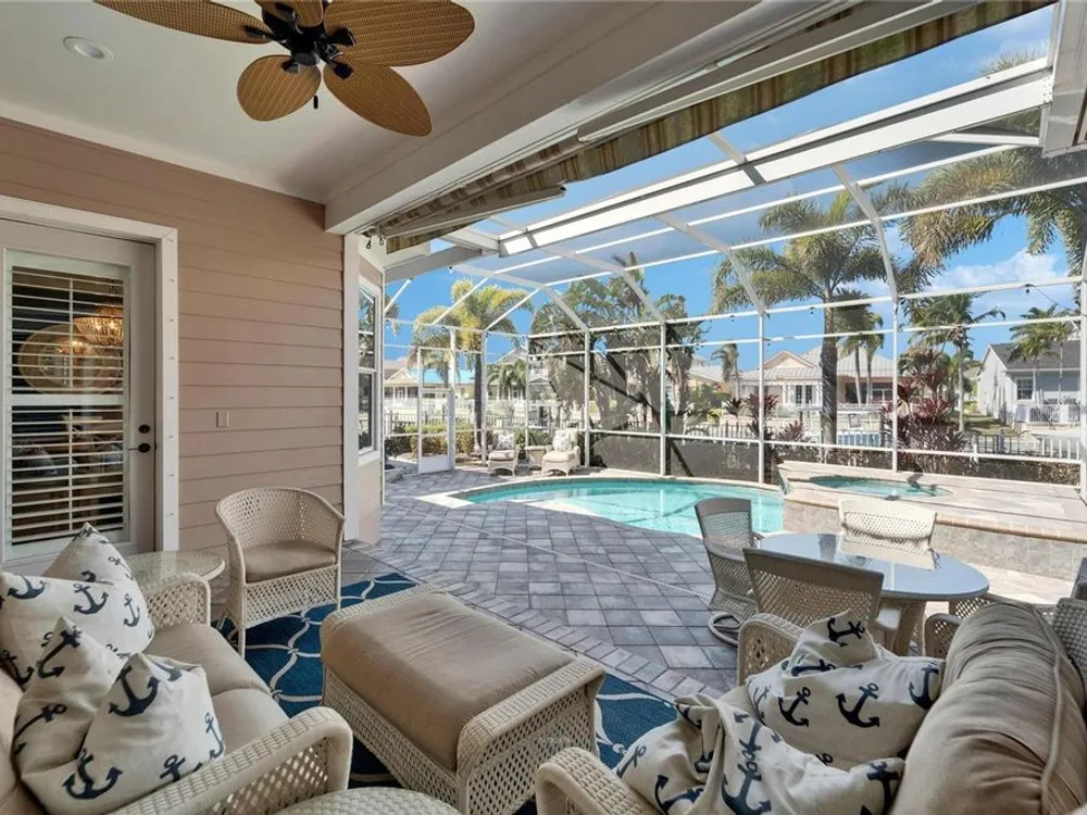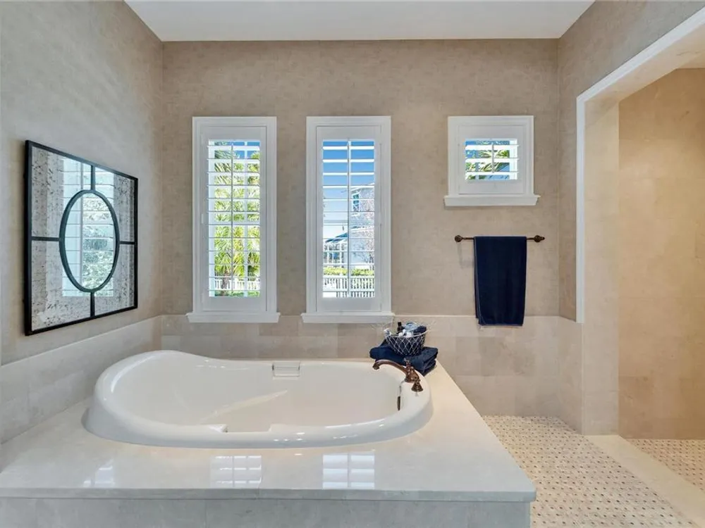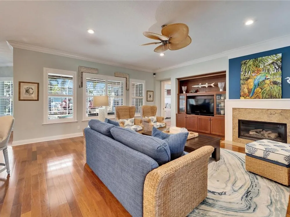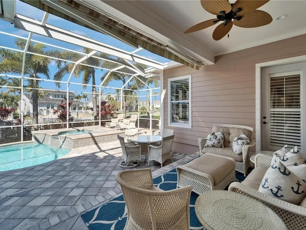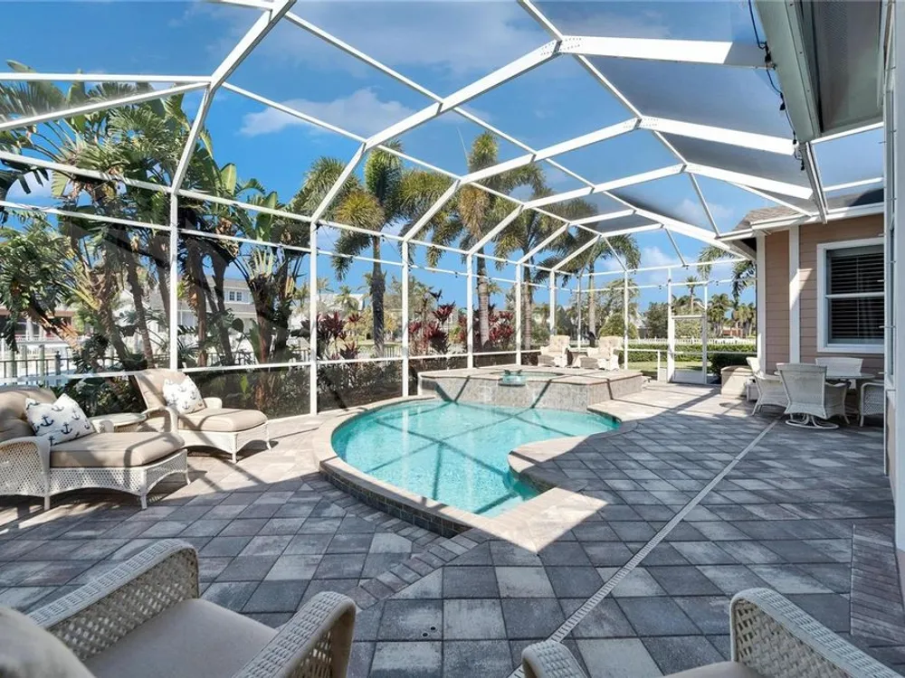 5616 Seagrass Place | Gulfview Floorplan 4 Beds | 4 Baths | Den + Loft | 3,618 Sq Ft | Oversized Lot with 140’ Waterfront | Former Model by Sabal 5616 Seagrass Place is a former model home built by Sabal featuring the sought-after Gulfview floorplan on an oversized pie-shaped lot with over 140 feet of direct waterfront—nearly double the frontage of most homes in the community. Located across from a landscaped community greenbelt, this home offers added privacy and space, including a fully landscaped side yard. The first floor includes the primary suite, a separate guest bedroom and bath, a formal office with built-ins and French doors to a private front porch, a large laundry room, and open living and dining areas. The kitchen was remodeled in 2024 with new appliances, quartz countertops, updated backsplash, under-cabinet lighting, a wrap-around bar, and a café-style dining space surrounded by windows overlooking the pool and water. A butler’s pantry connects the formal dining room and kitchen, along with a large walk-in pantry. The main living room features a gas fireplace and custom built-ins. Upstairs includes two additional bedrooms, one with a private bath and walk-in closet, a shared hallway bath, and a large loft with wet bar, wine fridge, custom trim, and deep plantation shutters. Two covered balconies provide water views—one facing east for sunrise, the other west for Tampa Bay sunsets. The screened-in outdoor living space features a heated saltwater pool and spa. The dock is equipped with water and electricity. The oversized 3-car garage includes a tandem bay for a golf cart or workshop, and the extended driveway has upgraded brick pavers. Recent updates include a full kitchen remodel (2024), upstairs bathrooms remodeled (2024), new roof (2020), new pool heater, recently replaced AC units, full-home plantation shutters, and an electric rear awning. The home has been pre-inspected for buyer peace of mind.