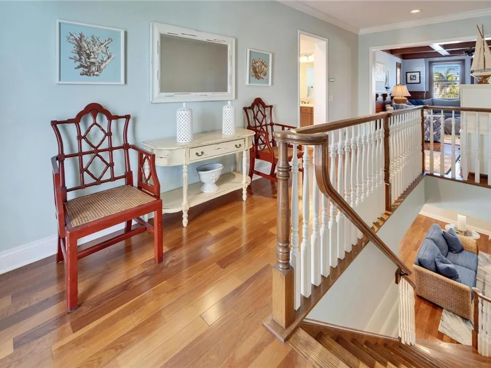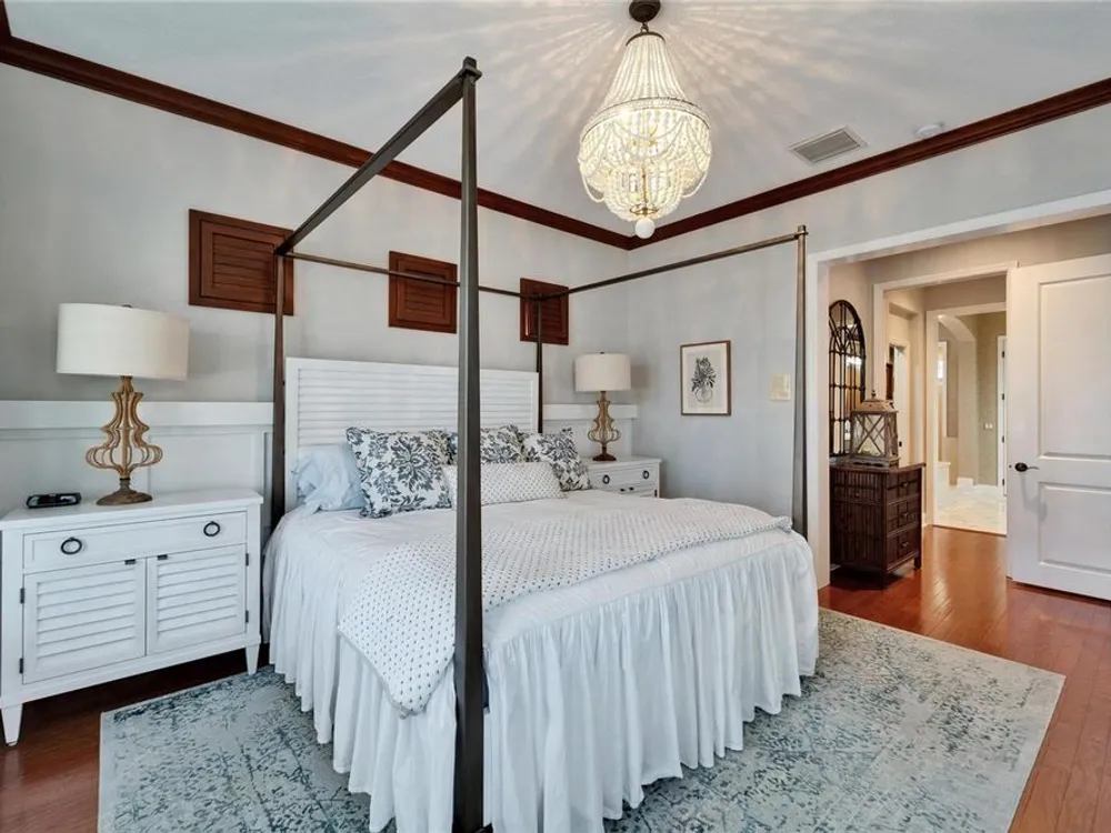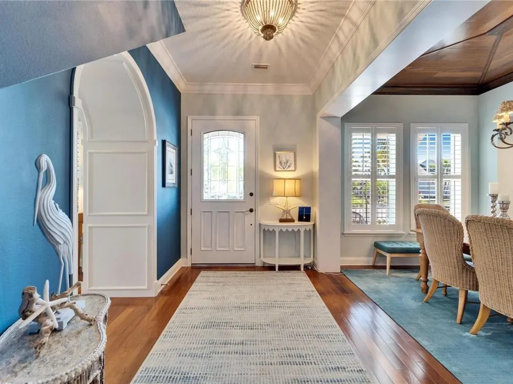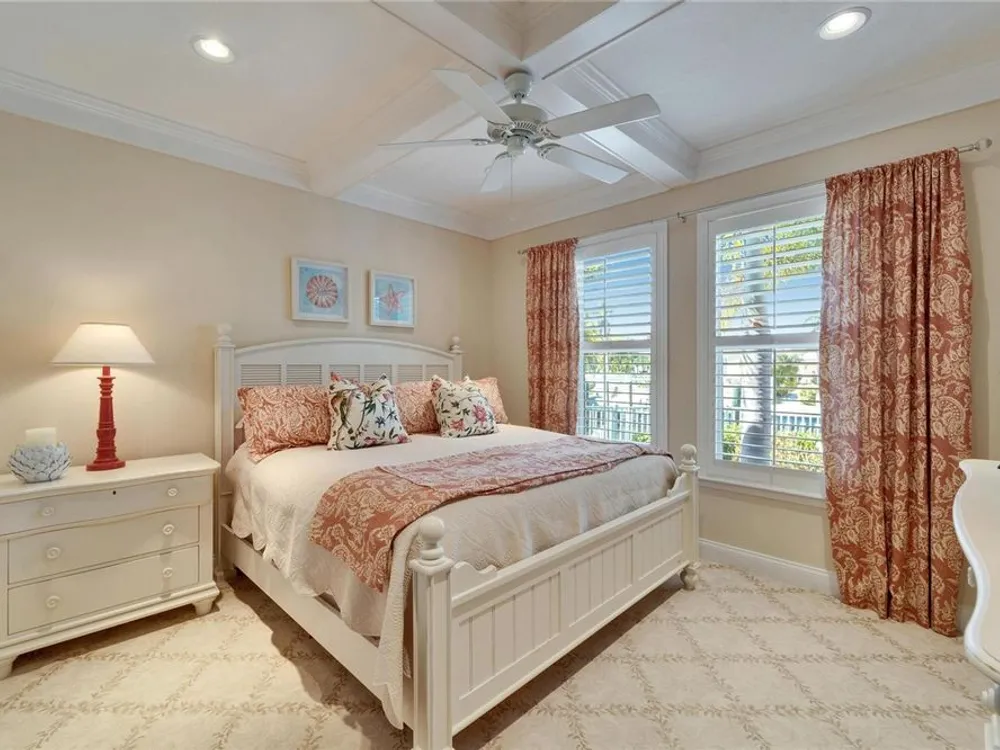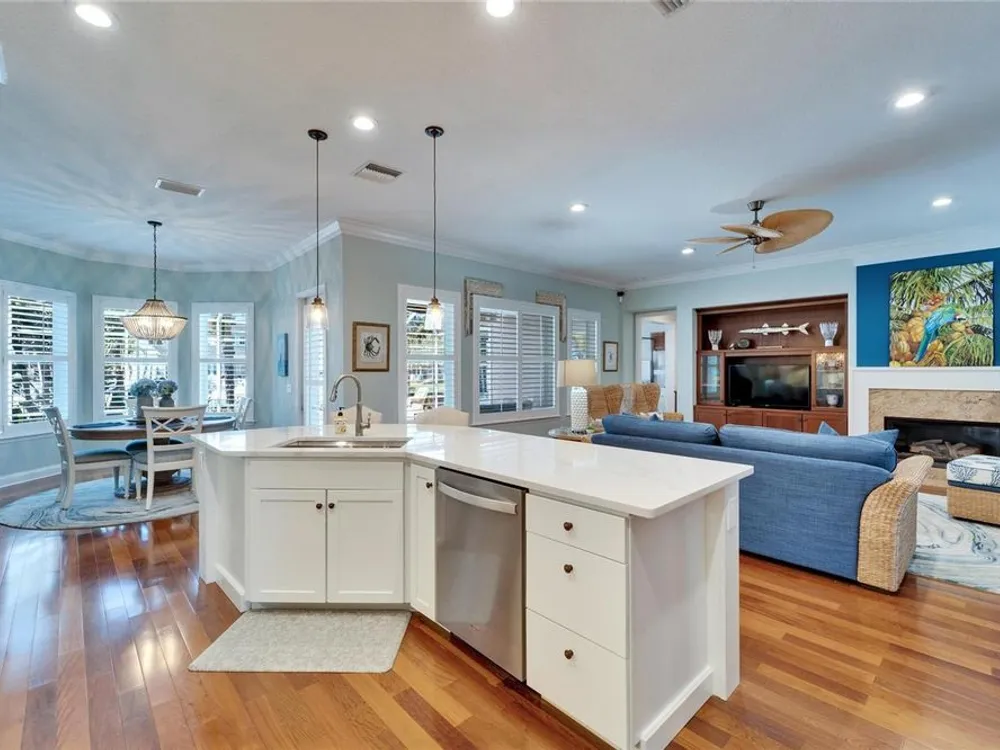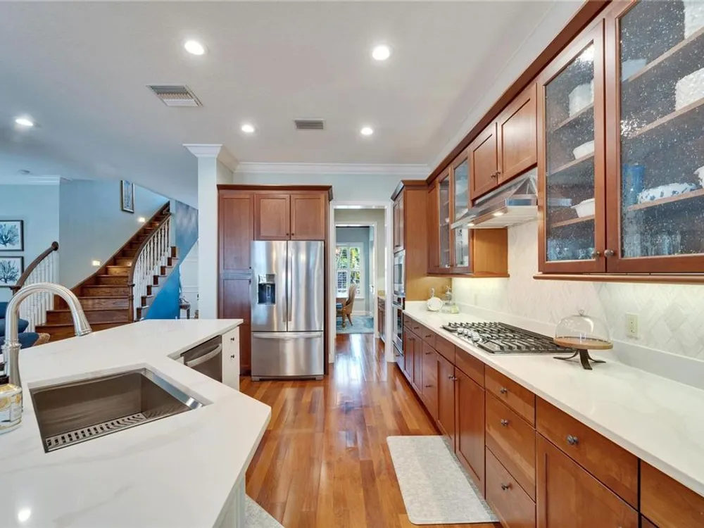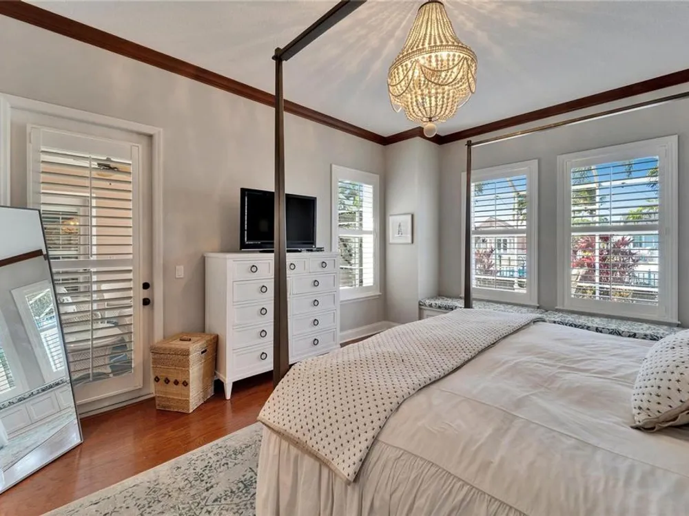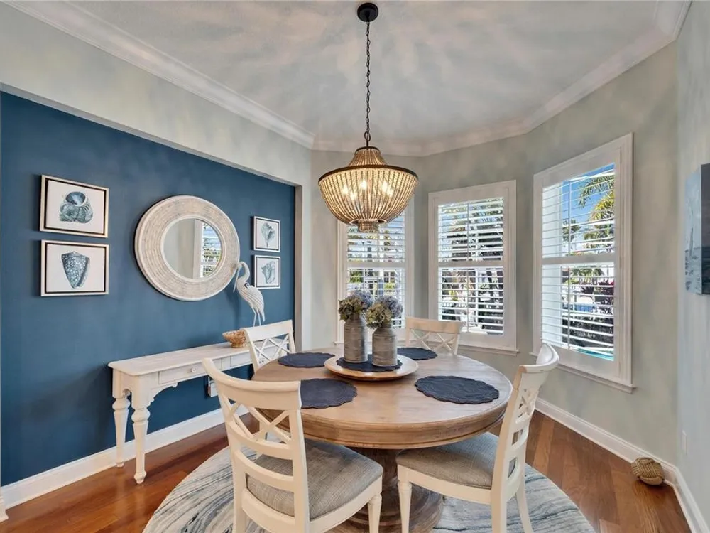 5616 Seagrass Place | Gulfview Floorplan 4 Beds | 4 Baths | Den + Loft | 3,618 Sq Ft | Oversized Lot with 140’ Waterfront | Former Model by Sabal 5616 Seagrass Place is a former model home built by Sabal featuring the sought-after Gulfview floorplan on an oversized pie-shaped lot with over 140 feet of direct waterfront—nearly double the frontage of most homes in the community. Located across from a landscaped community greenbelt, this home offers added privacy and space, including a fully landscaped side yard. The first floor includes the primary suite, a separate guest bedroom and bath, a formal office with built-ins and French doors to a private front porch, a large laundry room, and open living and dining areas. The kitchen was remodeled in 2024 with new appliances, quartz countertops, updated backsplash, under-cabinet lighting, a wrap-around bar, and a café-style dining space surrounded by windows overlooking the pool and water. A butler’s pantry connects the formal dining room and kitchen, along with a large walk-in pantry. The main living room features a gas fireplace and custom built-ins. Upstairs includes two additional bedrooms, one with a private bath and walk-in closet, a shared hallway bath, and a large loft with wet bar, wine fridge, custom trim, and deep plantation shutters. Two covered balconies provide water views—one facing east for sunrise, the other west for Tampa Bay sunsets. The screened-in outdoor living space features a heated saltwater pool and spa. The dock is equipped with water and electricity. The oversized 3-car garage includes a tandem bay for a golf cart or workshop, and the extended driveway has upgraded brick pavers. Recent updates include a full kitchen remodel (2024), upstairs bathrooms remodeled (2024), new roof (2020), new pool heater, recently replaced AC units, full-home plantation shutters, and an electric rear awning. The home has been pre-inspected for buyer peace of mind.