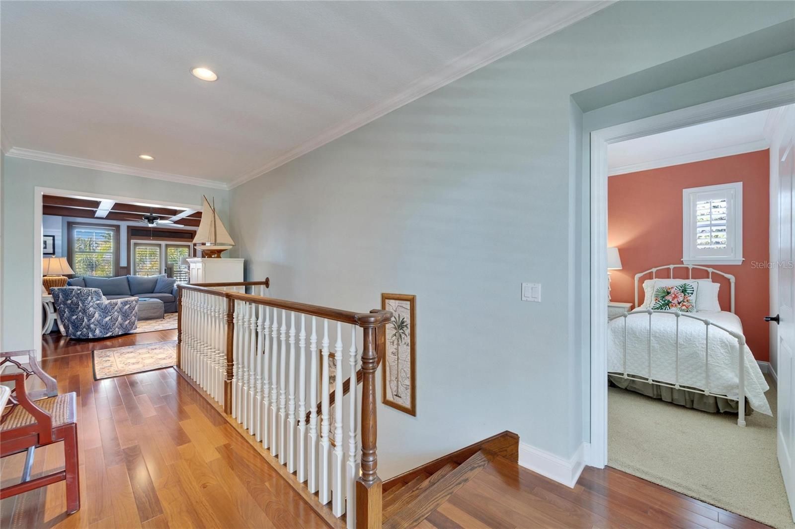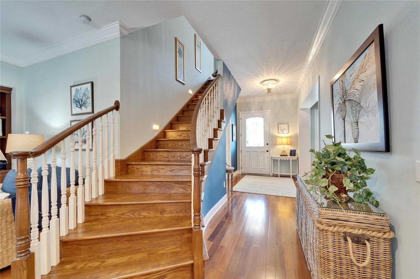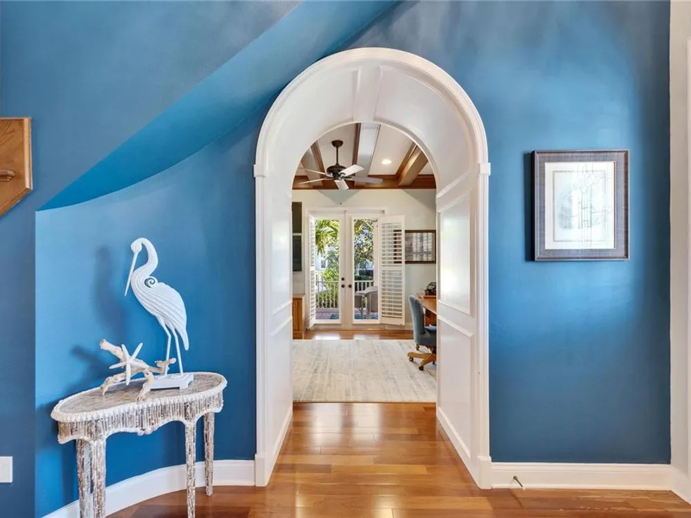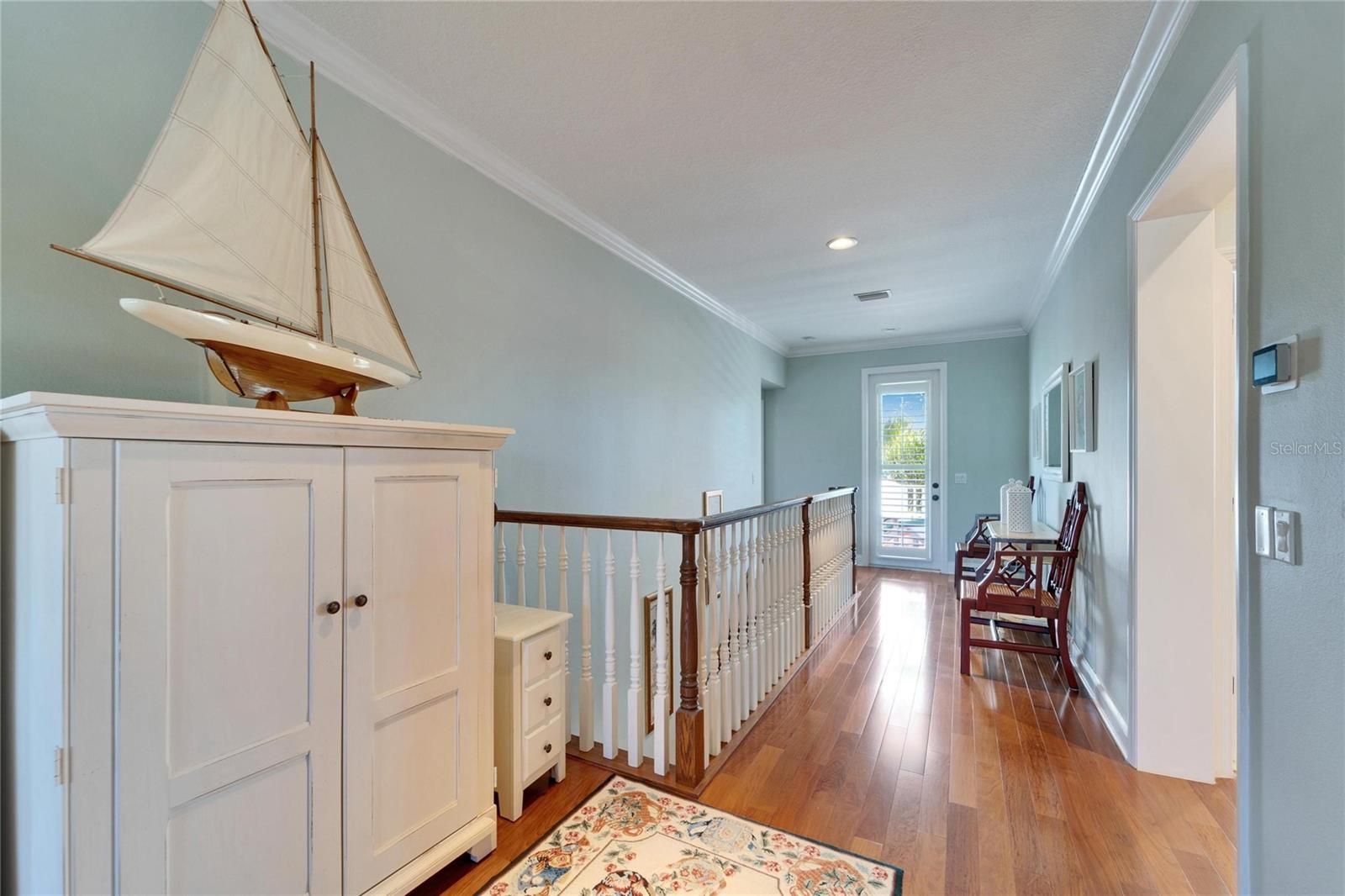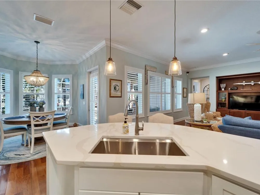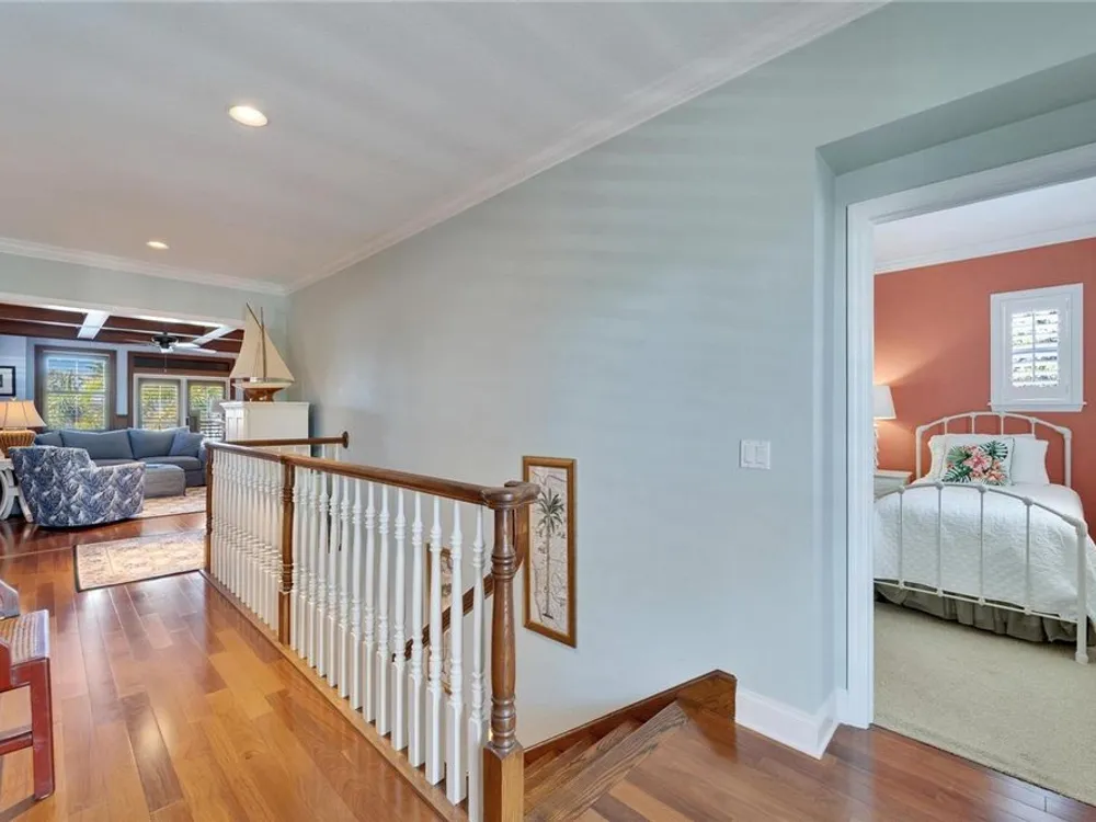 5616 Seagrass Place | Gulfview Floorplan 4 Beds | 4 Baths | Den + Loft | 3,618 Sq Ft | Oversized Lot with 140’ Waterfront | Former Model by Sabal 5616 Seagrass Place is a former model home built by Sabal featuring the sought-after Gulfview floorplan on an oversized pie-shaped lot with over 140 feet of direct waterfront—nearly double the frontage of most homes in the community. Located across from a landscaped community greenbelt, this home offers added privacy and space, including a fully landscaped side yard. The first floor includes the primary suite, a separate guest bedroom and bath, a formal office with built-ins and French doors to a private front porch, a large laundry room, and open living and dining areas. The kitchen was remodeled in 2024 with new appliances, quartz countertops, updated backsplash, under-cabinet lighting, a wrap-around bar, and a café-style dining space surrounded by windows overlooking the pool and water. A butler’s pantry connects the formal dining room and kitchen, along with a large walk-in pantry. The main living room features a gas fireplace and custom built-ins. Upstairs includes two additional bedrooms, one with a private bath and walk-in closet, a shared hallway bath, and a large loft with wet bar, wine fridge, custom trim, and deep plantation shutters. Two covered balconies provide water views—one facing east for sunrise, the other west for Tampa Bay sunsets. The screened-in outdoor living space features a heated saltwater pool and spa. The dock is equipped with water and electricity. The oversized 3-car garage includes a tandem bay for a golf cart or workshop, and the extended driveway has upgraded brick pavers. Recent updates include a full kitchen remodel (2024), upstairs bathrooms remodeled (2024), new roof (2020), new pool heater, recently replaced AC units, full-home plantation shutters, and an electric rear awning. The home has been pre-inspected for buyer peace of mind.