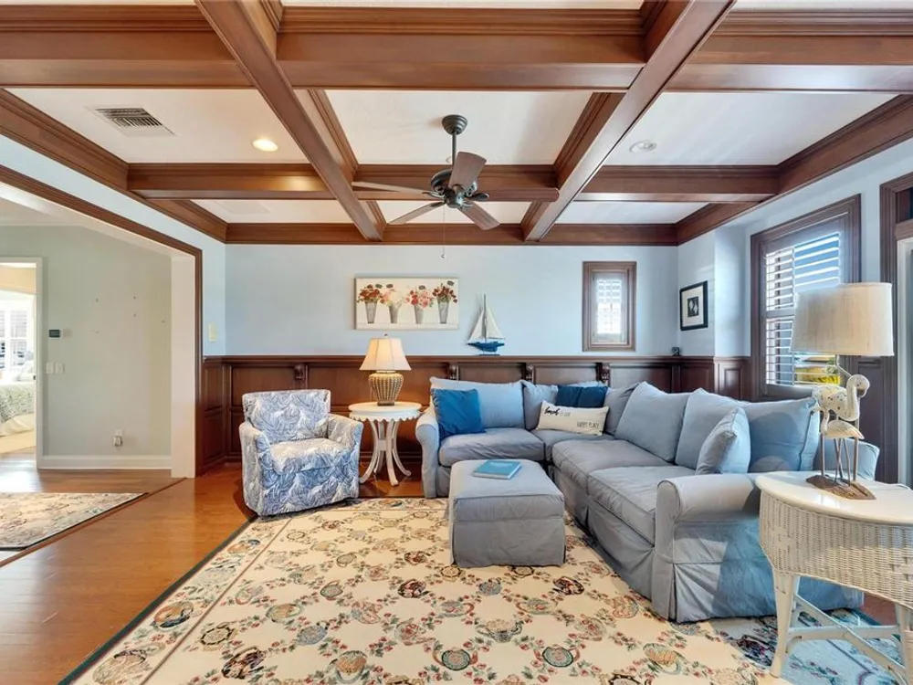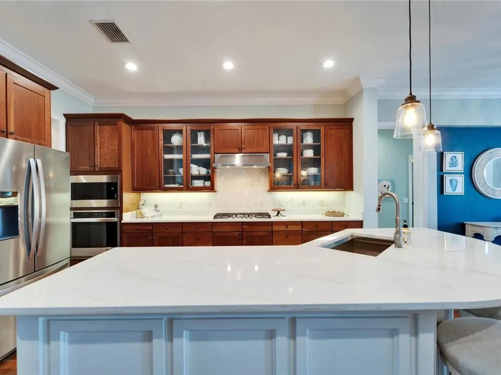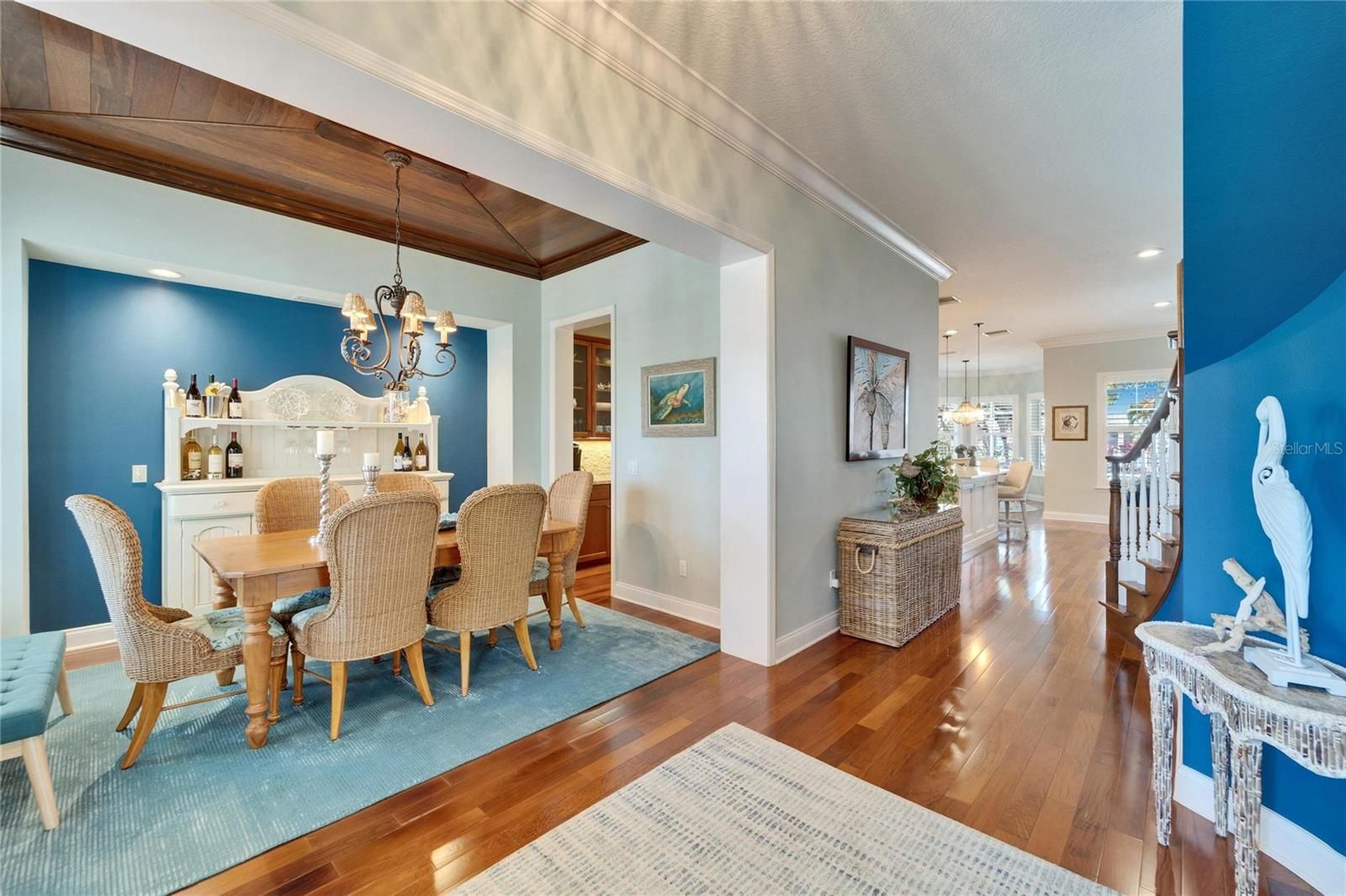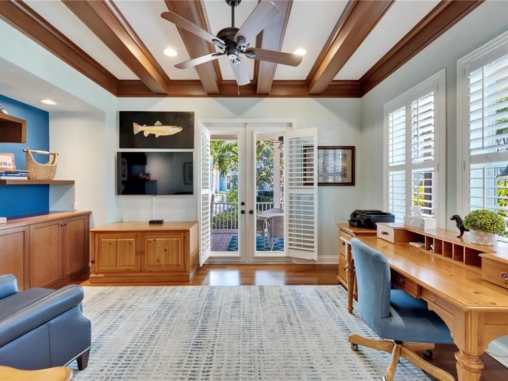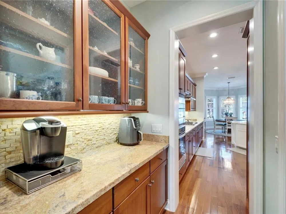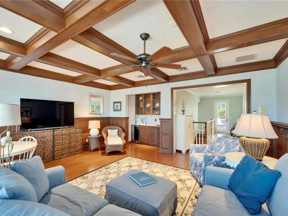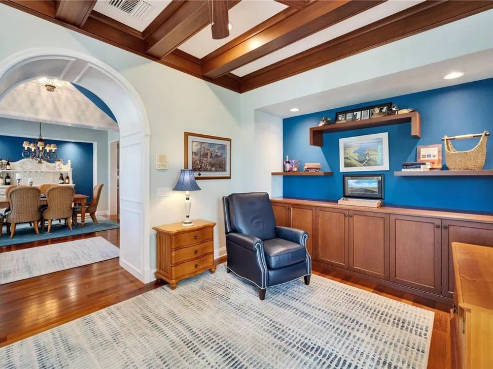 - Built-in Features, Ceiling Fan(s), Coffered Ceiling(s), Crown Molding, Eat-in Kitchen, High Ceilings, Kitchen/Family Room Combo, Open Floorplan, Main Level Primary, Solid-Wood Cabinets, Split Bedrooms, Stone Counters, Thermostat, Tray Ceiling(s), Walk-In Closet(s), Wet Bar, Window Treatments