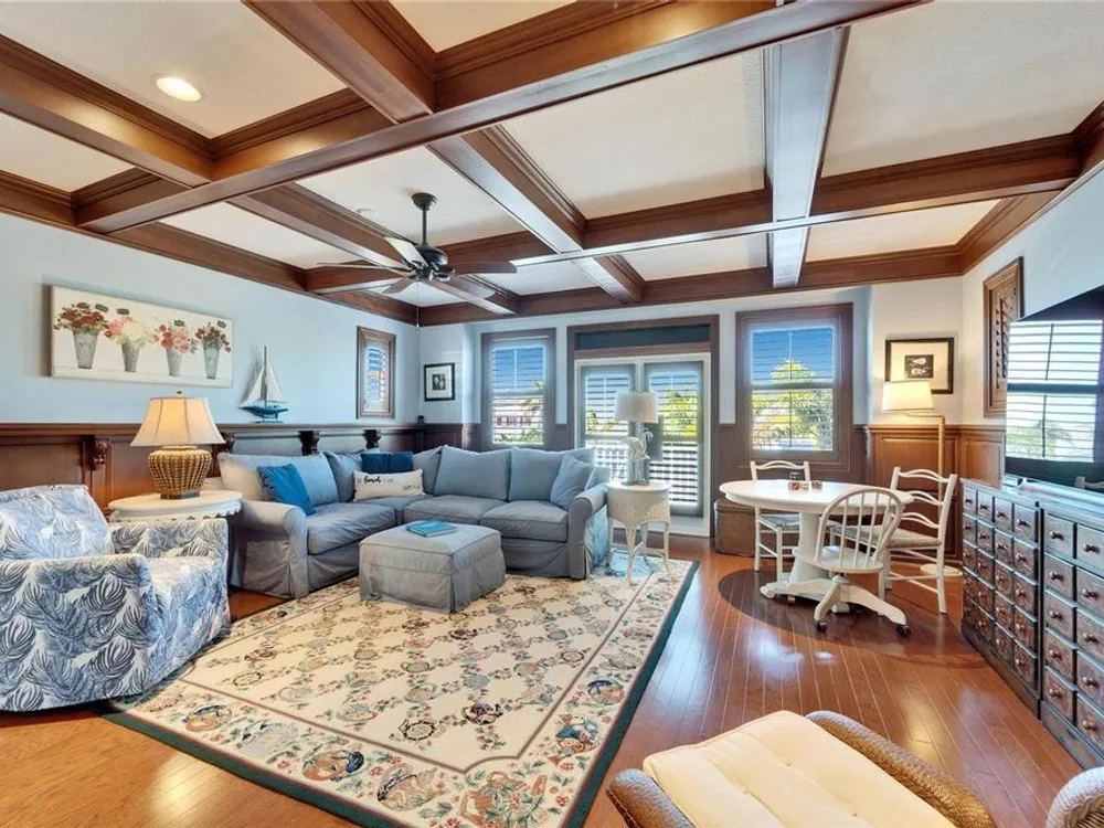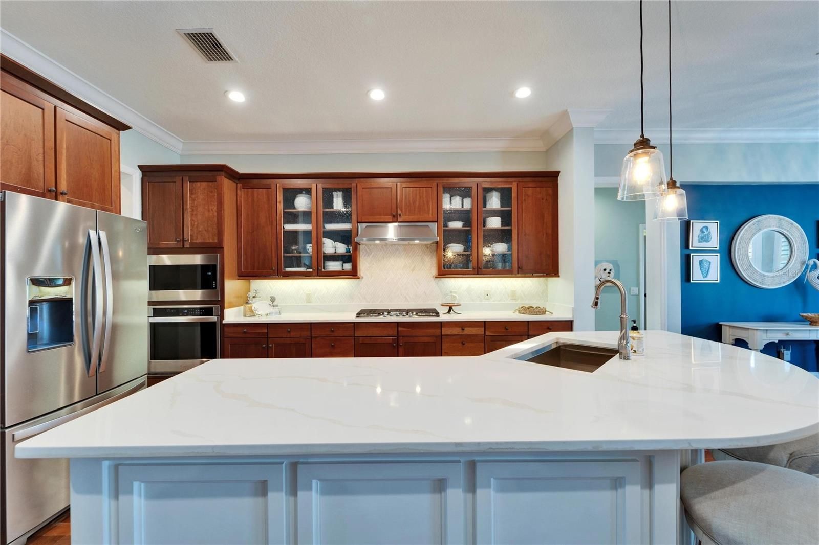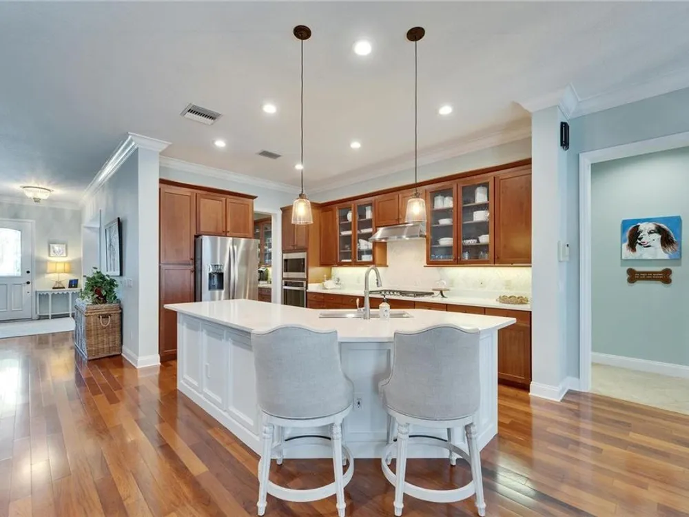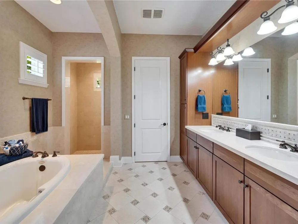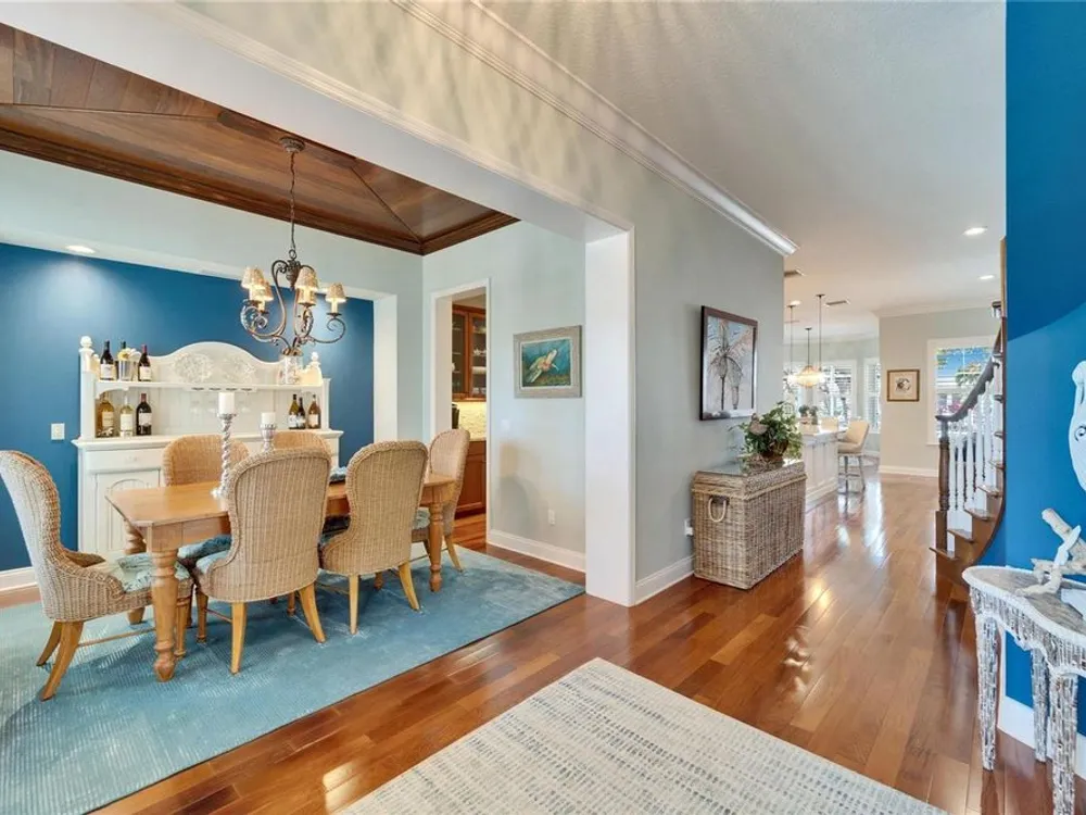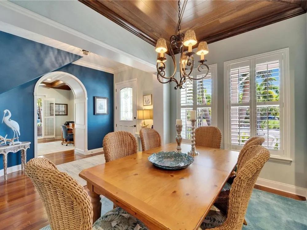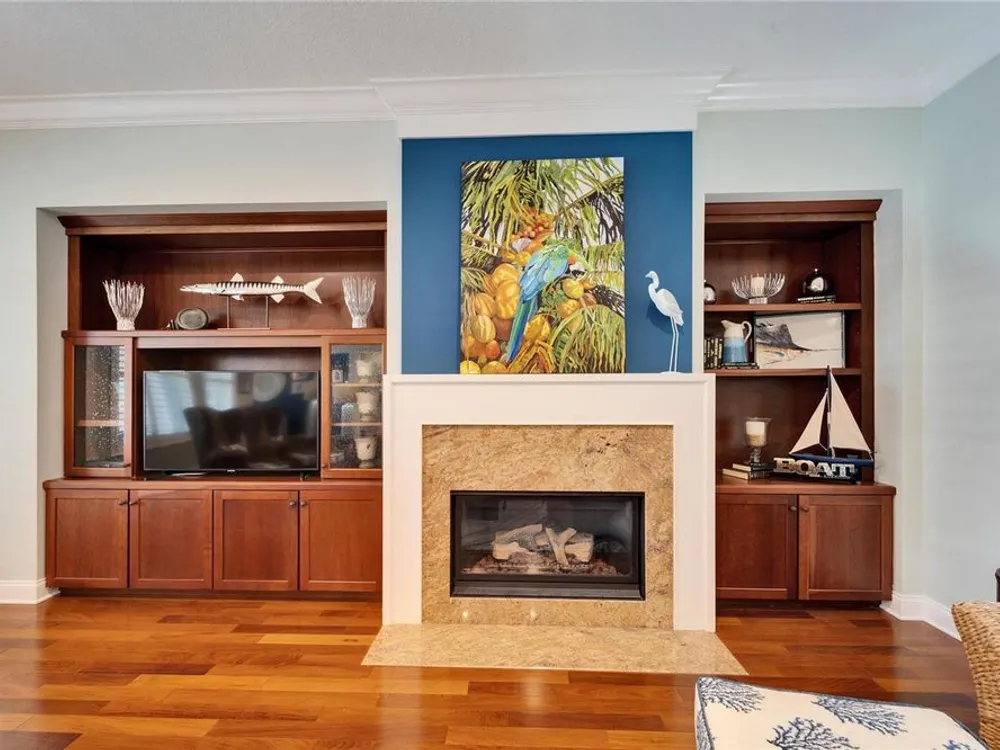 - Built-in Features, Ceiling Fan(s), Coffered Ceiling(s), Crown Molding, Eat-in Kitchen, High Ceilings, Kitchen/Family Room Combo, Open Floorplan, Main Level Primary, Solid-Wood Cabinets, Split Bedrooms, Stone Counters, Thermostat, Tray Ceiling(s), Walk-In Closet(s), Wet Bar, Window Treatments