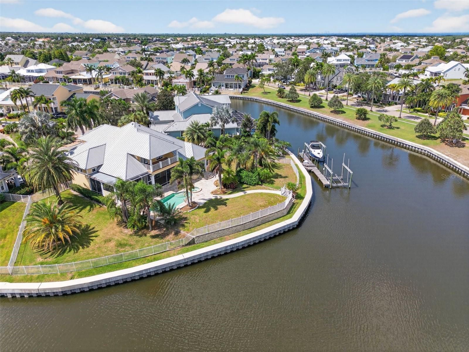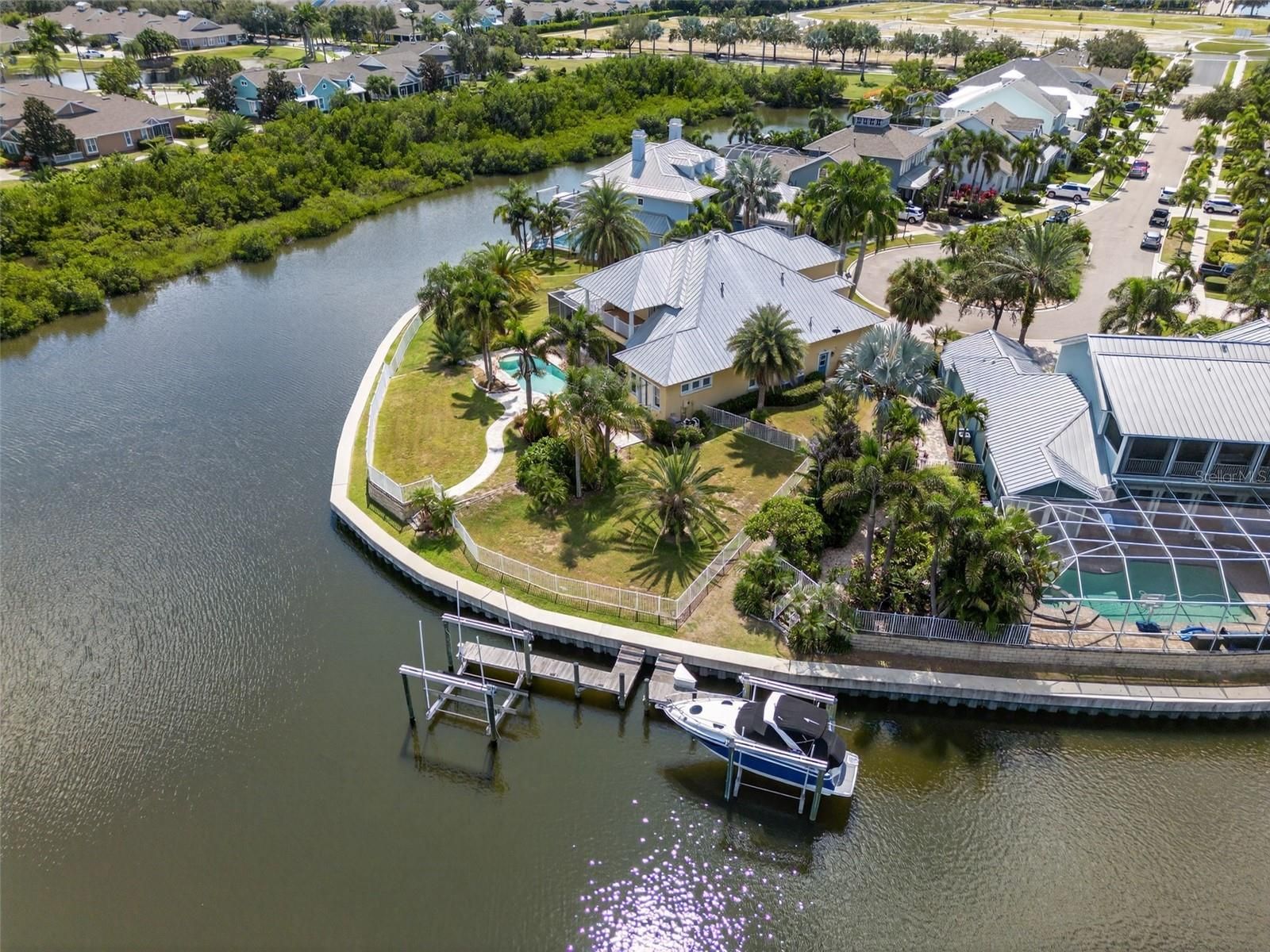 Welcome to your waterfront masterpiece in MiraBay! This custom 4-bedroom, 4-bath home sits on nearly half an acre, with 200 feet of saltwater canal frontage, a newly improved seawall, deeded dock, & boat lift — perfect for boating enthusiasts with unobstructed access to Tampa Bay. Step inside to over 3,900 sq ft of thoughtfully designed living space with an open floor plan. Highlights include a formal dining room, den/office, large family room, loft/bonus room, and a gourmet kitchen with granite counters, high-end built-ins, pot filler over the range, and stainless appliances. The primary bedroom is conveniently on the main floor. Elegant touches like real wood and distressed tile flooring, crown molding, tray ceilings, French doors, built-in bookcases, and high ceilings throughout. Outdoors, a 43-ft screened lanai with travertine flooring, summer kitchen, and serene views of the pool, spa, and canal make this home entertainer’s dream. Relax in the heated gunite pool & spa, enjoy the covered patio or upstairs balcony. The property is southwest-facing, offering beautiful natural light and spectacular golden sunsets. Situated in the award-winning MiraBay community, you’ll enjoy exclusive amenities like a resort-style pool, lagoon marina, fitness center, cafe, tennis & pickleball courts, playgrounds, and more. Located just 30-45 minutes to both Tampa/St. Petersburg and Sarasota/Bradenton — a rare blend of luxury, lifestyle & location.