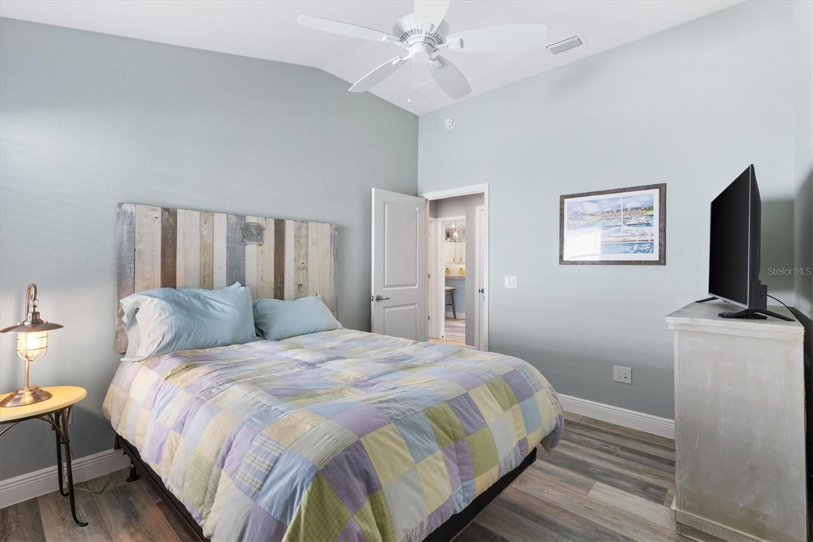 - Cathedral Ceiling(s), Ceiling Fan(s), Eat-in Kitchen, High Ceilings, Kitchen/Family Room Combo, Open Floorplan, Main Level Primary, Solid Surface Counters, Solid-Wood Cabinets, Split Bedrooms, Tray Ceiling(s), Window Treatments