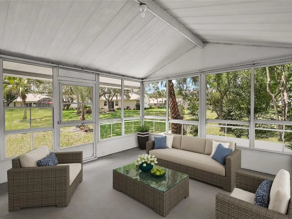One or more photo(s) has been virtually staged. Welcome to easy living in Highland Lakes, a premier 55+ gated community! This beautifully 2-bedroom, 2-bath home is perfectly located just a short walk from the clubhouse. Inside, you'll love the spacious living room, flexible bonus space (ideal for a den or office), and a bright Florida room with peaceful green views—great for relaxing or entertaining. Your kitchen features Corian countertops, plentiful cabinets, a pantry, breakfast bar, and a stylish dark stainless steel refrigerator. The split floor plan offers privacy, with a large primary suite featuring a walk-in closet and ensuite bath with step-in shower. The guest bedroom is comfortable and conveniently located near the second full bath. Additional highlights include: double-pane insulated windows, 2-car garage with utility sink and attic access, and over ¼-acre lot. Enjoy world-class amenities including indoor/outdoor pools, tennis, pickleball, fitness center, softball, shuffleboard, billiards, driving range, and so much more. The expansive clubhouse features a walking track and hosts concerts, dinners, plays, and social events. You'll also find a library, craft rooms, woodworking shop, and free boat/RV storage. Close to shopping, restaurants, healthcare, and major highways—this is the Florida lifestyle you’ve been waiting for!
