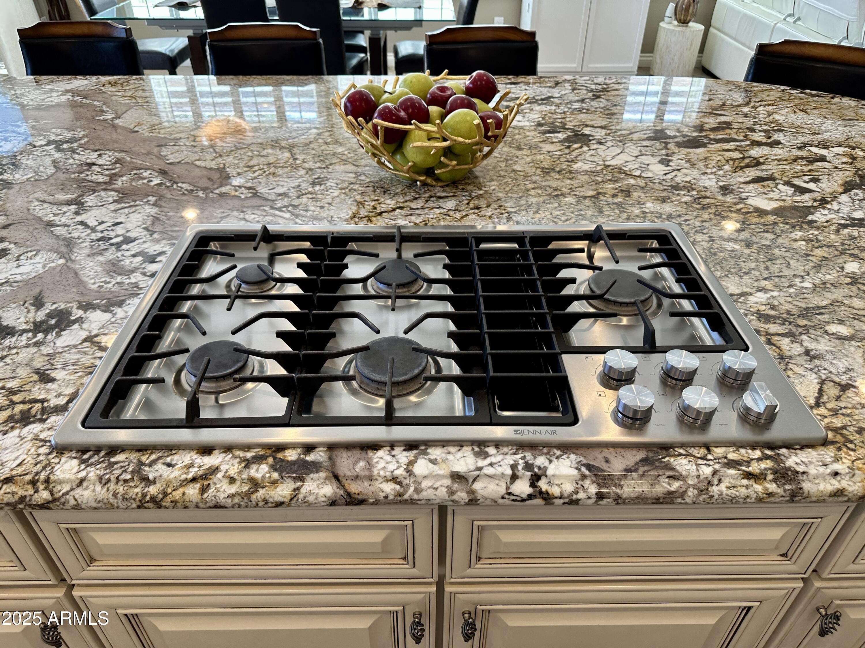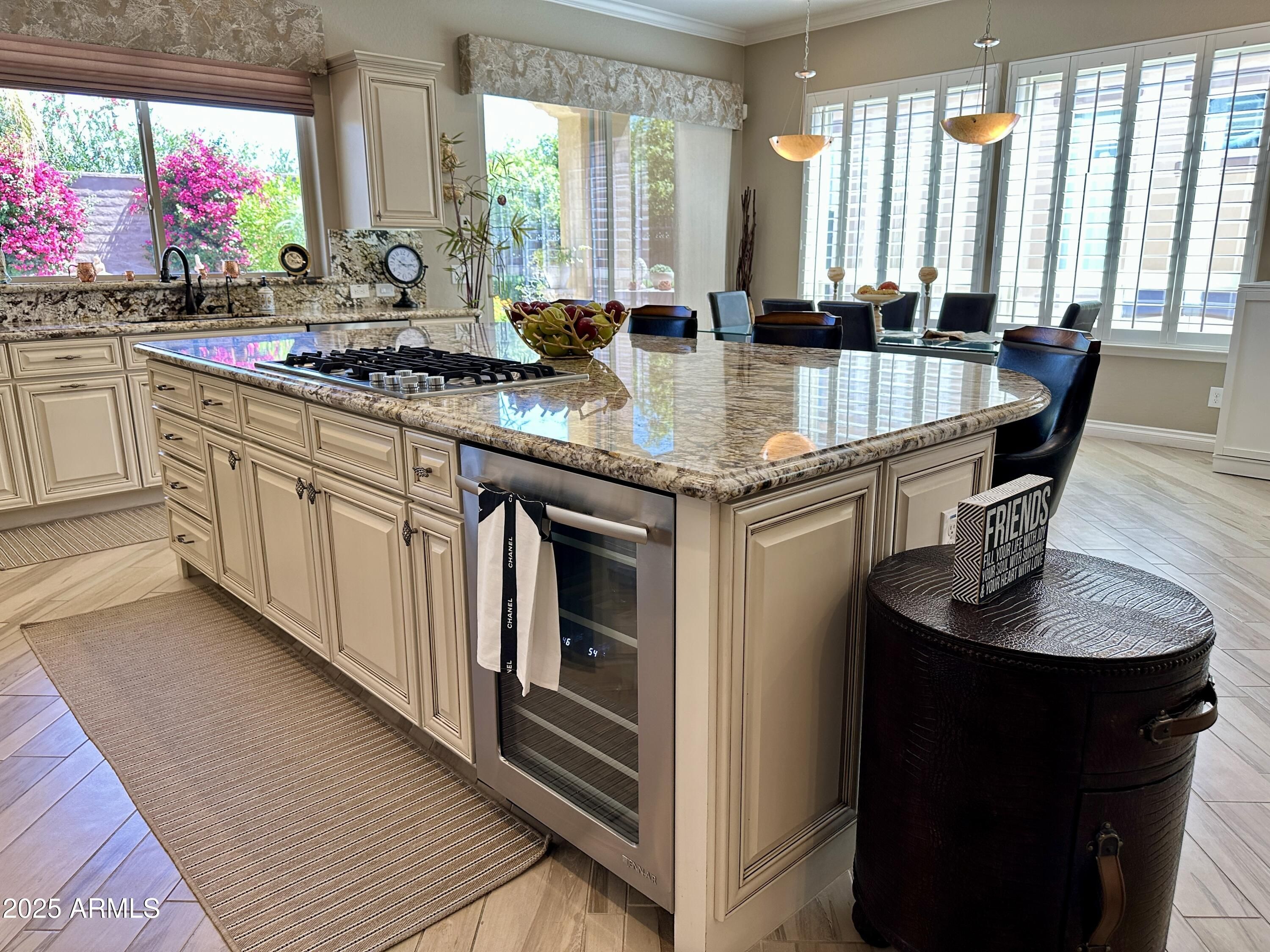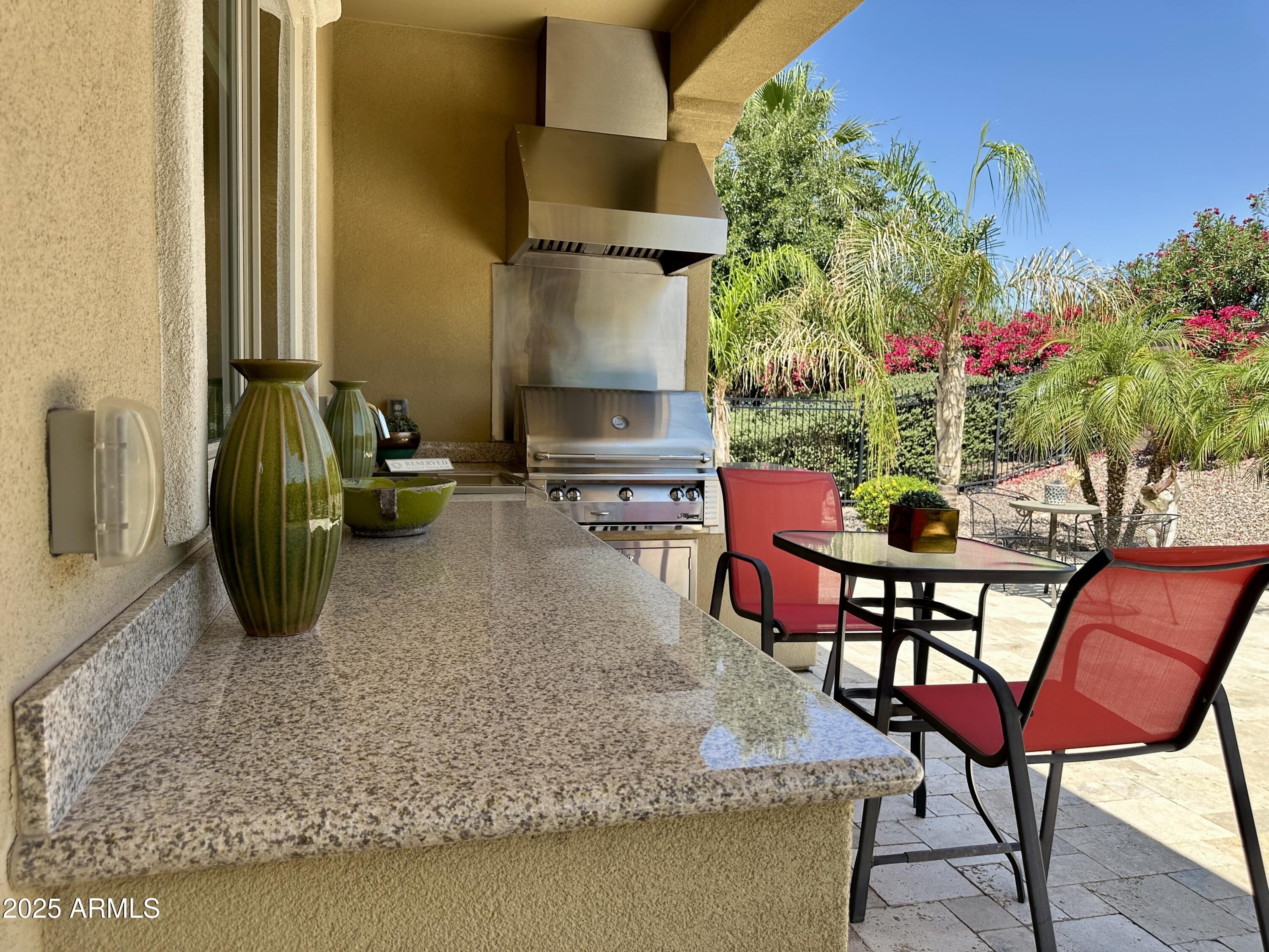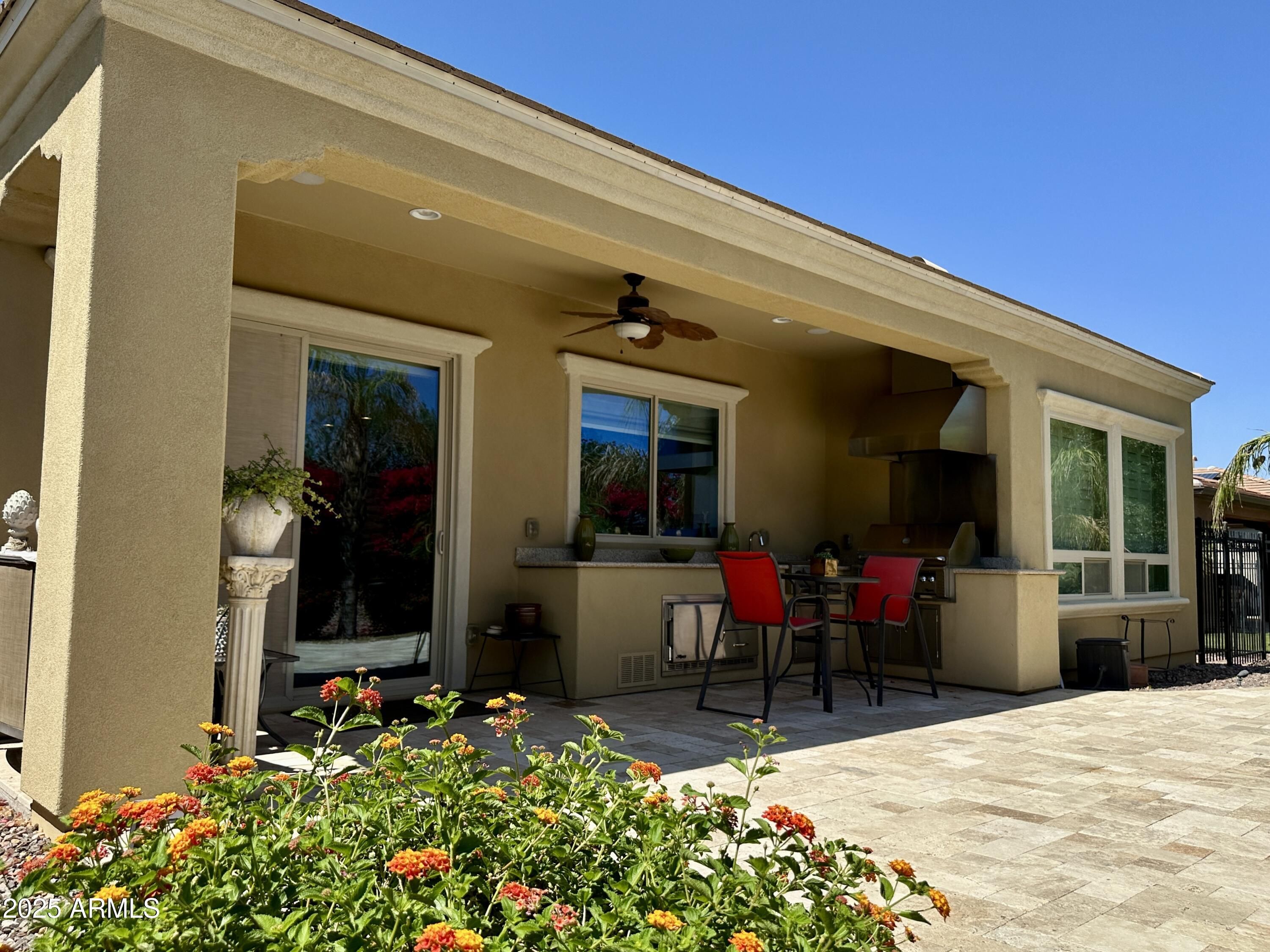 Quite possibly the most upgraded home in the Trilogy 55+ area of Encanterra. With over 2, 100 sq. ft., this 2-bedroom + den, 2.5 bath home features 10ft ceilings, solid-core doors, ceiling trim, paved driveway/walkway, custom 60/40 shutters, and upgraded tile create a warm and inviting space. Kitchen features all Jenn-Air appliances: built-in frig plus island wine frig, wall ovens, granite counter and backsplash, The spacious laundry room doubles as a convenient home office with built-in cabinetry. Private backyard retreat with travertine pavers, a BBQ island with sink, an Alfresco BBQ/refrigerator/hood, and a fountain with 2 fire pot features. 3rd car garage for your golf cart or toys. Solar city solar system owned, typical bill is under $50/month. Too many upgrades to list.