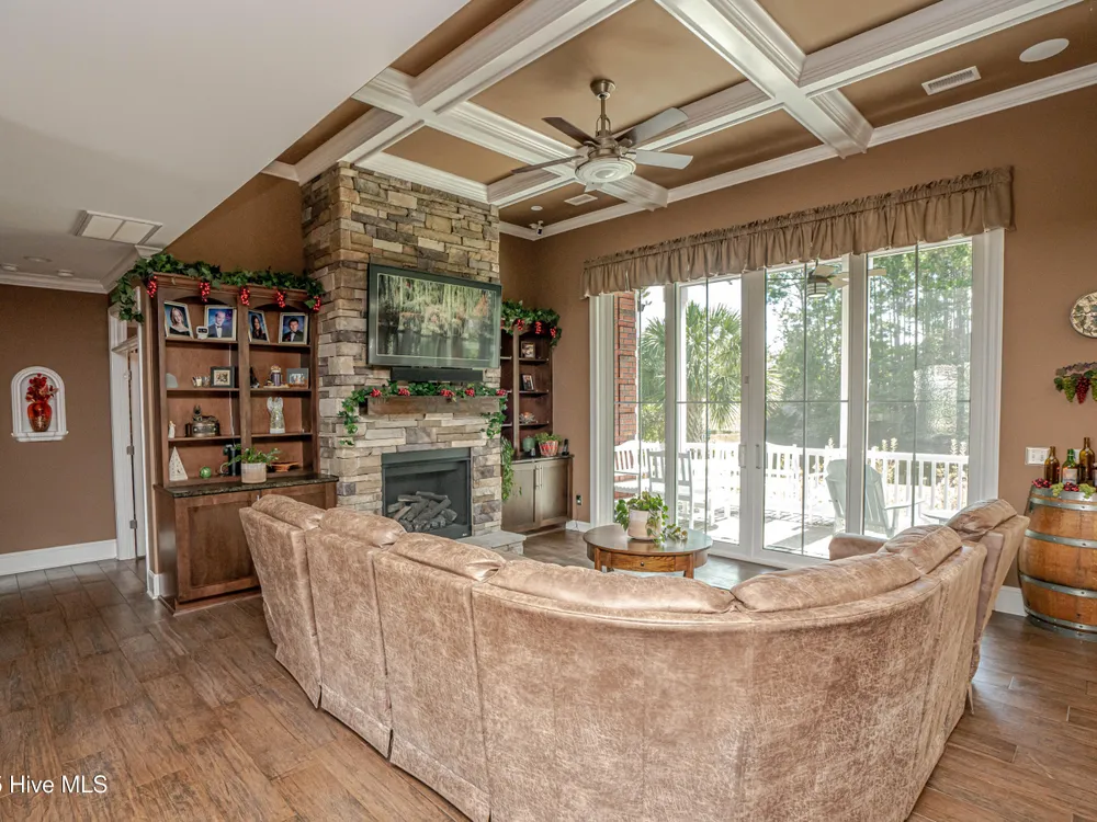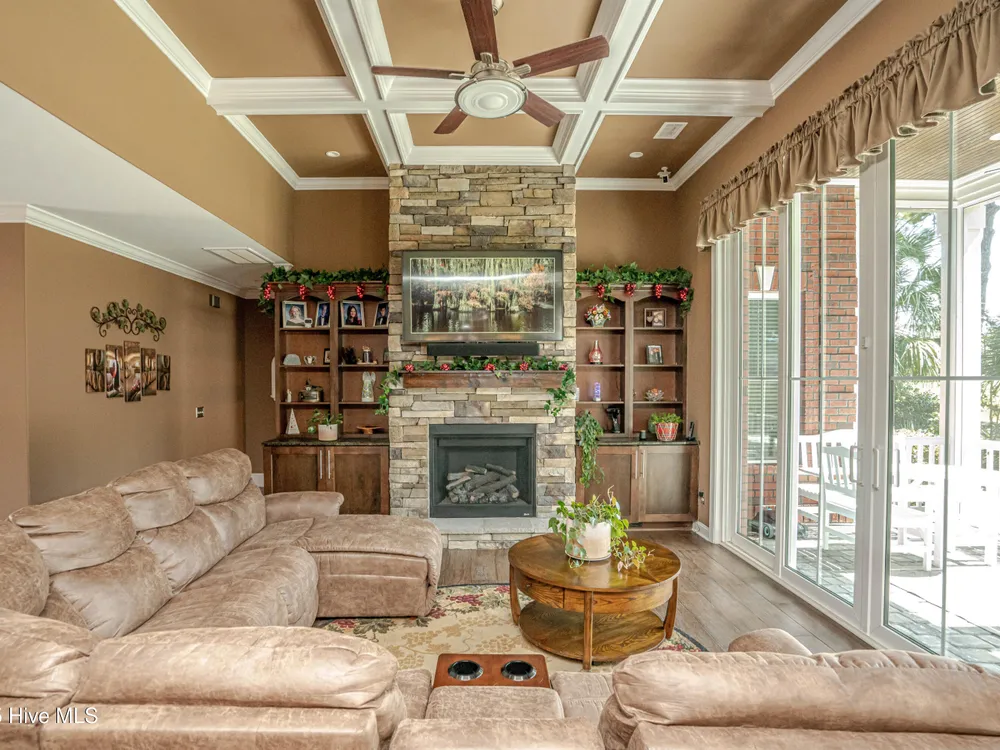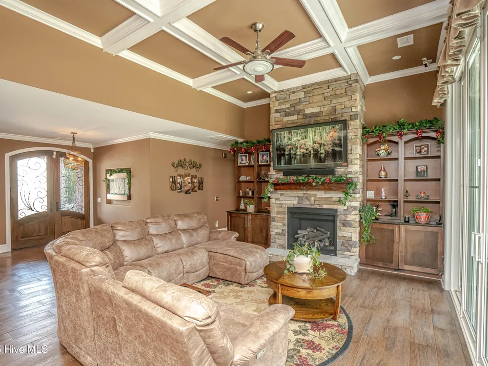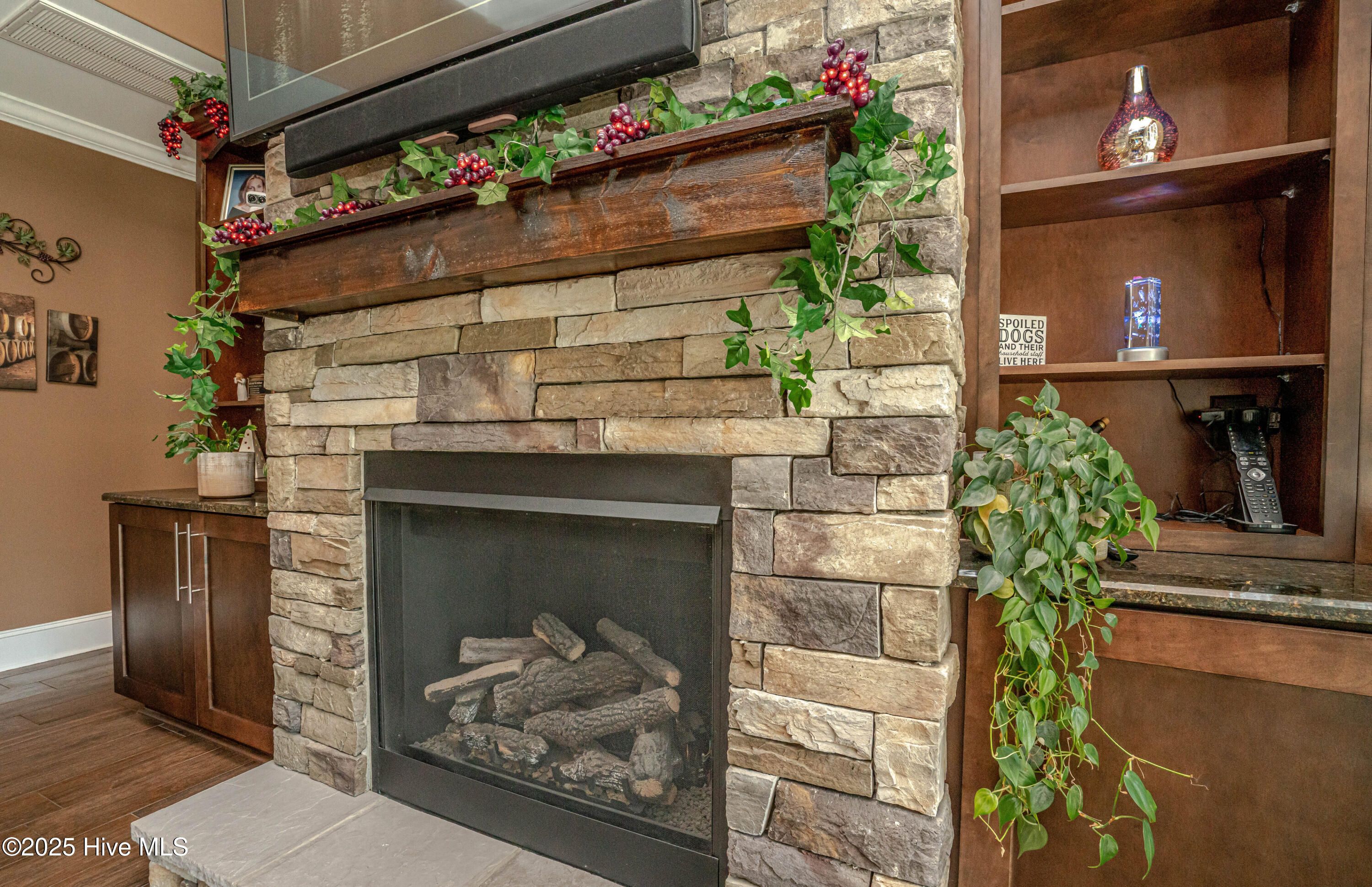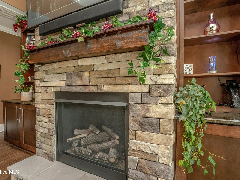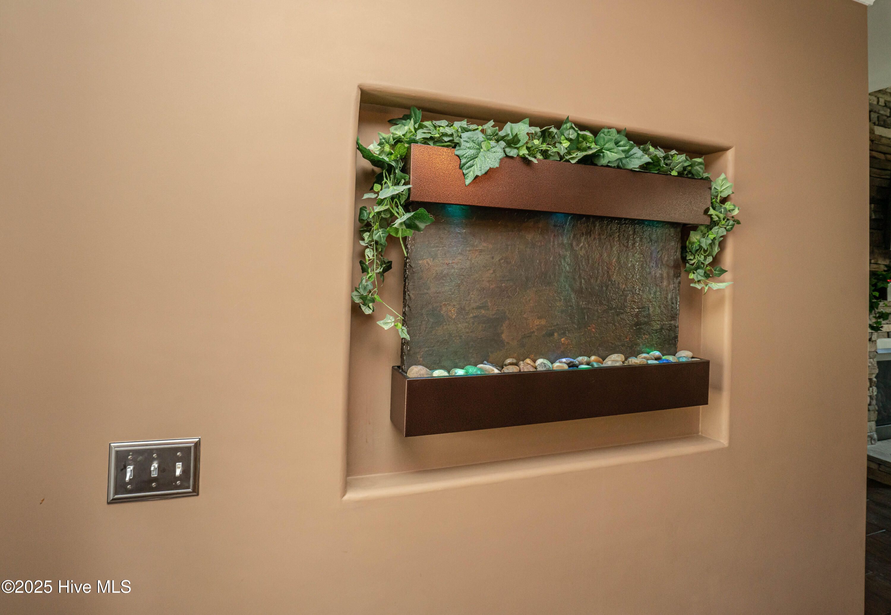 - Blinds/Shades, Solid Surface, Wet Bar, Walk-In Closet(s), Walk-in Shower, Tray Ceiling(s), Sound System, Entrance Foyer, Pantry, Mud Room, Master Downstairs, Kitchen Island, High Ceilings, Generator Plug, Gas Log, Ceiling Fan(s), Bookcases