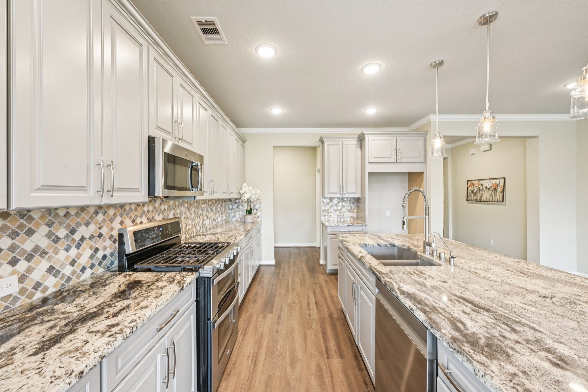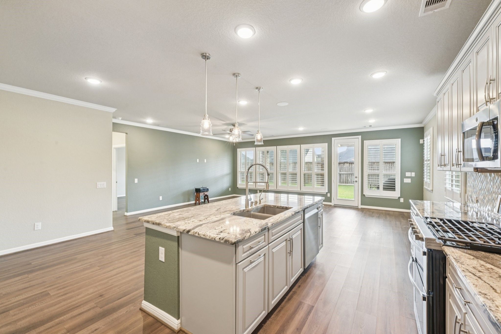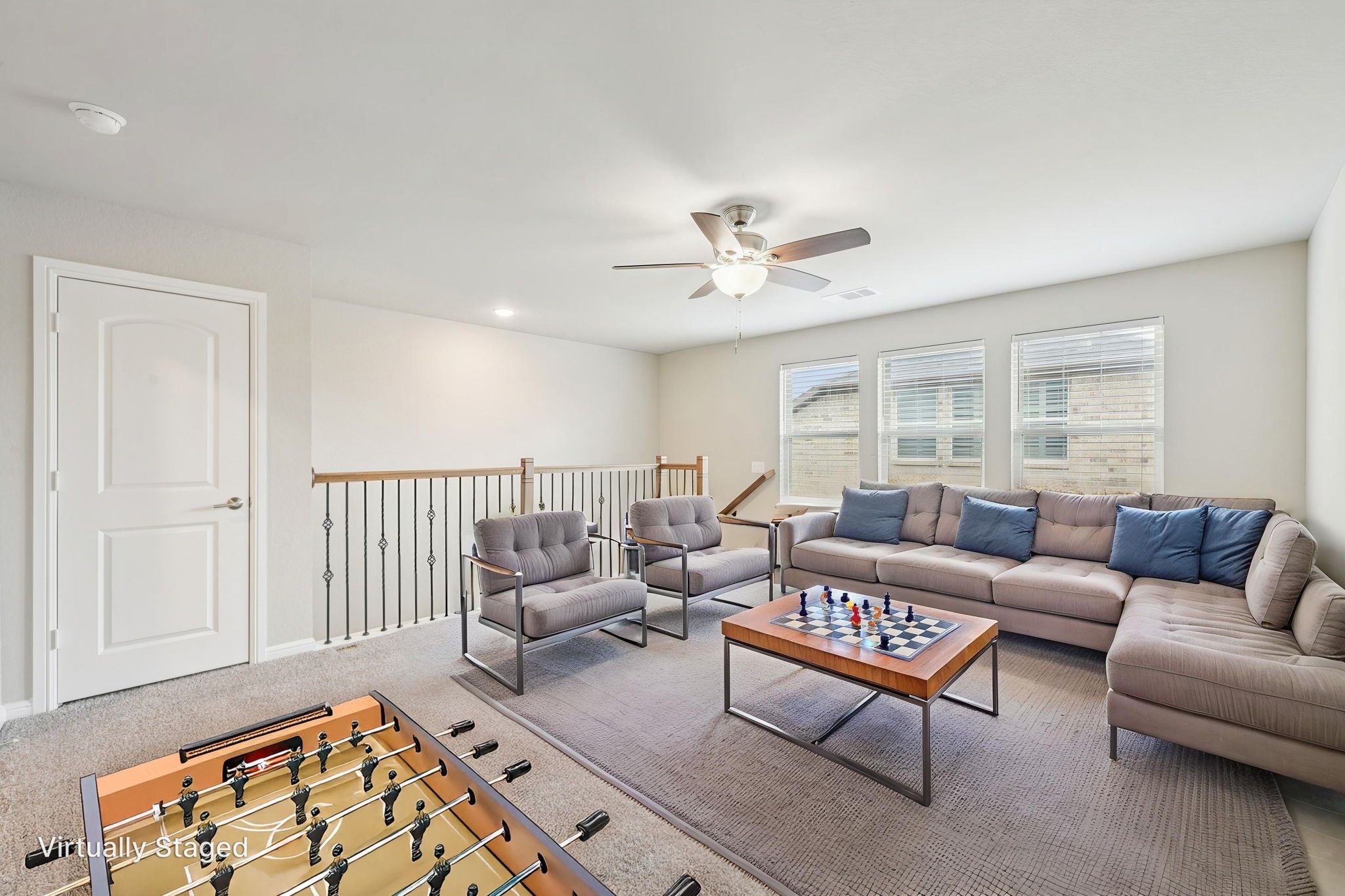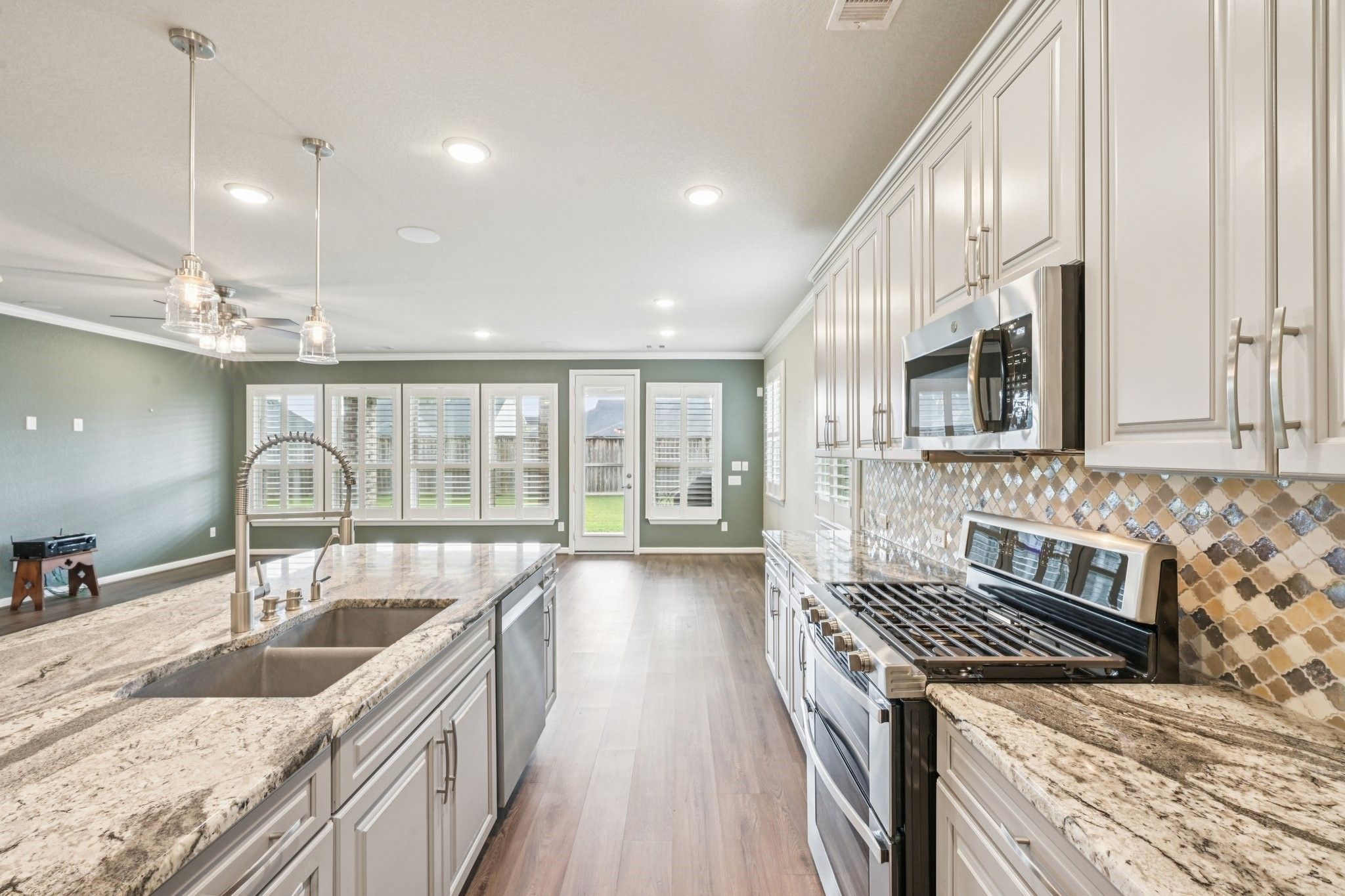 This beautiful home features a 4-sided brick & stone exterior, w/ an open floorplan of Kitchen, dinng and living room. Relax in the backyard w/ covered patio & ceiling fans. This charming home has 3 beds/3 baths, & a oversized 3-car garage & a drop zone, which is great for unloading your groceries. There are many upgrades to this DOVETAIL floor plan, such as: Plantation Shutters, Luxury Vinyl Flooring, Surround sound. The kitchen has a double gas oven & cook top, granite countertops, butlers ' pantry & walk-in Pantry. The Primary Bedrm features a bay window bath has double sinks, w/ lots of closets & storage. The 2nd bed/bath, study & laundry room are down, & over 2000 sqft. Upstairs has 771 sqft, including: a gameroom, 3rd bed/bath with lots of closets for hobbies or holiday storage. Perfect for your overnight guests and grandchildren when they visit. LISTING AGENTS: LIVES IN BONTERRA CALL WITH ANY QUESTIONS YOU MAY HAVE 361-947-5376 PLEASE LEAVE A CARD AND PROVIDE FEEDBACK!!!