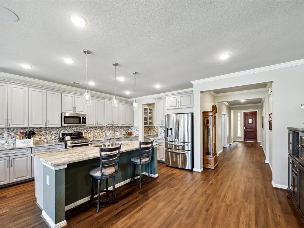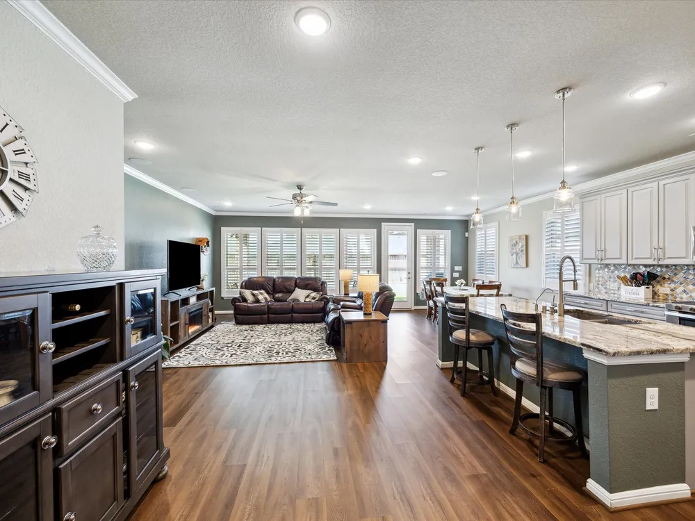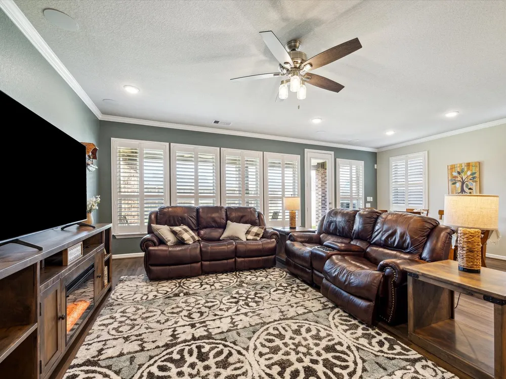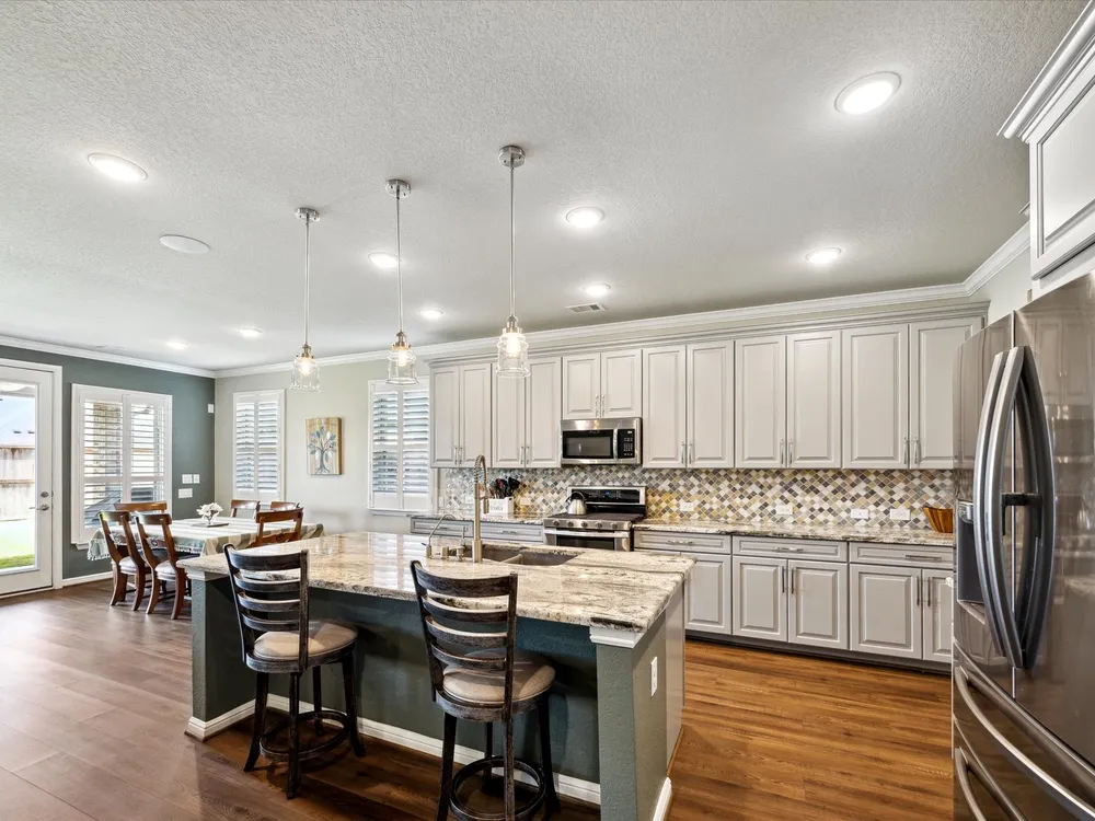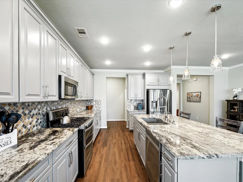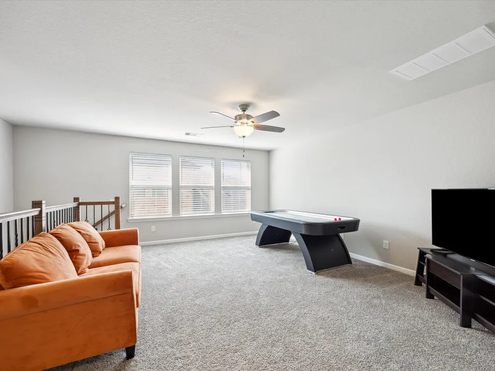 This home is situated on a quiet cul-de-sac street. Featuring a 4-sided brick & stone entryway, includes a covered patio, 3 bedrms, 3 baths, 3 car garage w/ a workbench & drop zone as you enter from the garage. All this with over 2,000 sq ft downstairs. This grand entryway flows into the open concept of Living, Dining, & kitchen area, which includes a breakfast bar, butler's pantry, granite countertops, gas cooktop & stove. The oversized primary bedroom features a bay window. The Primary bath has double vanities, walk-in closets & a huge walk-in shower. The 2-bedrm & bath, home office & laundry room are all downstairs. Upstairs boasts over 770 sqft. includes a large gameroom, 3rd bedrm & bath, and tons of storage closets. This makes this home great for entertaining family and friends. The DOVETAIL floor plan has many upgrades: Plantation Shutters, Surround Sound, and Luxury Vinyl Plank Flooring, too many to mention here, so please come view this home yourself today!