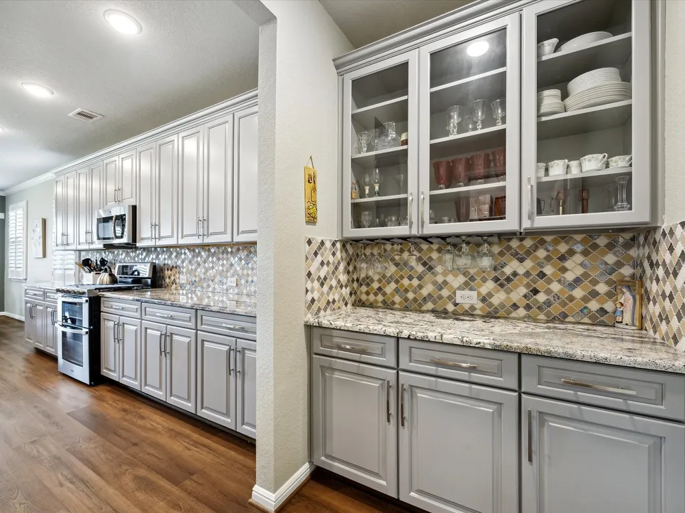 - Breakfast Bar, Butler Pantry, Crown Molding, Dry Bar, Double Vanity, Entrance Foyer, Granite Counters, High Ceilings, Kitchen Island, Kitchen/Family Room Combo, Pantry, Tub Shower, Makeup/Vanity Space, Walk-In Pantry, Wired for Sound, Ceiling Fan(s), Kitchen/Dining Combo