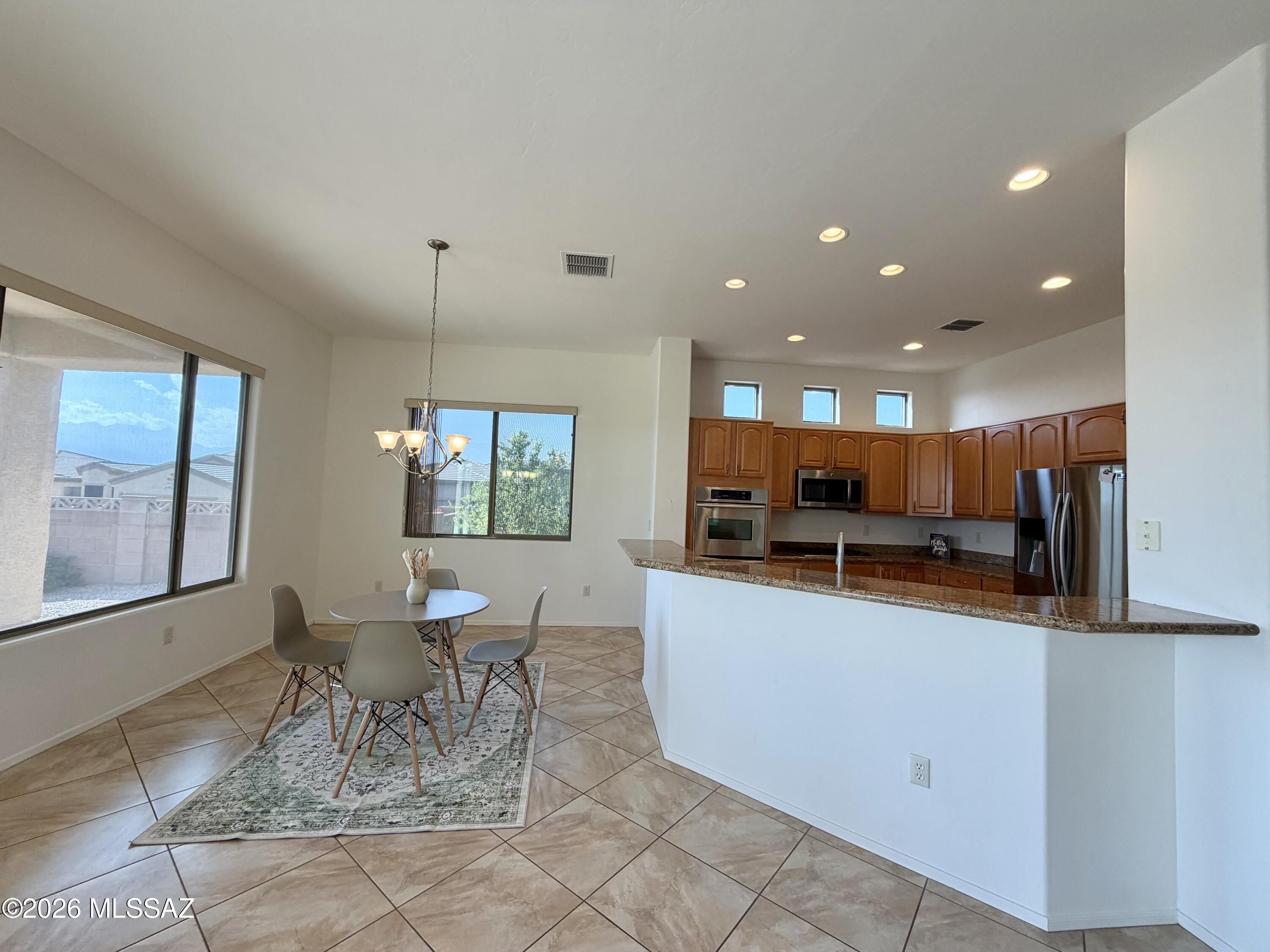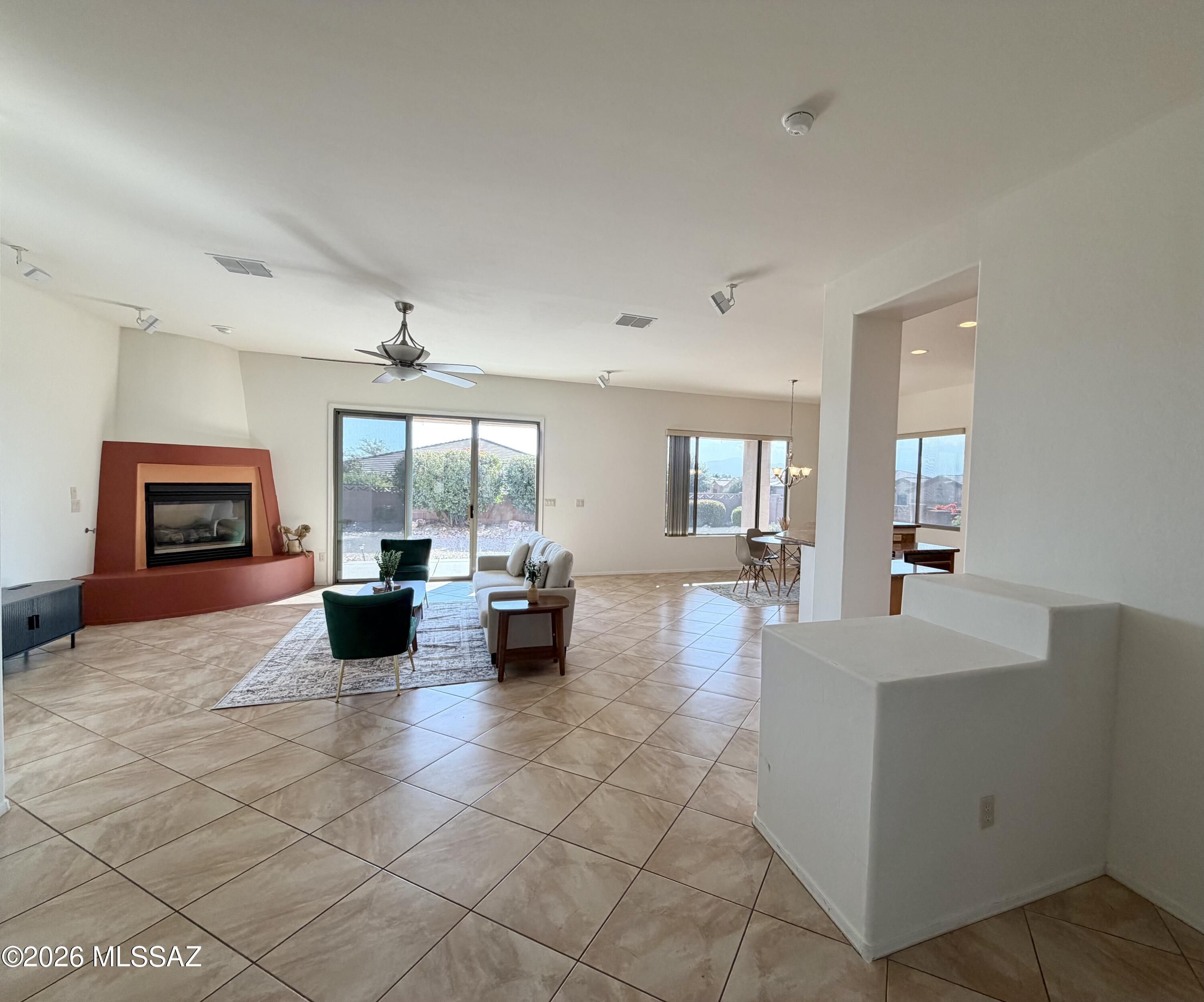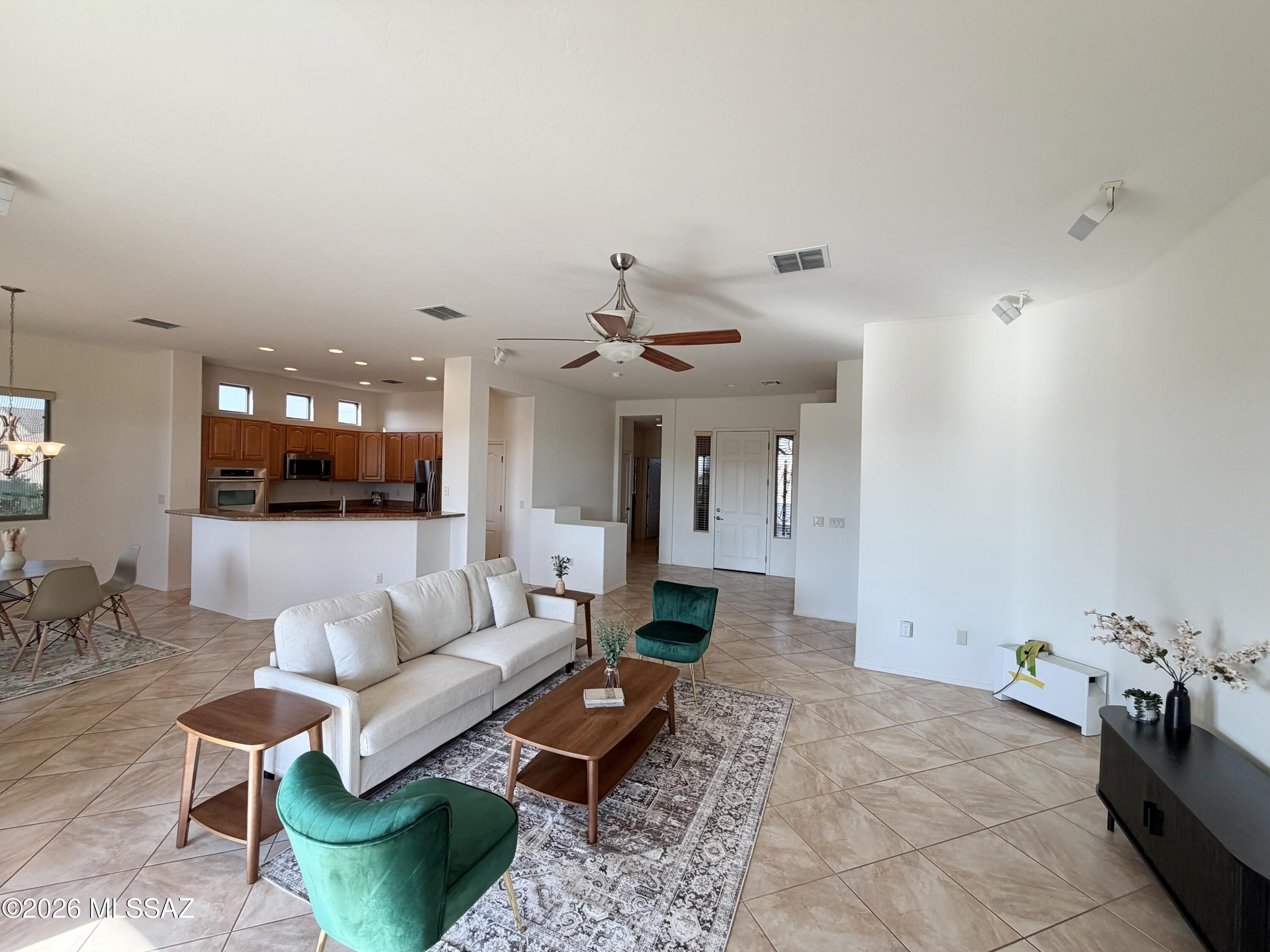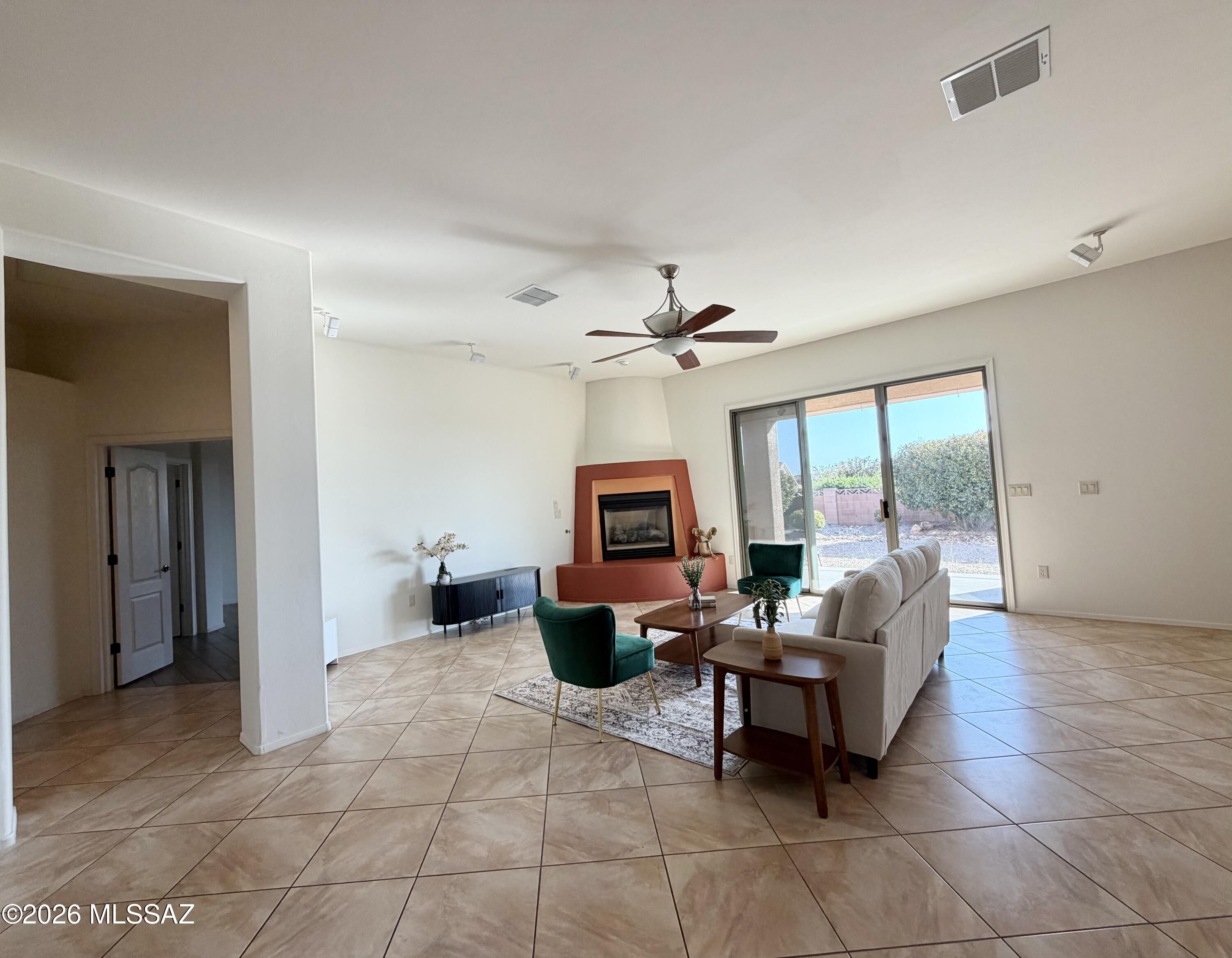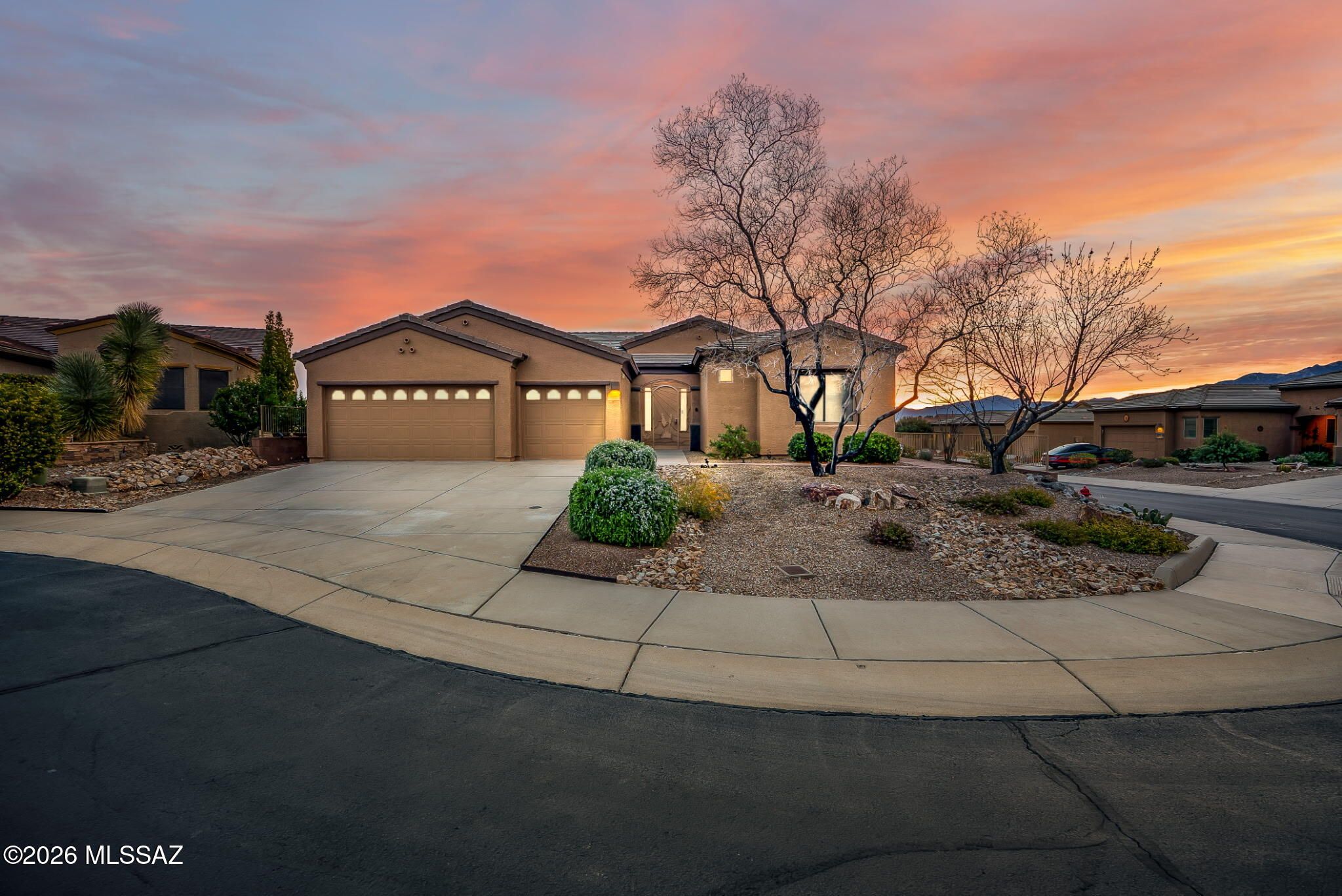 Welcome to 564 N Feke Court, a beautifully maintained home located on a premium corner lot in a cul-de-sac within desirable age-restricted Las Campanas Green Valley community. This 3-bedroom, 2-bath residence features an inviting open-concept floorplan with fresh interior paint and abundant natural light throughout.The gourmet kitchen offers granite countertops, a spacious snack/breakfast bar with seating, stainless steel refrigerator, dishwasher, built-in microwave, double ovens, and a stainless steel gas cooktop. It is perfect for everyday living and entertaining. The kitchen flows seamlessly into the great room, highlighted by a cozy gas fireplace and views of the backyard and surrounding mountains.