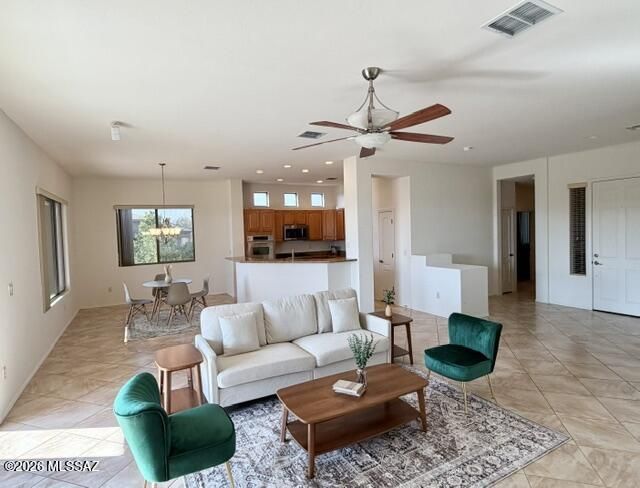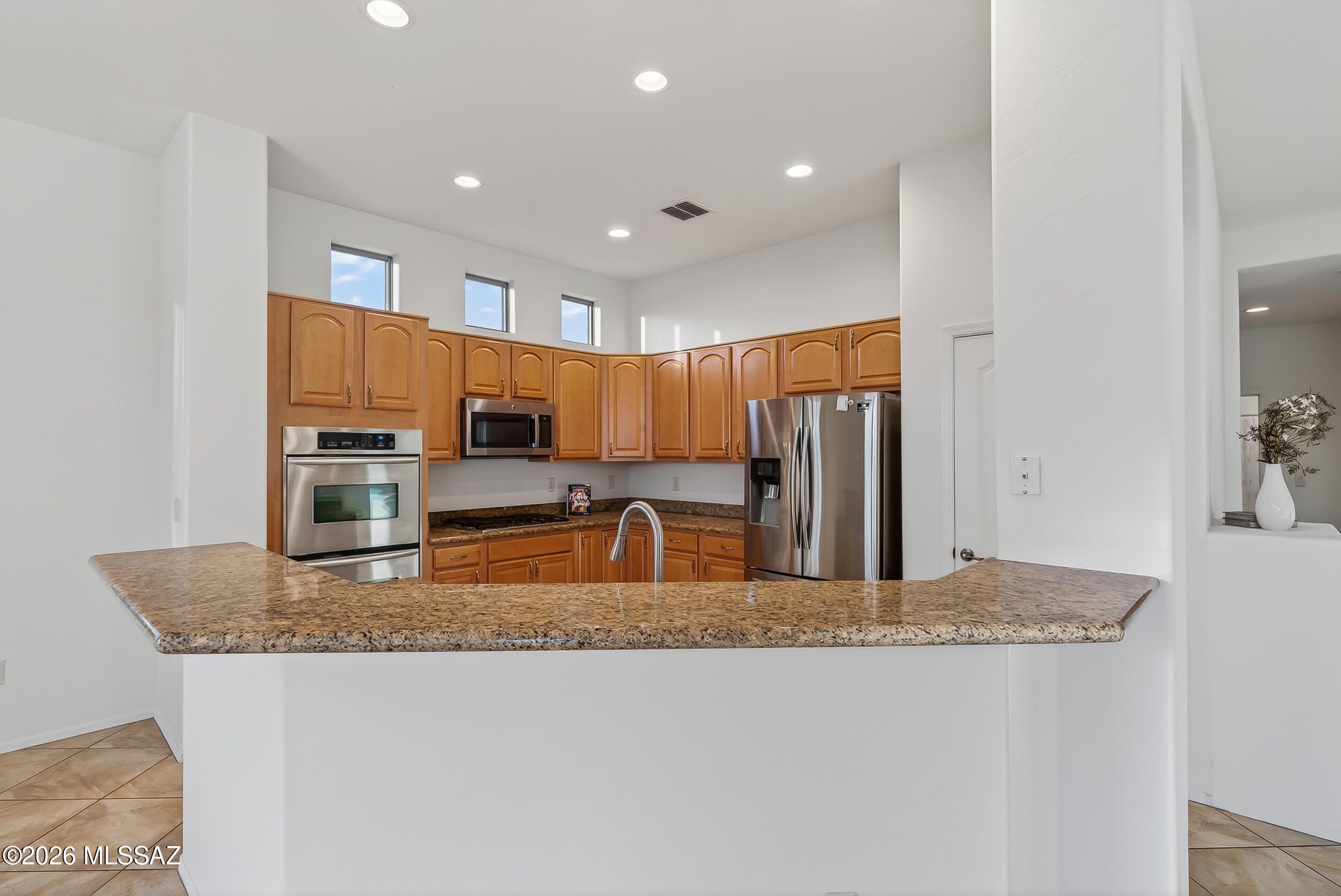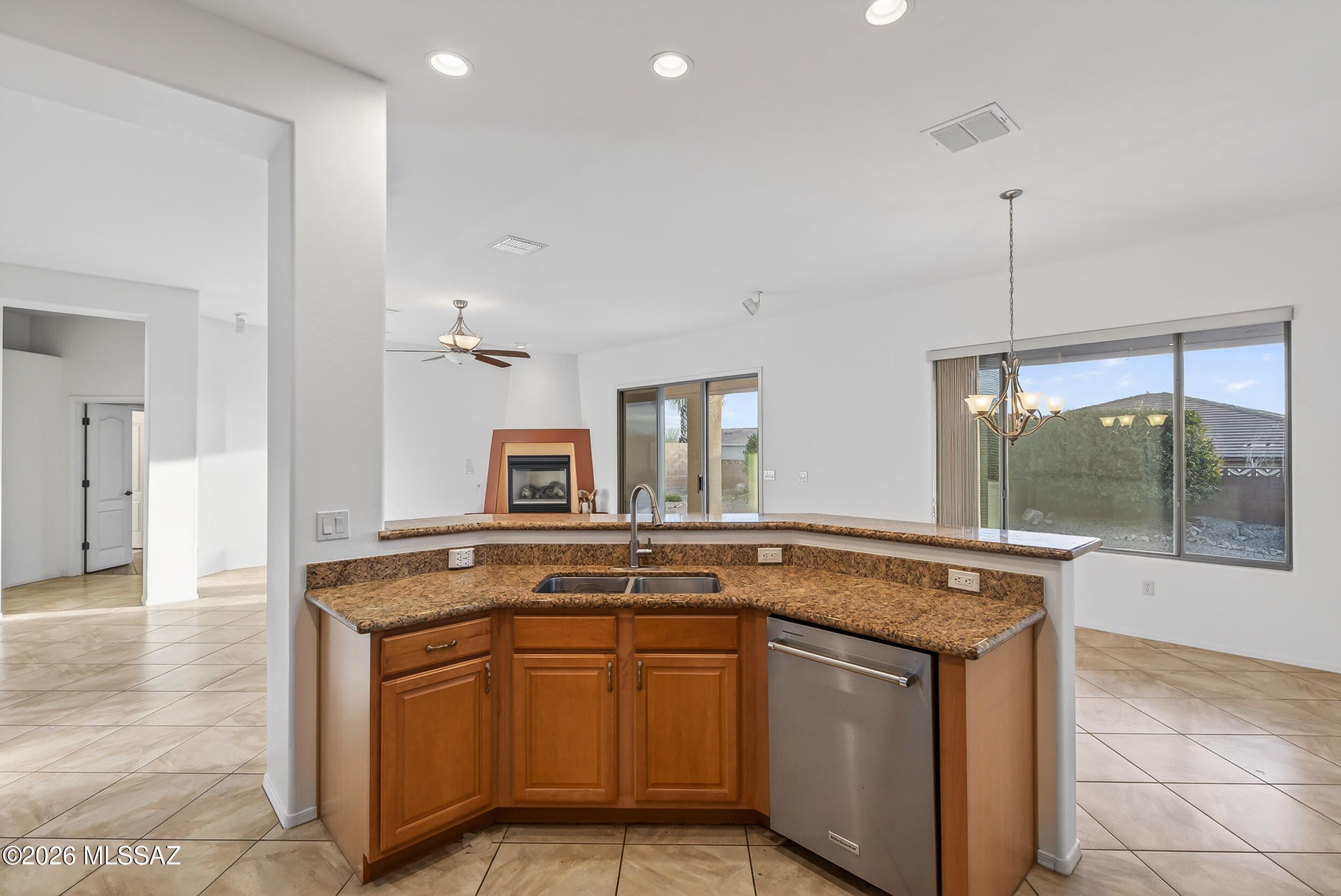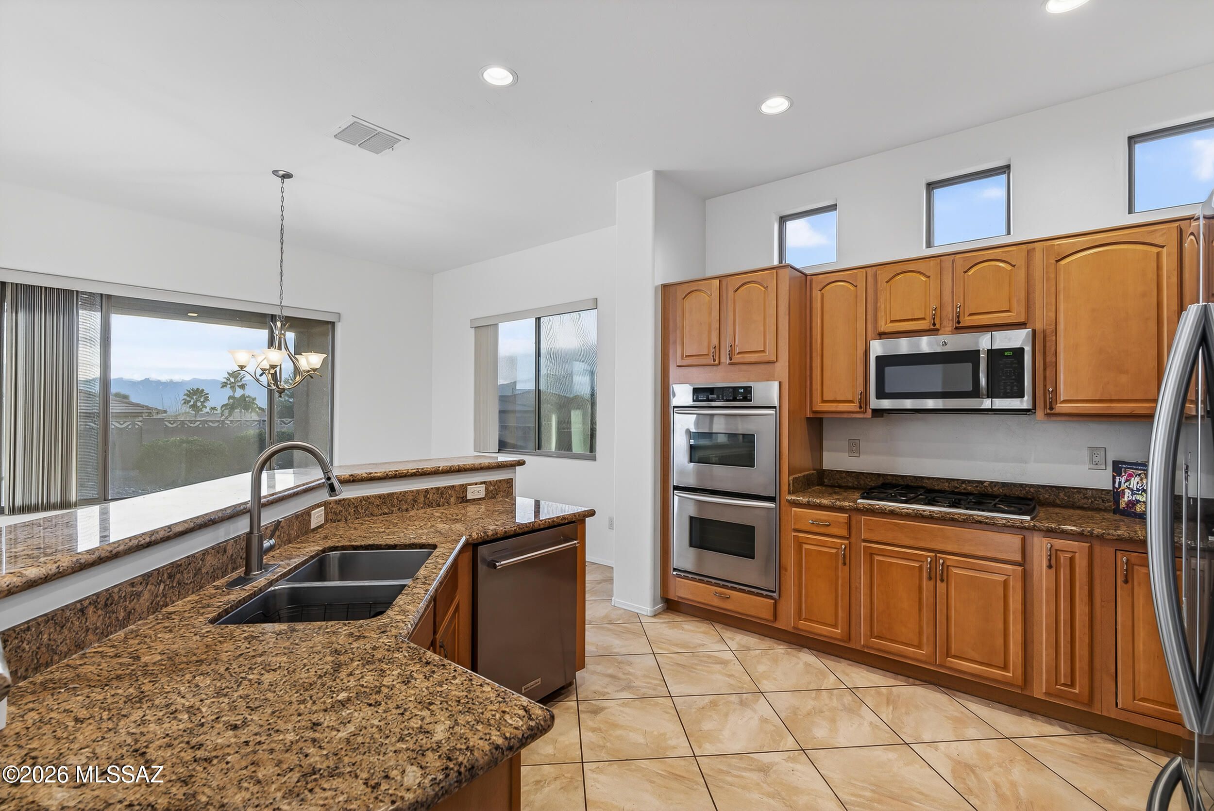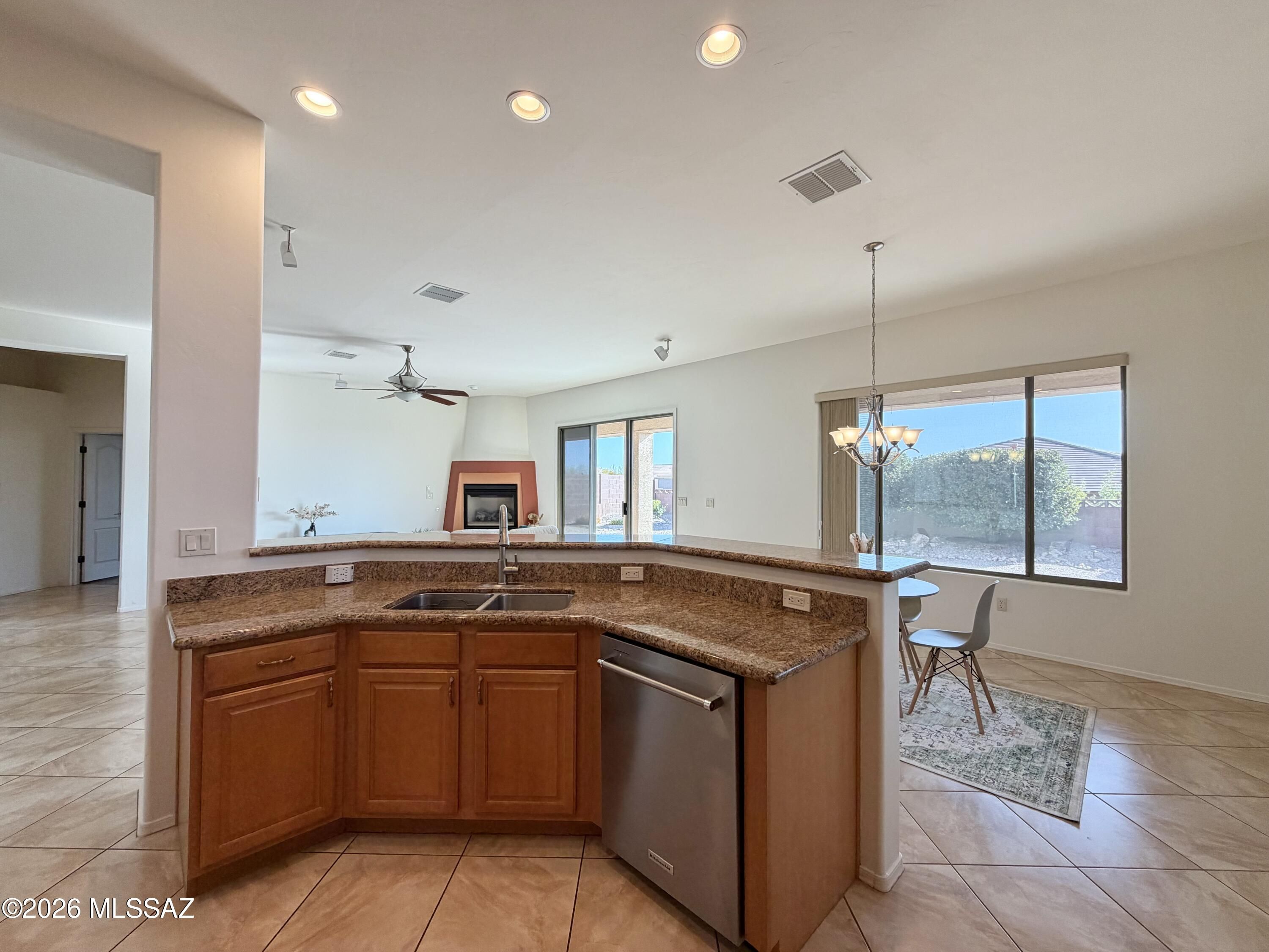 Welcome to 564 N Feke Court, a beautifully maintained home located on a premium corner lot in a cul-de-sac within desirable age-restricted Las Campanas Green Valley community. This 3-bedroom, 2-bath residence features an inviting open-concept floorplan with fresh interior paint and abundant natural light throughout.The gourmet kitchen offers granite countertops, a spacious snack/breakfast bar with seating, stainless steel refrigerator, dishwasher, built-in microwave, double ovens, and a stainless steel gas cooktop. It is perfect for everyday living and entertaining. The kitchen flows seamlessly into the great room, highlighted by a cozy gas fireplace and views of the backyard and surrounding mountains.