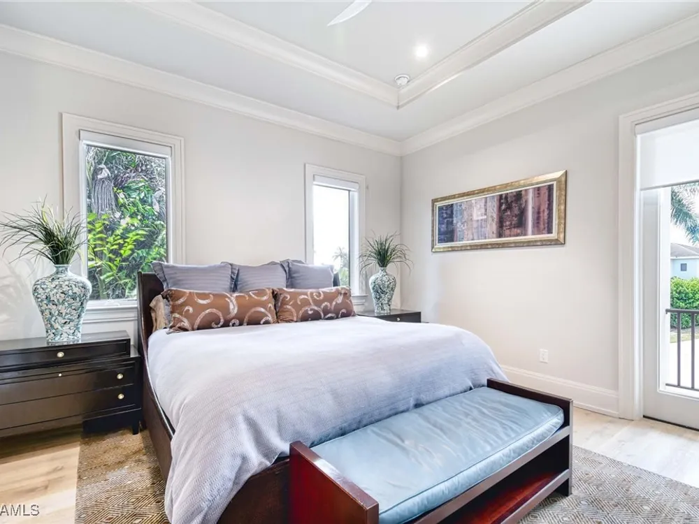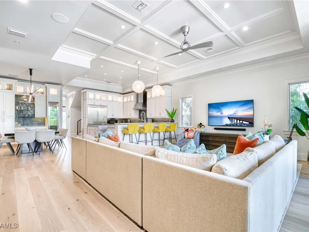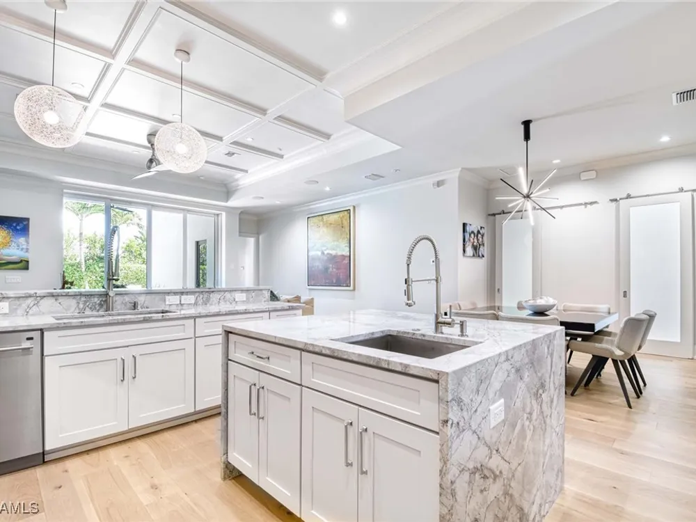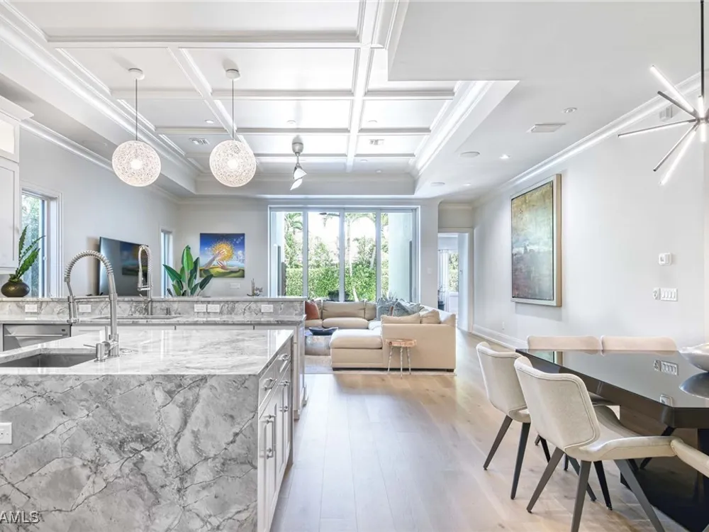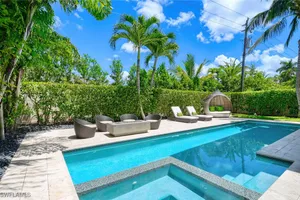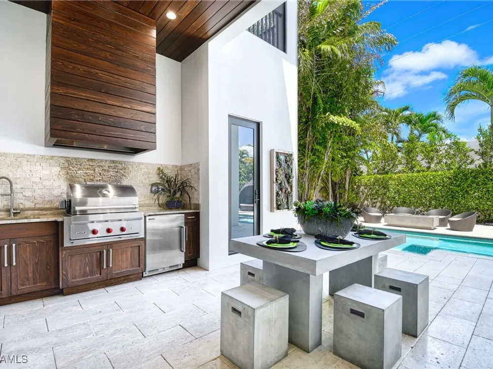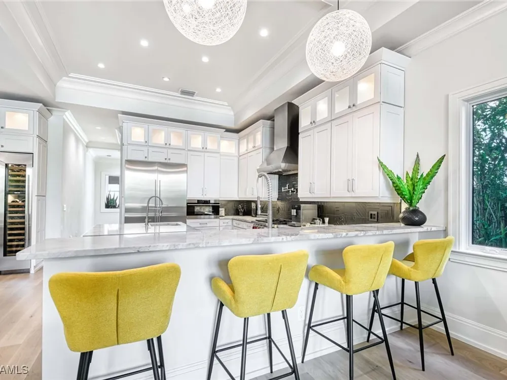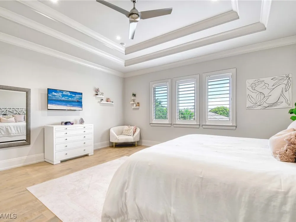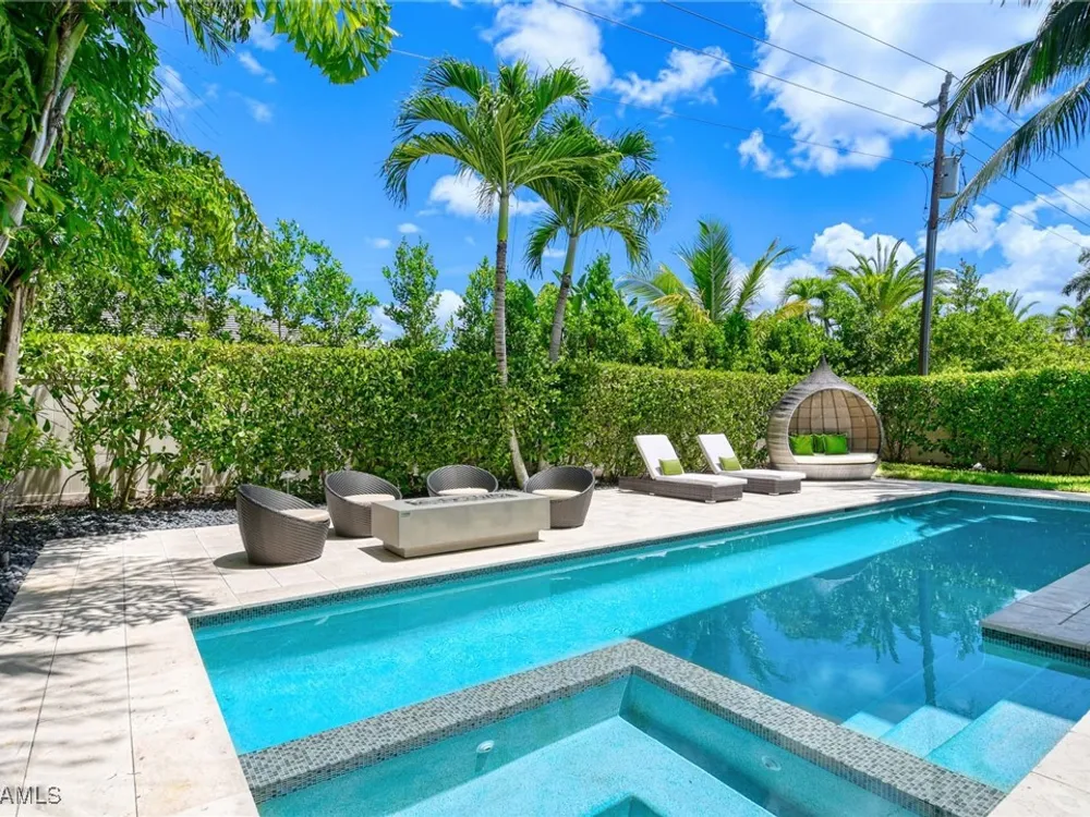 Experience the ultimate Naples lifestyle in this stunning single-family home, ideally positioned on a highly desirable elevated “X500” Flood Zone parcel in the prestigious Moorings neighborhood, just a short walk to the world renowned sugar sand beach. A true value in today’s market, this single-family home offers the benefits of generous living space without the maintenance of an oversized property. Designed with luxury and elegance in mind, every room and every square foot has been thoughtfully planned to maximize comfort and livability. With four en-suite bedrooms and an open, well-balanced layout, the residence delivers a seamless blend of high-end finishes, functionality, and value, an exceptional find in Naples. Built in 2016 and presenting like newer construction, this 4,084 sq. ft. coastal retreat offers four spacious en-suite bedrooms, a powder room, and a pool bath. The open concept main level is designed for entertaining, featuring European wide-plank white oak flooring, high coffered ceilings, custom lighting, and motorized blinds throughout. At the heart of the home, the gourmet kitchen is appointed with Wolf & Sub-Zero appliances, a gas range, quartz countertops, a waterfall island, Emtek hardware, tiled backsplash, and a dual-temperature Sub-Zero wine cooler. Upgrades such as a central vacuum, motorized blinds and a security system add smart convenience. The primary suite is a serene escape with custom walk-in closets and a spa-like bath showcasing teak flooring, double vanities, soaking tub, and a walk-in shower. Upstairs, a family room loft anchors a second primary suite plus two additional guest suites, each with walk-in closets and private baths. A beverage station and screened terrace overlook the resort-style pool. Seamless indoor-outdoor living defines the backyard oasis with a fire pit, gas heated pool and integrated spa lit by vibrant LED lights, a covered lounge lanai with a full summer kitchen, plus a pool accessible bath. The fully fenced yard features landscape lighting that turns evenings magical. As a resident, you’ll have the option to join the Moorings Property Owners Association, granting beach access with exclusive parking, dining pavilion, seating areas, and restrooms. This exceptional property combines contemporary elegance, countless upgrades, and an unmatched location, a perfect opportunity for even the most discerning Naples homebuyer. A must see!