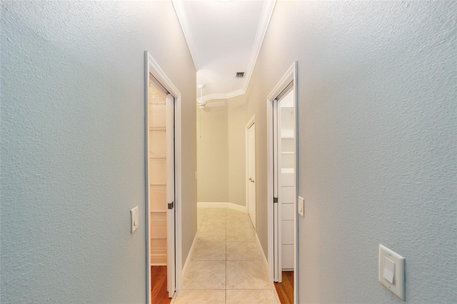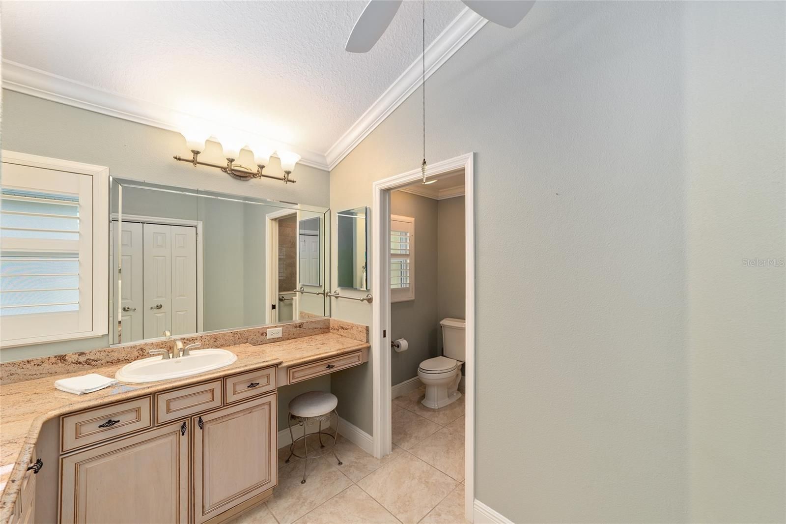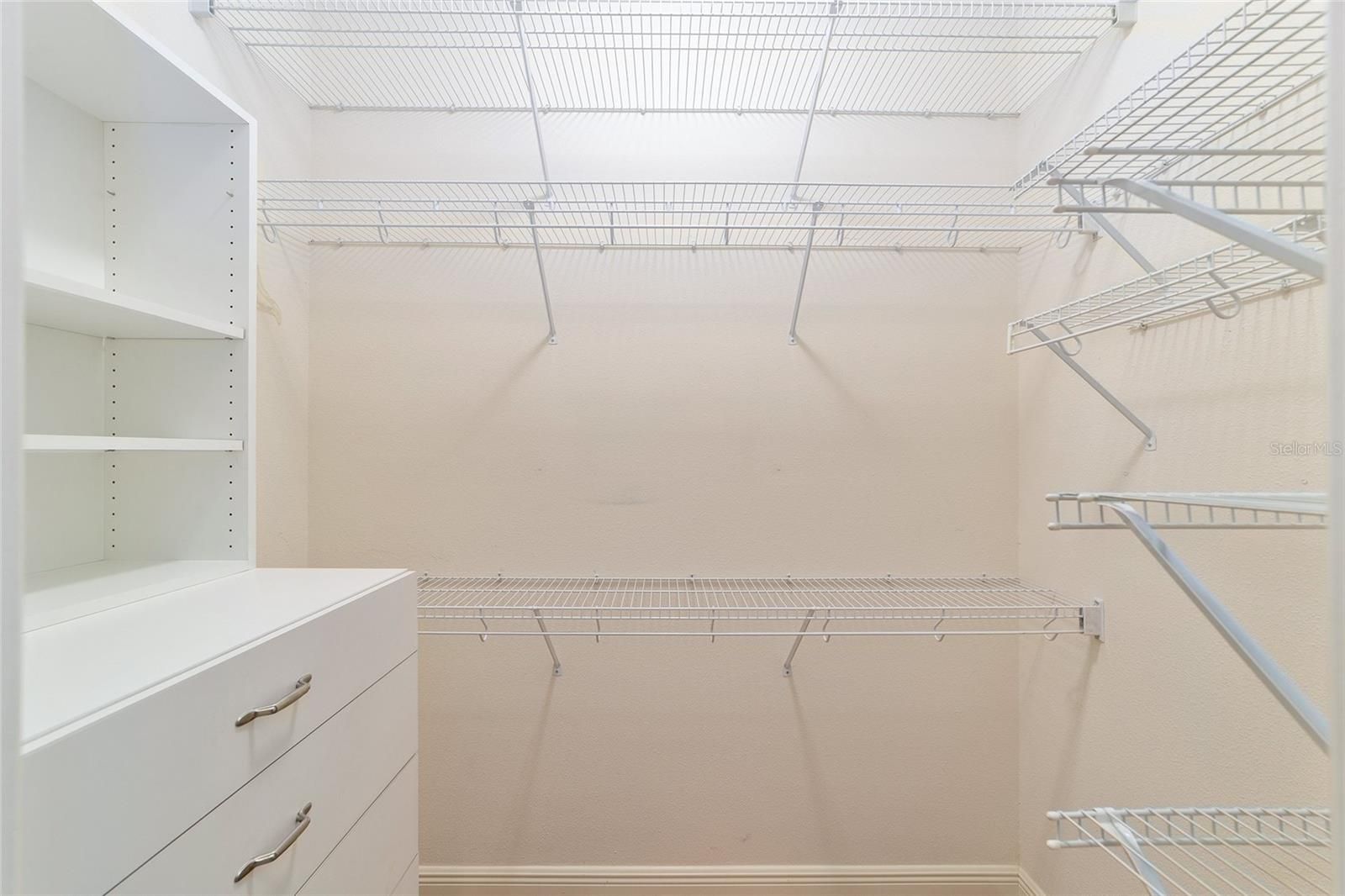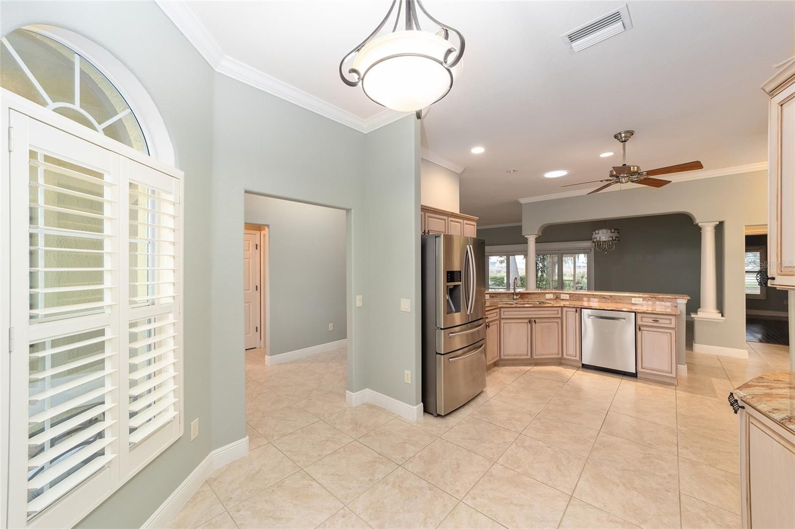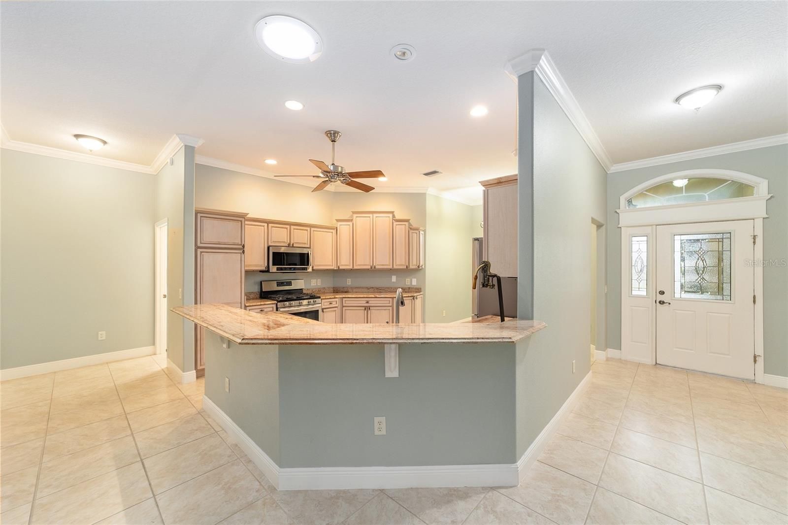 - Ceiling Fan(s), Crown Molding, Eat-in Kitchen, High Ceilings, Living/Dining Room, Open Floorplan, Main Level Primary, Split Bedrooms, Stone Counters, Thermostat, Walk-In Closet(s), Window Treatments