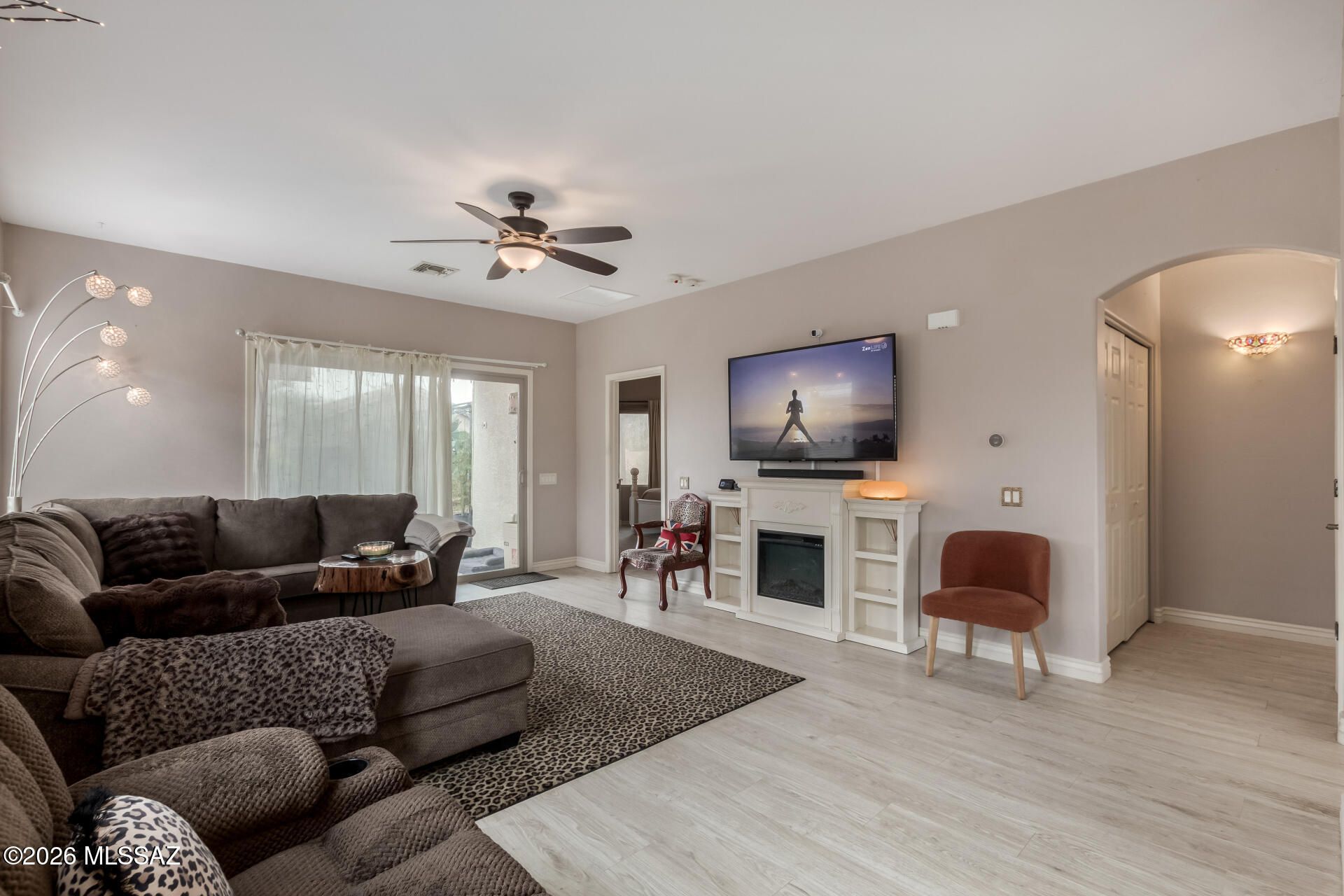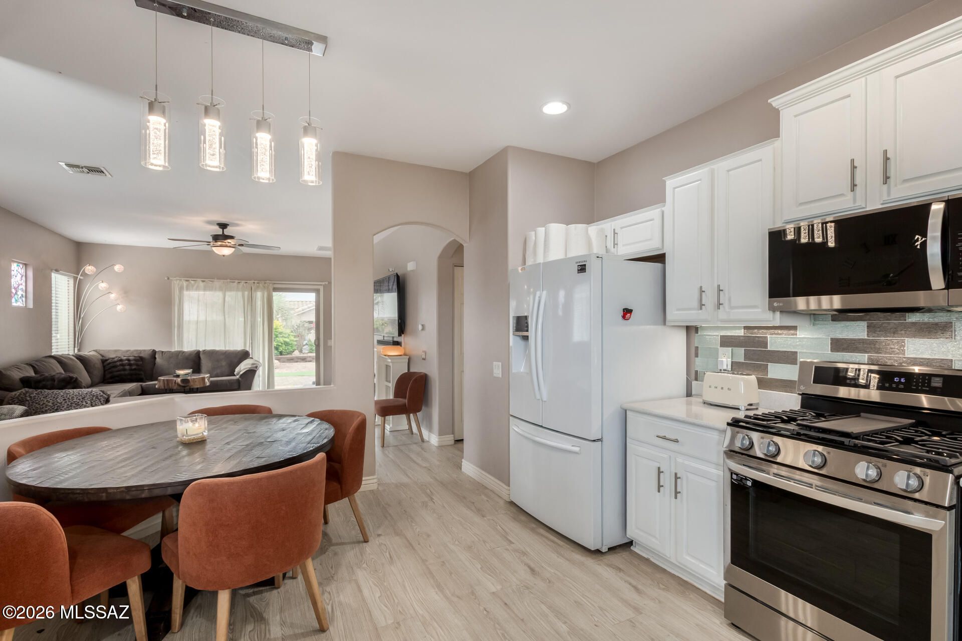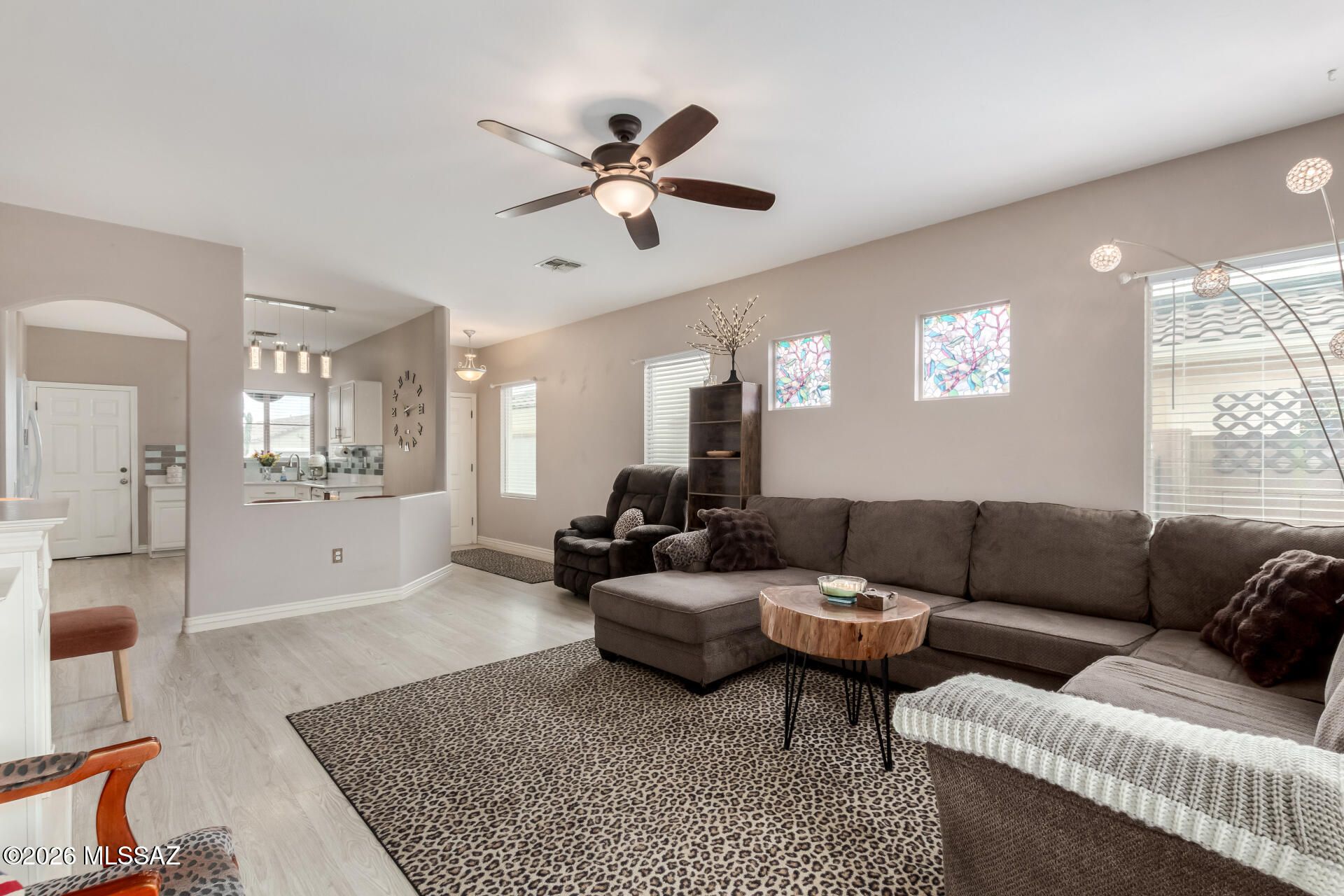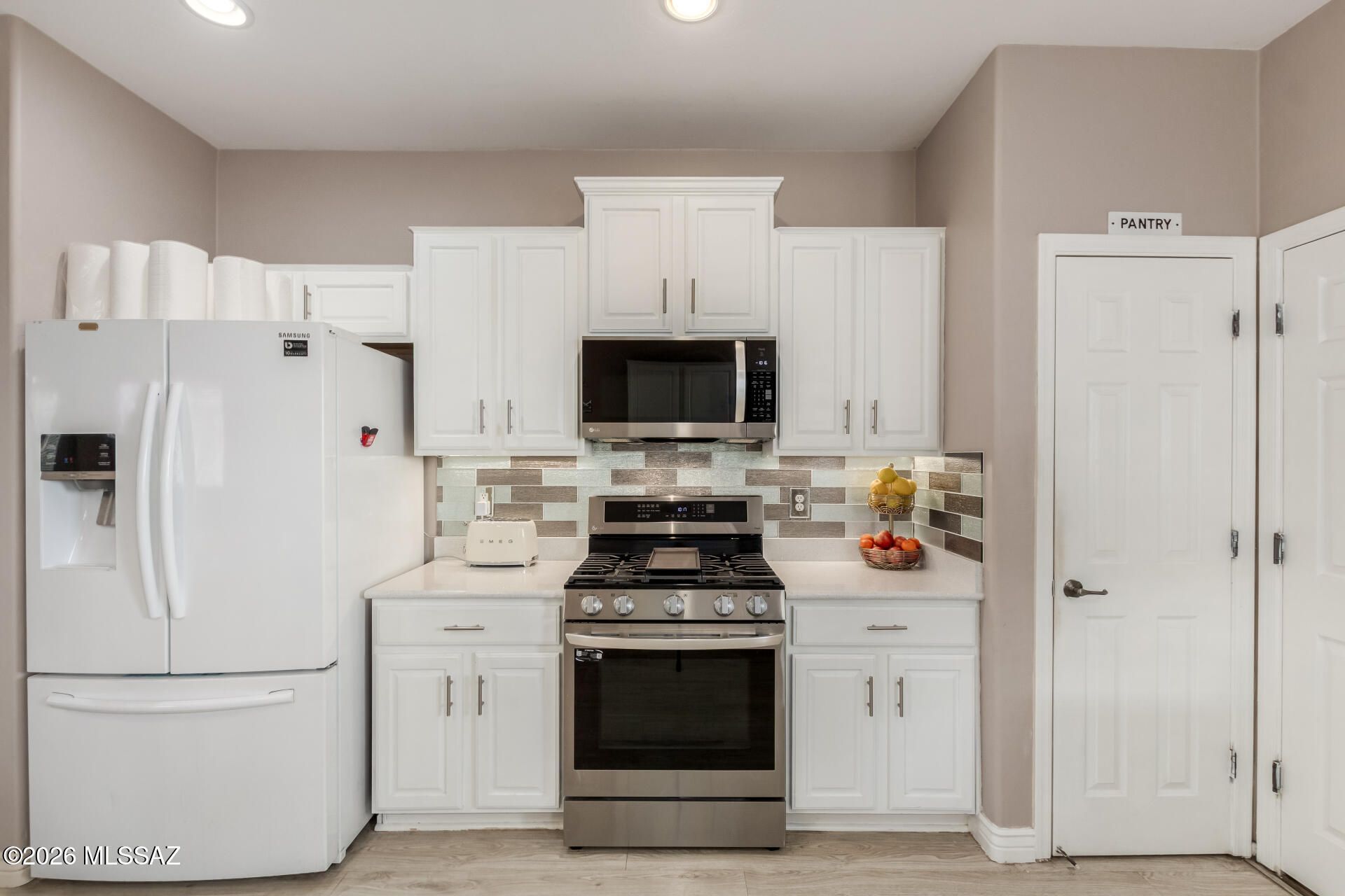 Look no further! This beautiful 2 bed, 2 bath property in Rancho Sahuarita (55+)is the one for you! Featuring great curb appeal, a low-maintenance desert landscape, pavers, and a 2 car garage w/built-in cabinets. Come inside to discover a spacious living room w/elegant wood-look flooring and crisp palette throughout, The eat-in kitchen is equipped w/everything you'll need for home cooking, ample cabinetry, quartz counters, tile backsplash, and stainless steel appliances. Enjoy a good night's sleep in the primary suite, boasting soft carpet, a private bath w/dual sinks, and a walk-in closet for all your belongings. Lastly, the sizeable backyard w/its covered patio and artificial turf, is the perfect place for a summer cookout w/friends & loved ones! Hurry, act now!