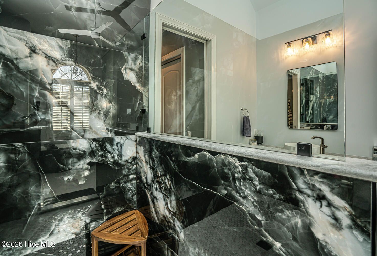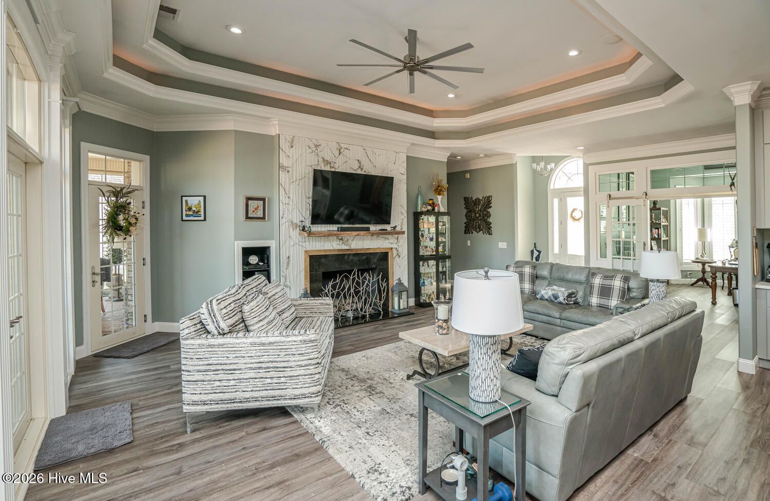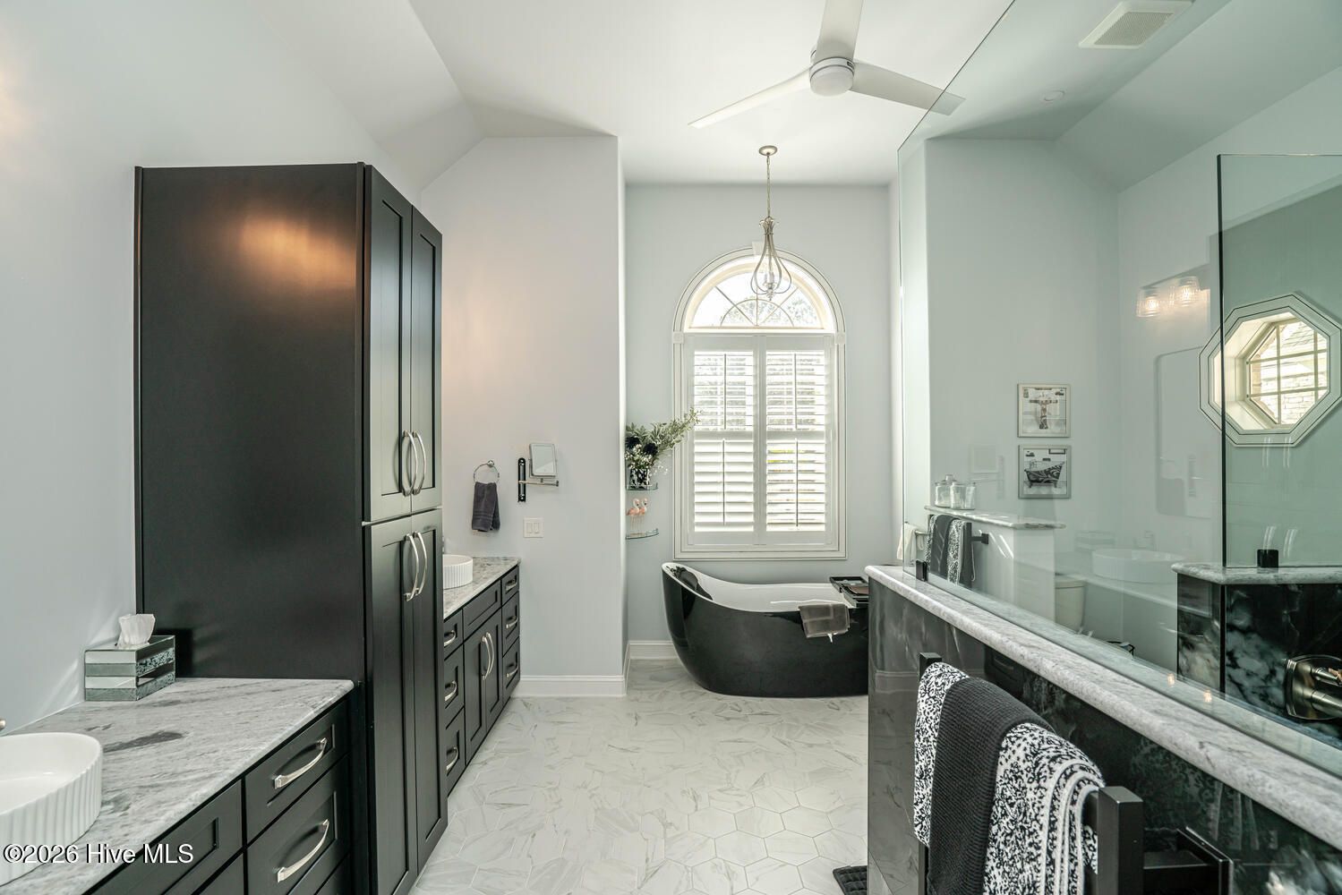 - Master Downstairs, Walk-In Closet(s), Tray Ceiling(s), High Ceilings, Entrance Foyer, Mud Room, Solid Surface Counters, Kitchen Island, Ceiling Fan(s), Walk-In Shower, Blinds
