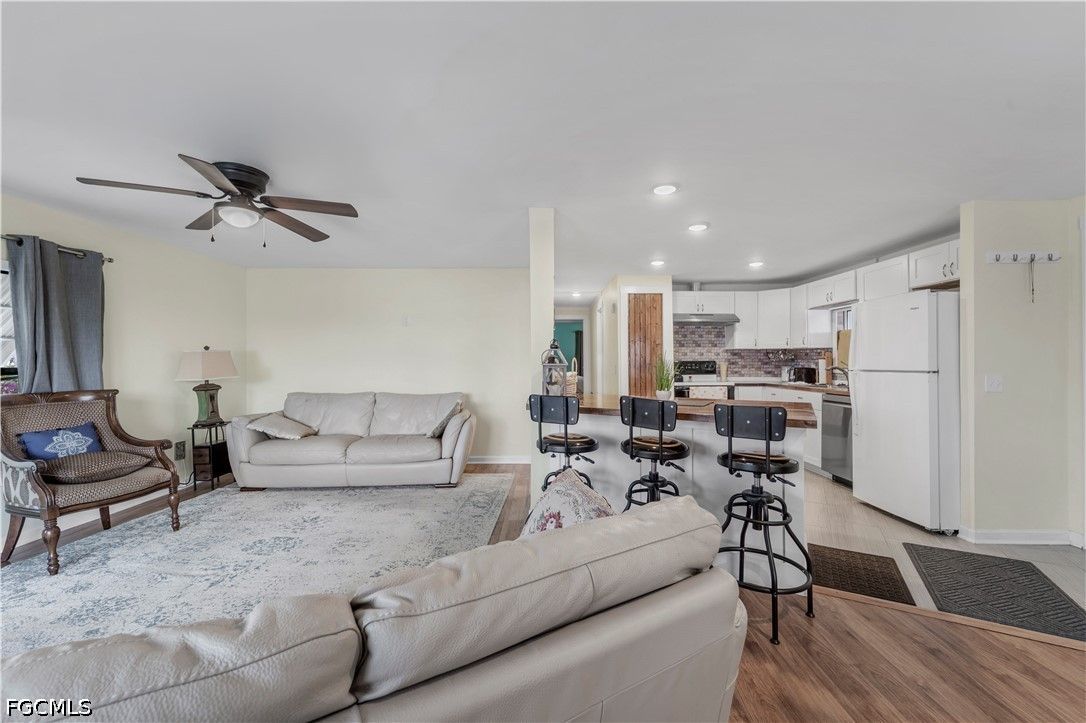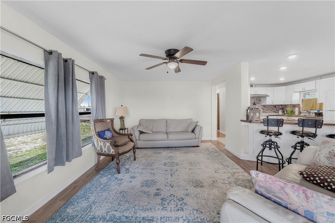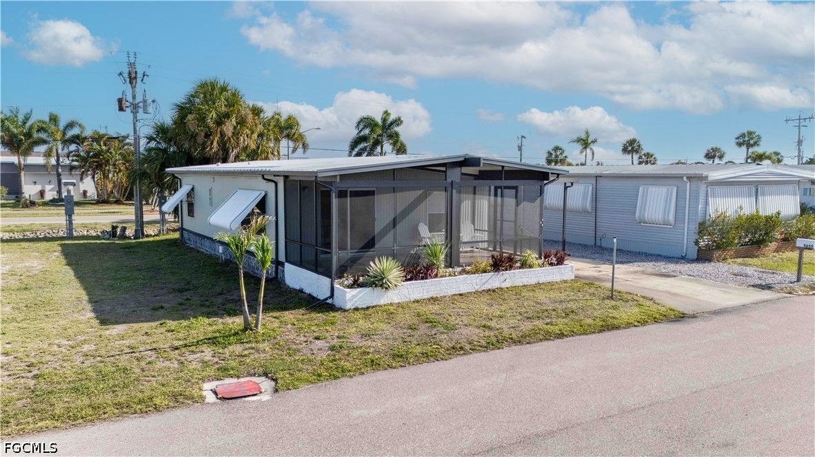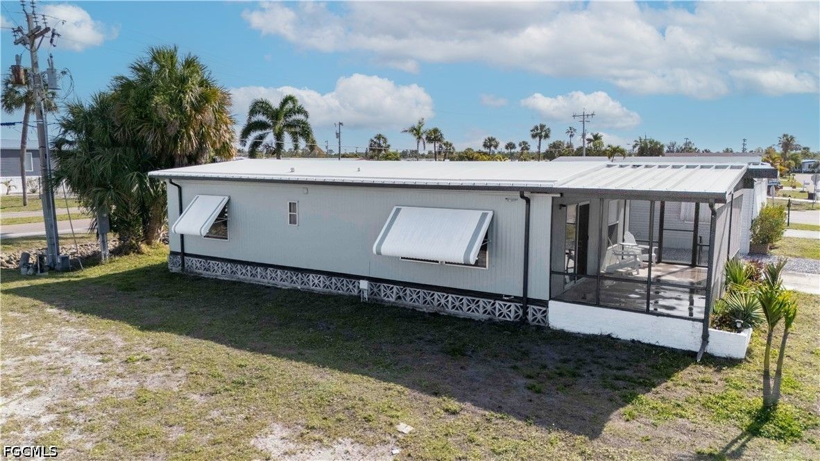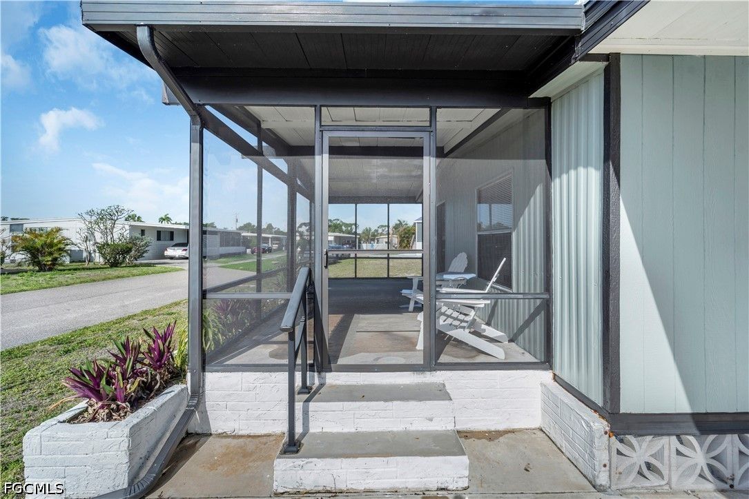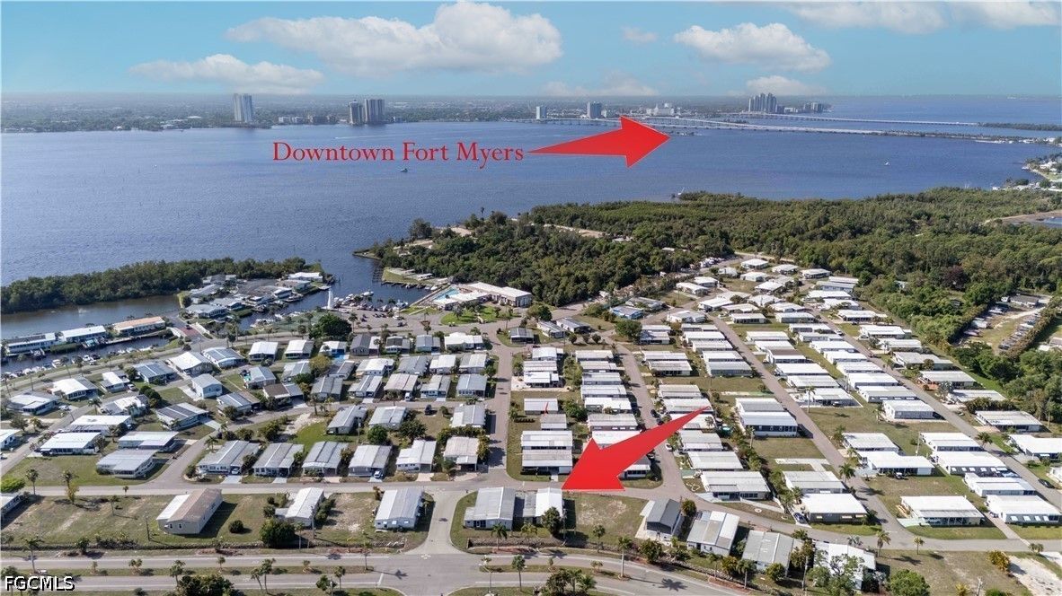Completely remodeled 2 bedroo., 2 bathroom home with new flooring, fresh interior/exterior paint, new foam insulation under the home, and a new metal roof. Custom rustic pine wood doors throughout add warmth and charm, while shutters on most windows and low utility bills enhance efficiency and comfort. Open-concept kitchen, dining, and living area—perfect for entertaining. Updated kitchen features new cabinetry and a large island with deep drawers and ample storage. Sold furnished (minus personal effects) with all appliances.9 Golf cart included (needs battery). Spacious primary suite with walk-in closet and updated bath featuring walk-in shower. Second bath fully remodeled with tub/shower combo. Located in Old Bridge Village, a resident-owned 55+ boating community with marina, boat ramp, and cool working lighthouse. Amenities include pools, fitness center, pickleball, tennis, bocce, clubhouse, and more. Prime location just minutes to downtown Fort Myers, Cape Coral, or Punta Gorda and a quick drive to RSW or PGD airports.