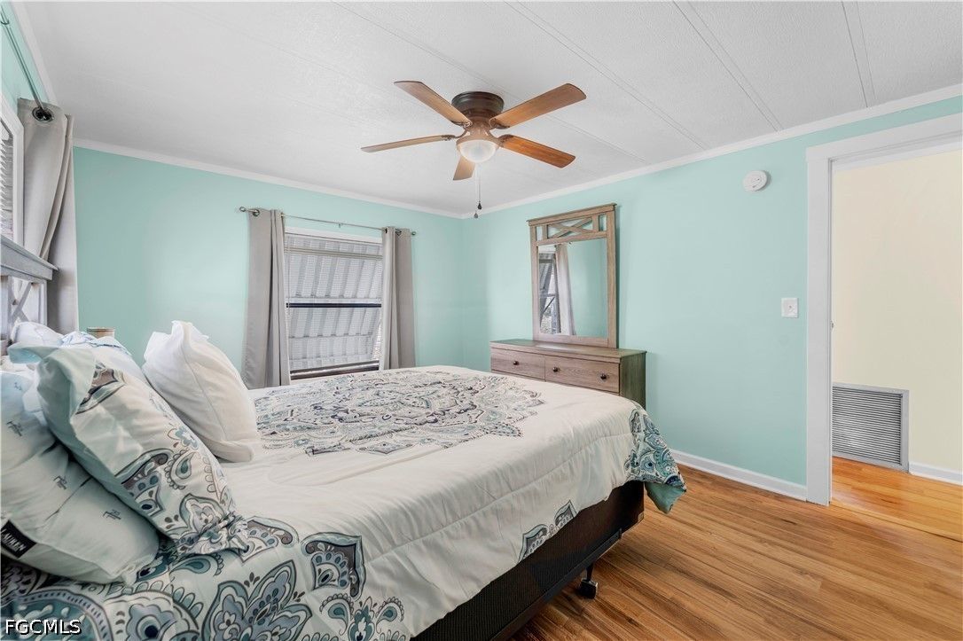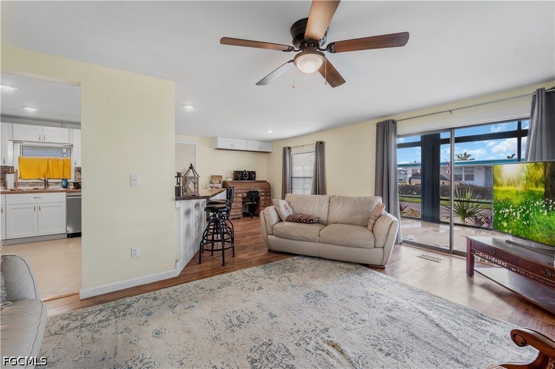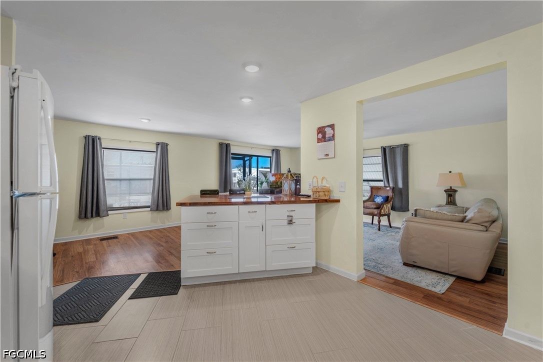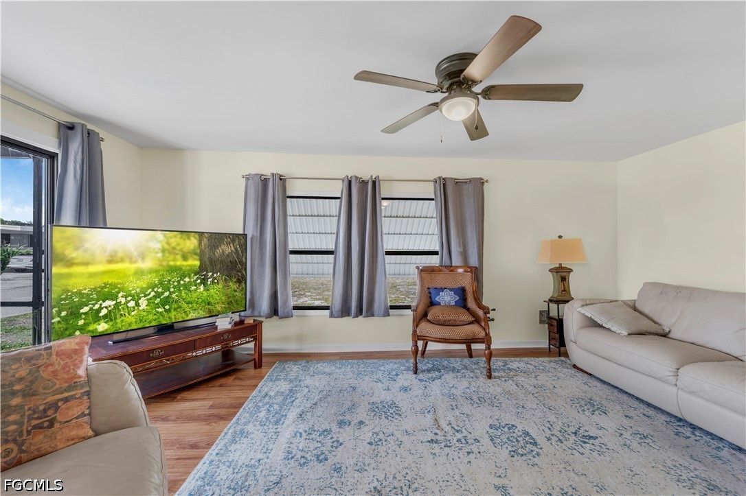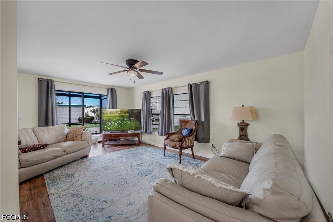 Completely remodeled 2 bedroo., 2 bathroom home with new flooring, fresh interior/exterior paint, new foam insulation under the home, and a new metal roof. Custom rustic pine wood doors throughout add warmth and charm, while shutters on most windows and low utility bills enhance efficiency and comfort. Open-concept kitchen, dining, and living area—perfect for entertaining. Updated kitchen features new cabinetry and a large island with deep drawers and ample storage. Sold furnished (minus personal effects) with all appliances.9 Golf cart included (needs battery). Spacious primary suite with walk-in closet and updated bath featuring walk-in shower. Second bath fully remodeled with tub/shower combo. Located in Old Bridge Village, a resident-owned 55+ boating community with marina, boat ramp, and cool working lighthouse. Amenities include pools, fitness center, pickleball, tennis, bocce, clubhouse, and more. Prime location just minutes to downtown Fort Myers, Cape Coral, or Punta Gorda and a quick drive to RSW or PGD airports.