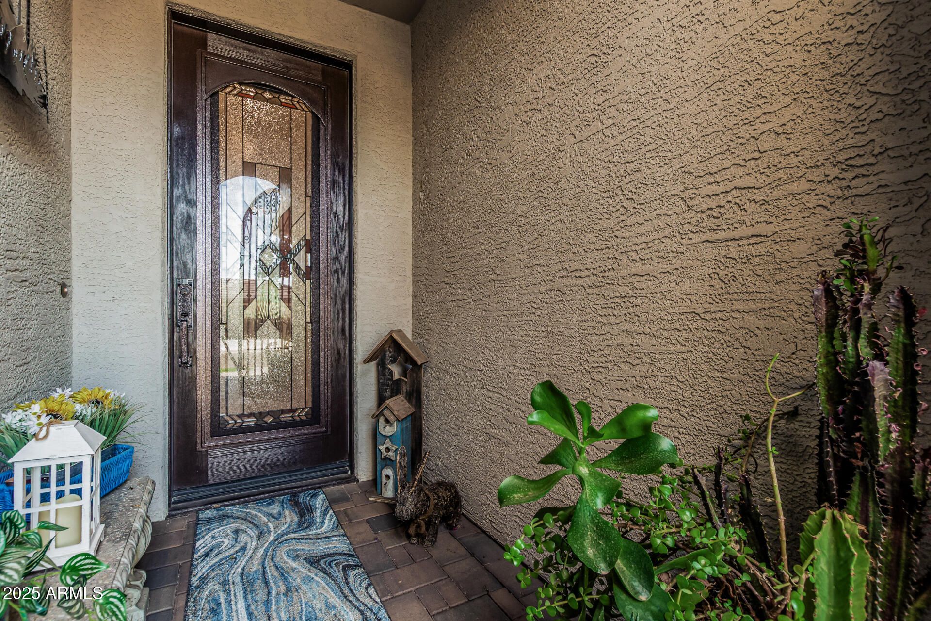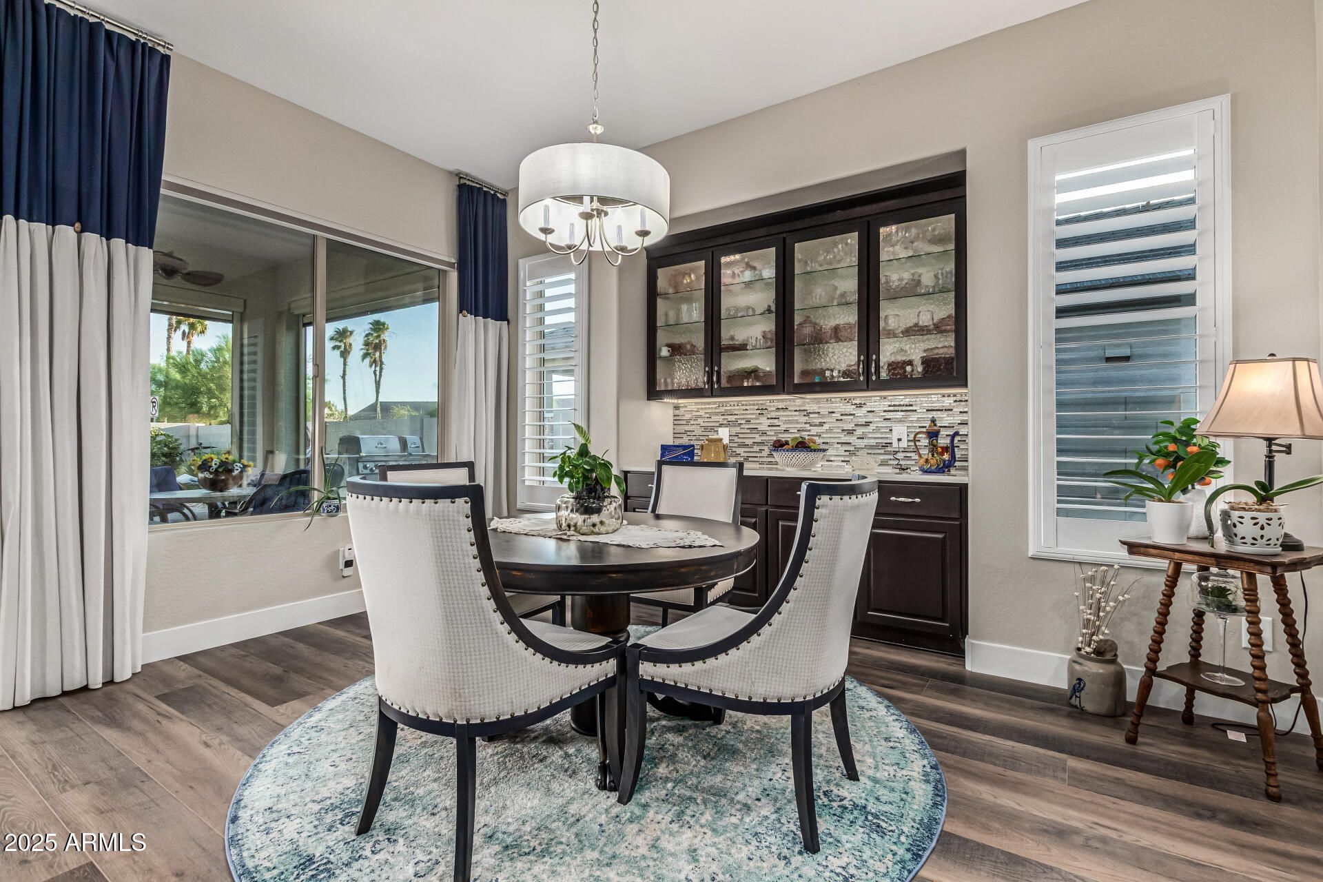 Welcome to your dream home in the Robson Ranch at even a better PRICE! This almost-new REVA model is packed with upgrades and charm, starting with larger 2.5-car garage, paver driveway, inviting curb appeal with custom glass door. Inside, you'll love the custom wood-look floors, plantation shutters, and bright, open great room. The kitchen is a total showstopper boasting LG ThinQ stainless appliances, Quartz counters, mosaic tile backsplash, a center island with breakfast bar, walk-in pantry, and chic Expresso cabinetry. Dining room cabinets, built-in Alcove. Spacious primary bedroom featuring walk-in shower and large walk-in closet. There's a sunny den ready for your office or hobby. The Guest Suite is perfect for your extra family. Laundry room has upper/lower cabinets. This is it! Outdoors, you'll find Covered Paver Patio with 3 Solar Remote Screens, 2 Dual-Fans, mounted TV, plus a custom built-in BROIL KING BBQ kitchen, lots of green turf, and a large pergola with a swing that's just waiting for AZ sunsets. Enjoy the mature landscaping and outdoor lighting. There is nothing for you to do but enjoy this lifestyle! Sellers are on the move, and this beauty is priced to sell fast. Take advantage of over $200k in upgrades and improvements! No waiting, no building, just start living the good life today! List of all upgrades and improvements is in Documents.