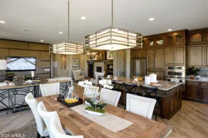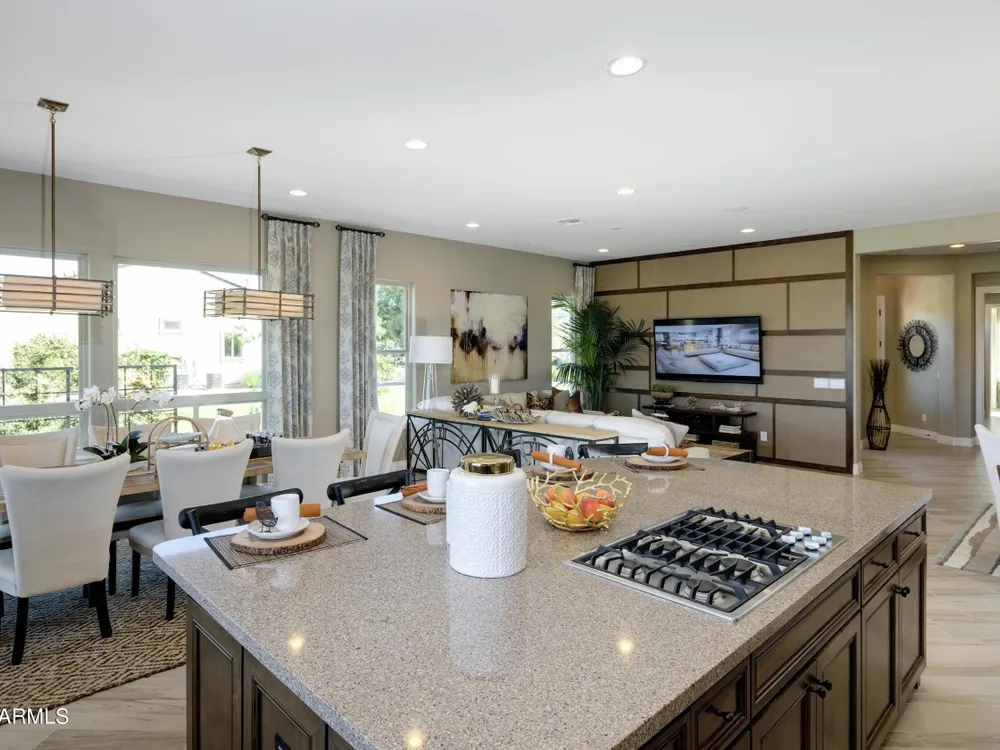 This Captivate floorplan creates the perfect indoor and outdoor space. The expansive kitchen with its large center island is a chef's dream, providing ample space for culinary creations and gatherings. This home offers a casita with additional living room and separate entrance. The thoughtful addition of a ''smart space'' housing laundry facilities and cabinetry further enhances the convenience and functionality of daily living. Both bathrooms have been upgraded with tile surrounds and beautiful light fixtures. Additional features include shutters, a carpet-free environment and gorgeous views of the golf course. Start living the Good Life at Encanterra today!
