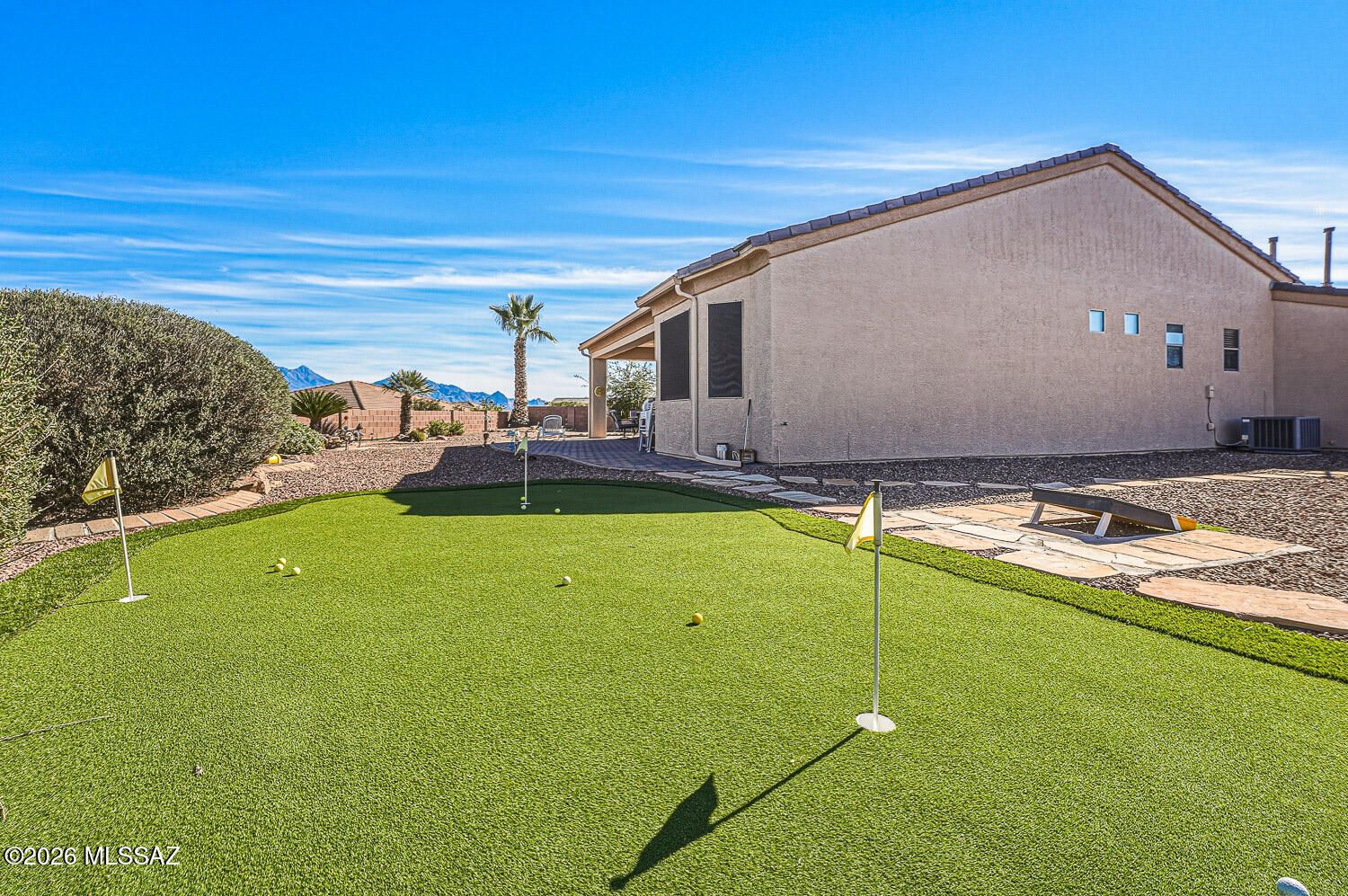 Beautiful Las Campanas Home in the heart of Green Valley, an Impressive Front Courtyard as you enter, this home has Mountain Views and a Great Room, 2 Bedrooms (Split), Open Den, Office and a large 2 1/2 Car Garage. Many great interior features: Tile Floors thought-out, gas range, ceiling fans, built-in cabinets, just too many features to list them all. A very private rear yard that would be great for entertaining, (Mountain Views), it even has it own private putting green and a cornhole court. This home comes completely Furnished (all furniture, furnishing, tools, etc.) Must See!