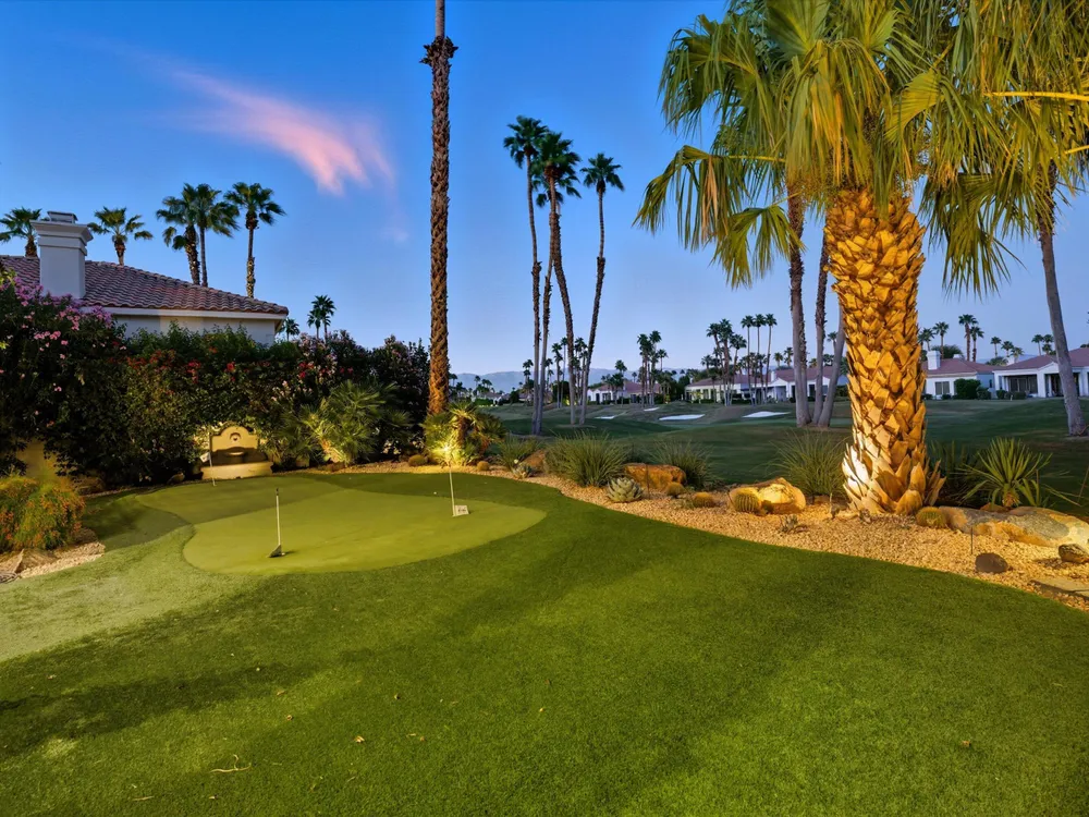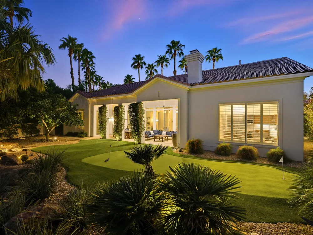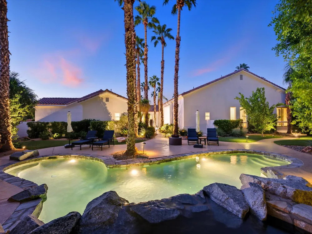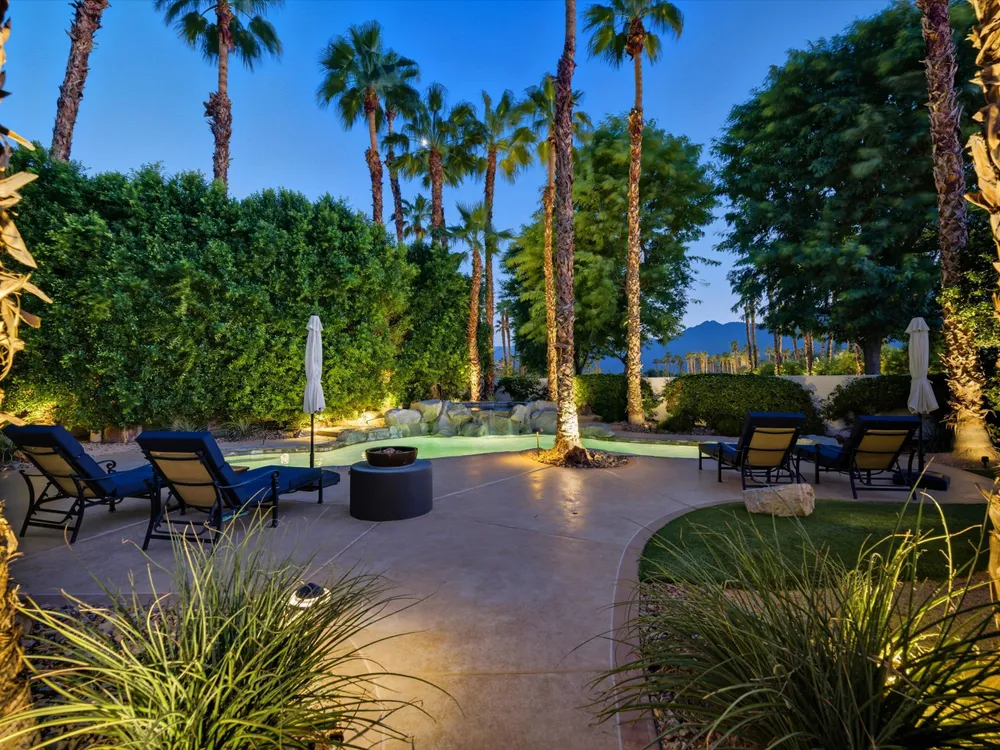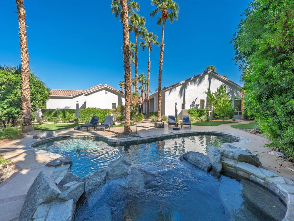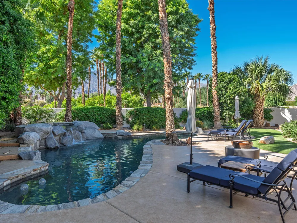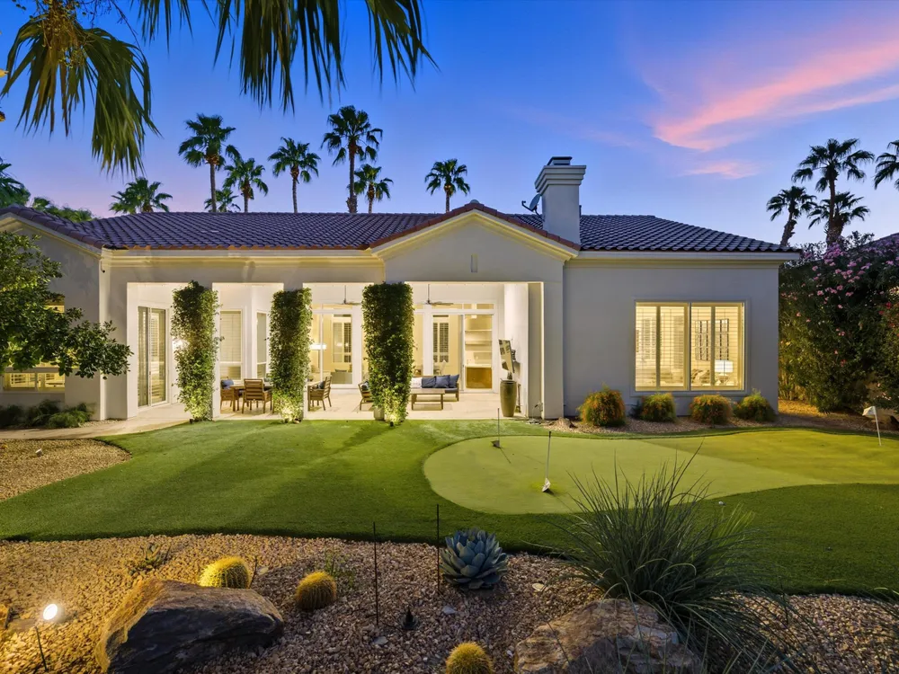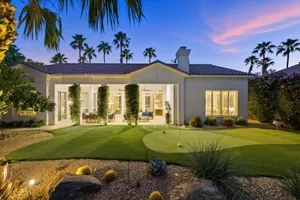 This beautifully reimagined residence sits on a .47-acre estate lot overlooking the 16th hole of the Nicklaus Tournament Course at PGA West. Blending modern sophistication with resort-style living, the home offers 4 bedrooms and 4.5 bathrooms, including 3.5 recently remodeled baths with fine finishes, plus a detached private casita with its own full bath, ideal for guests. The gourmet kitchen features stainless steel appliances, Pental quartz countertops, a dramatic 8' x 8' island with seating for 10, Ann Sacks designer tile, and refinished custom cabinetry. Additional highlights include a wet bar, stacked-stone fireplace, custom built-ins, updated ceiling fans, LED lighting, and a finished epoxy garage. The fourth bedroom, originally designed as an office, has a full bath and can easily serve as additional sleeping quarters. Outdoors, the property is surrounded by lush landscaping with 28 mature palm trees, abundant plantings, and three fruit trees—tangelo, lemon, and grapefruit. The side yard showcases a pebble tech pool and spa with south-facing views of the mountains, while the back yard offers a putting green overlooking the fairway. Two main HVAC units have been replaced within the last three years, ensuring comfort and efficiency. Offered furnished per inventory, this is a one-of-a-kind property that must be experienced in person.