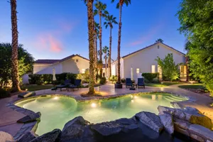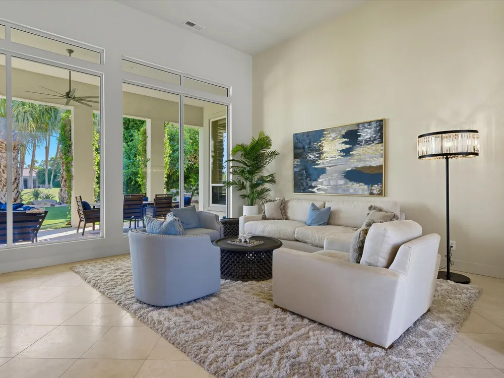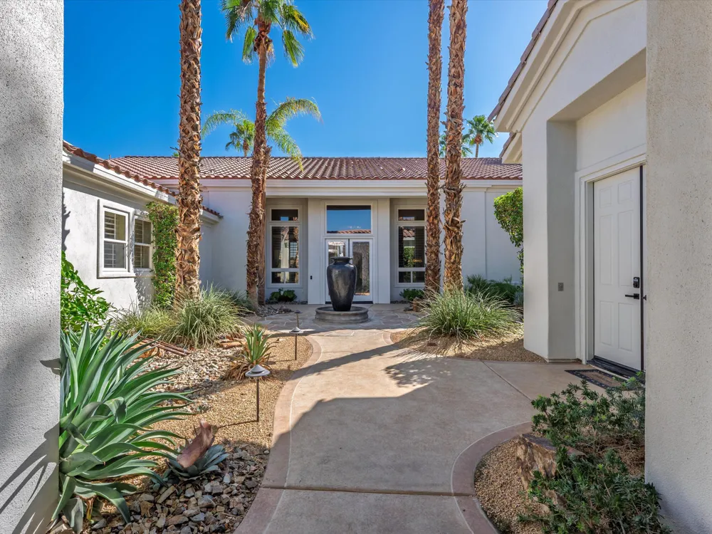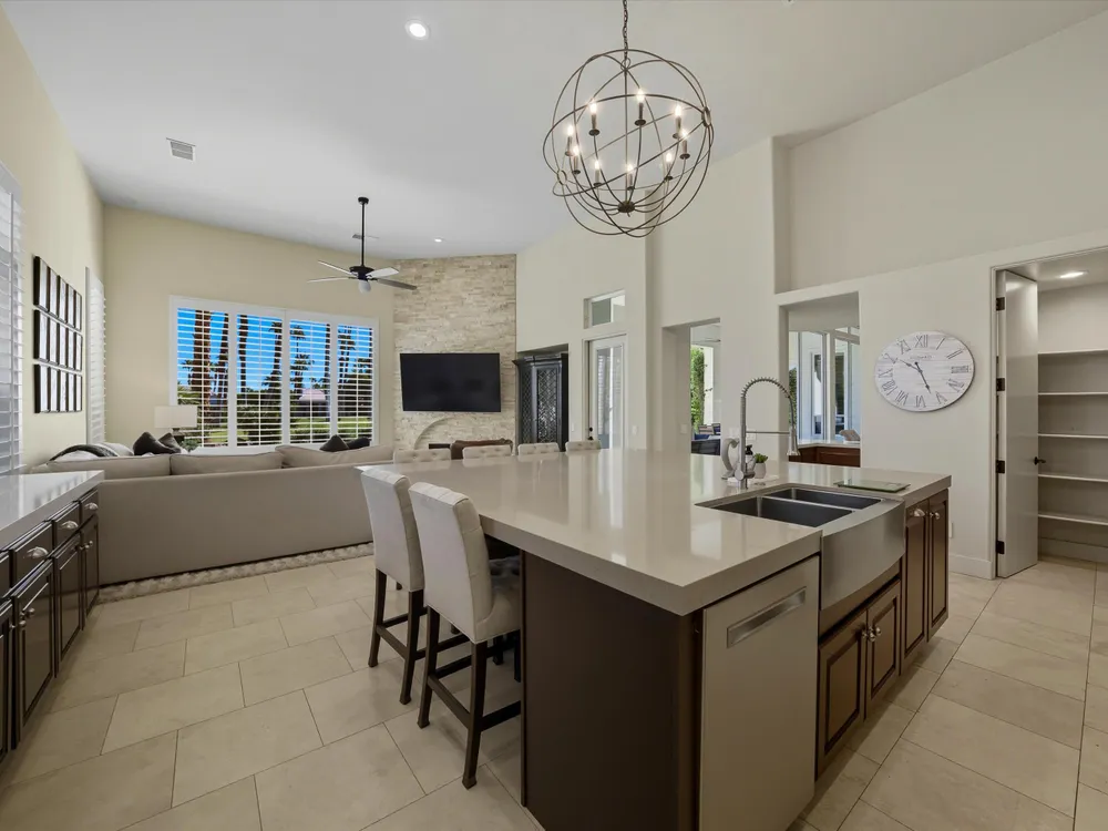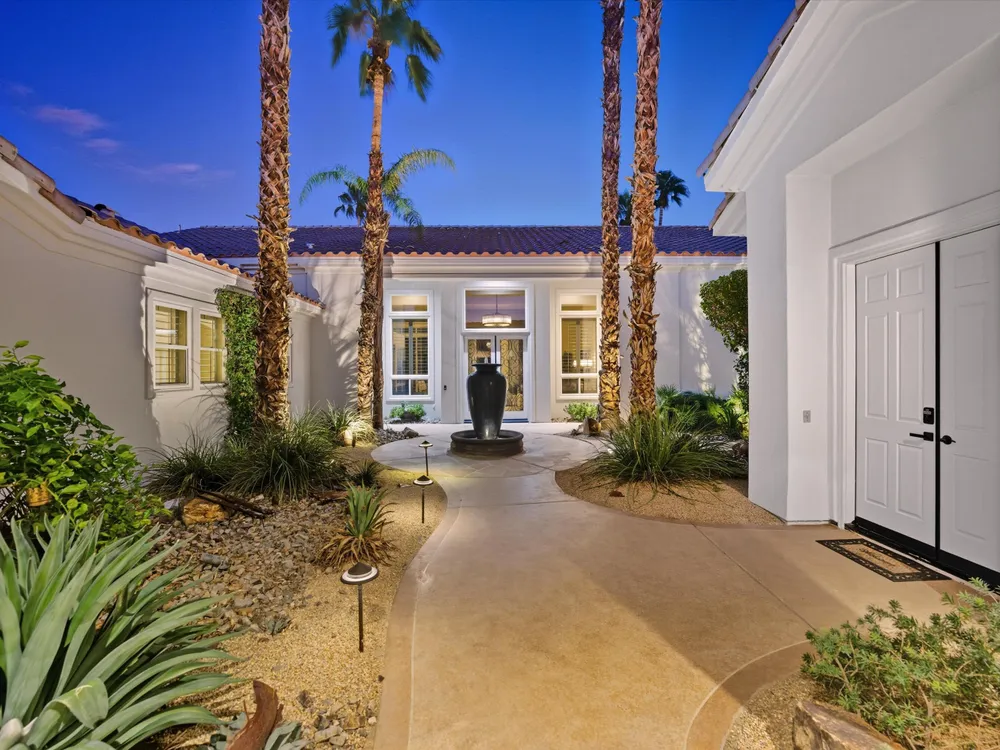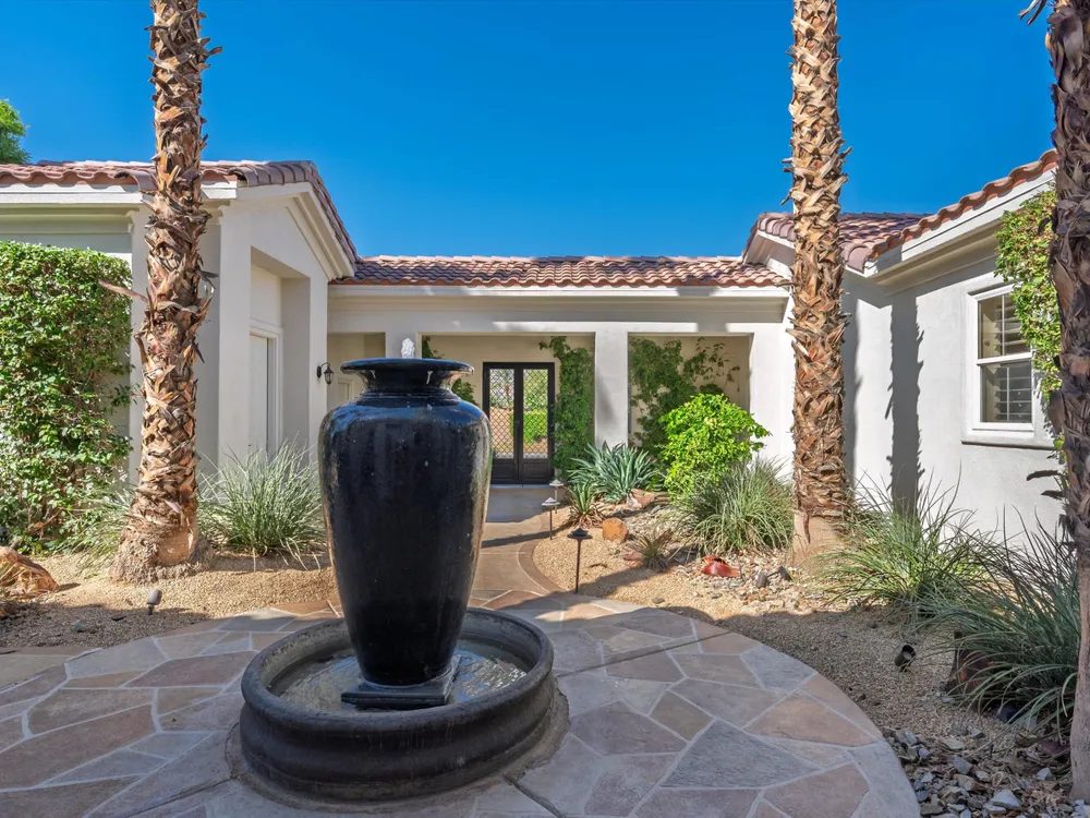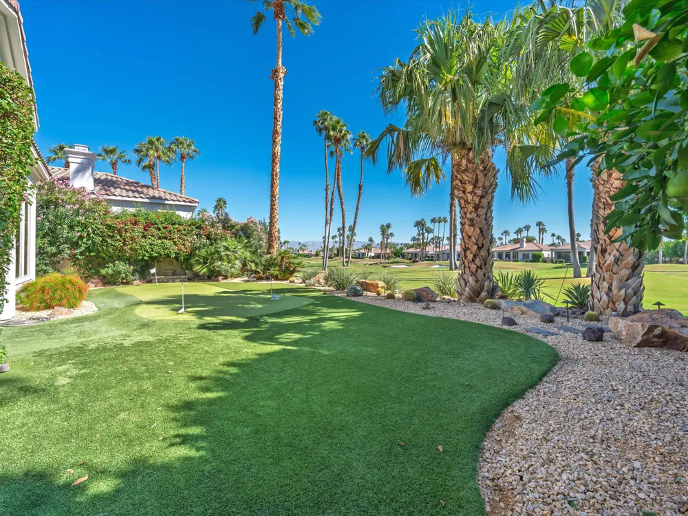 This beautifully reimagined residence sits on a .47-acre estate lot overlooking the 16th hole of the Nicklaus Tournament Course at PGA West. Blending modern sophistication with resort-style living, the home offers 4 bedrooms and 4.5 bathrooms, including 3.5 recently remodeled baths with fine finishes, plus a detached private casita with its own full bath, ideal for guests. The gourmet kitchen features stainless steel appliances, Pental quartz countertops, a dramatic 8' x 8' island with seating for 10, Ann Sacks designer tile, and refinished custom cabinetry. Additional highlights include a wet bar, stacked-stone fireplace, custom built-ins, updated ceiling fans, LED lighting, and a finished epoxy garage. The fourth bedroom, originally designed as an office, has a full bath and can easily serve as additional sleeping quarters. Outdoors, the property is surrounded by lush landscaping with 28 mature palm trees, abundant plantings, and three fruit trees—tangelo, lemon, and grapefruit. The side yard showcases a pebble tech pool and spa with south-facing views of the mountains, while the back yard offers a putting green overlooking the fairway. Two main HVAC units have been replaced within the last three years, ensuring comfort and efficiency. Offered furnished per inventory, this is a one-of-a-kind property that must be experienced in person.