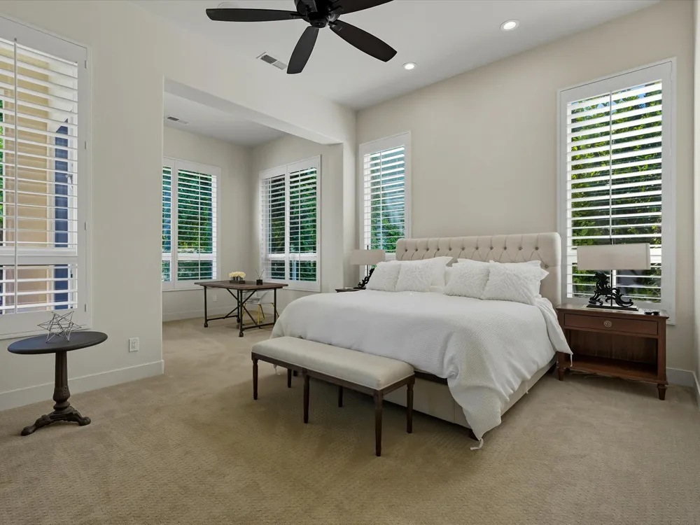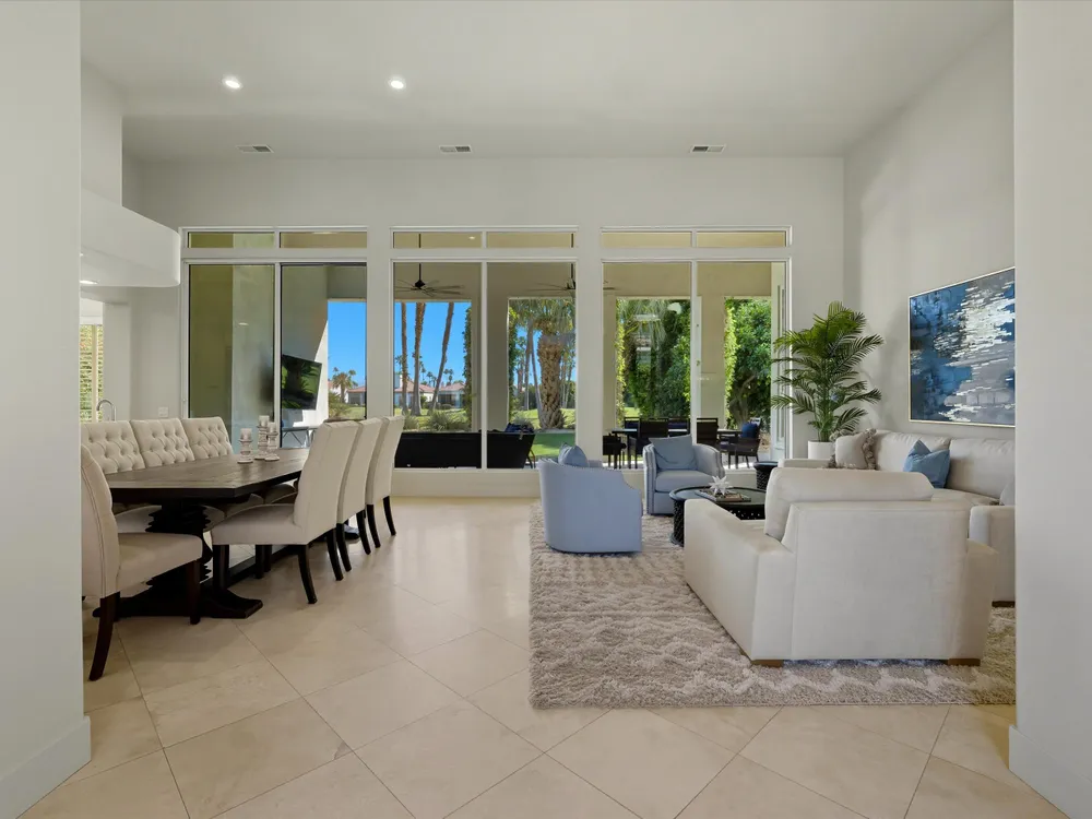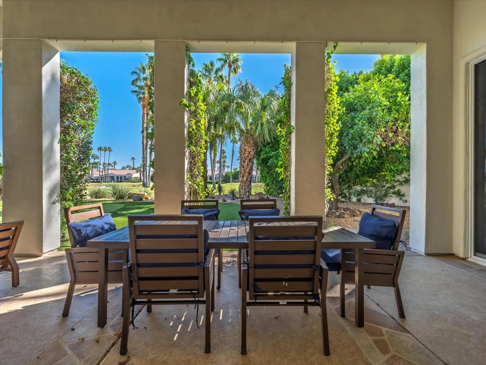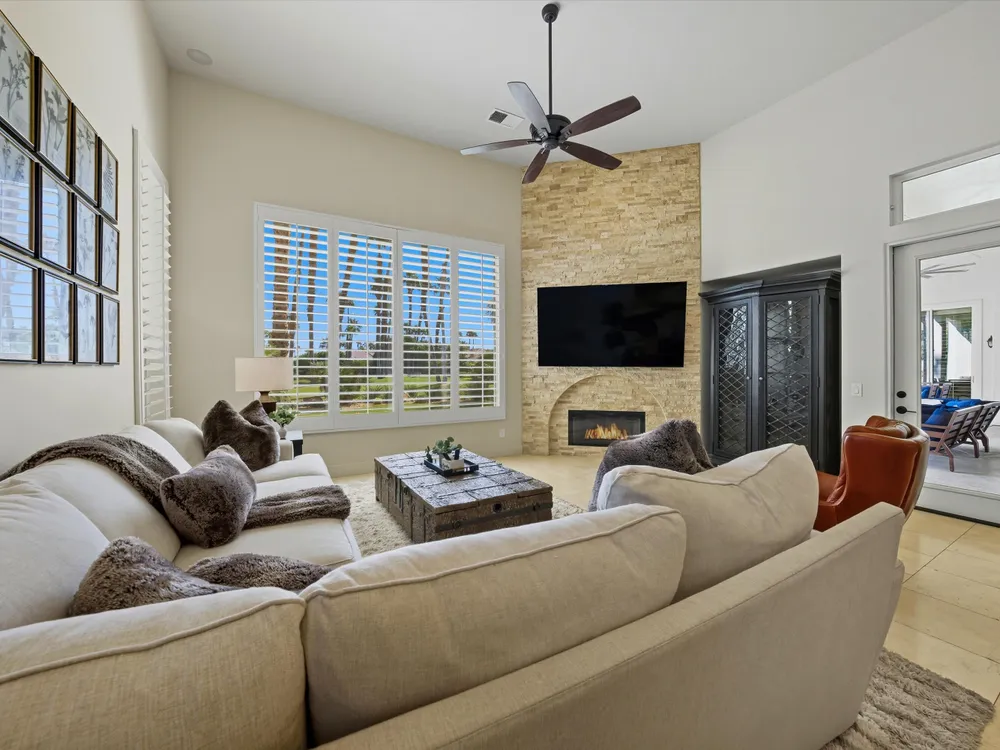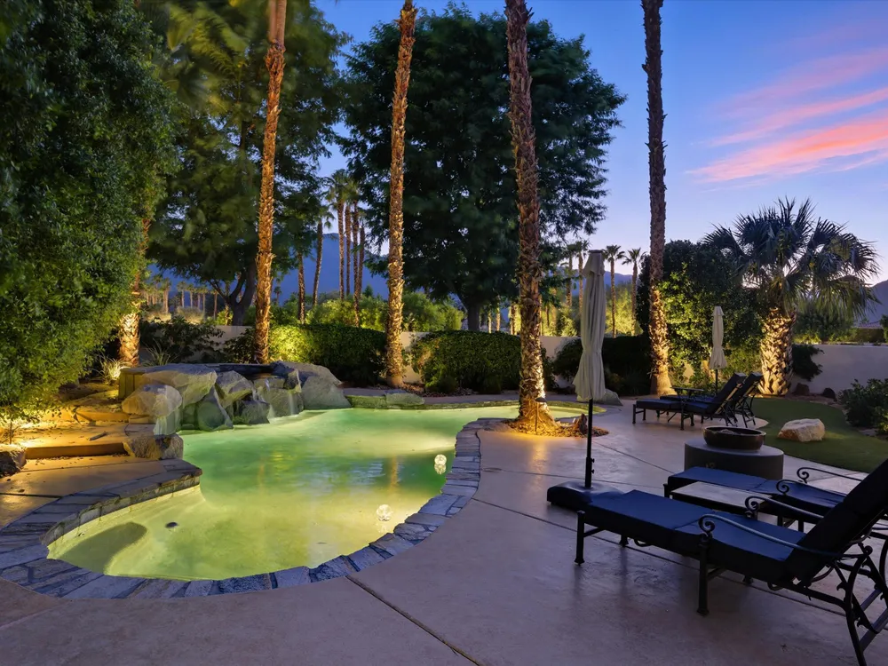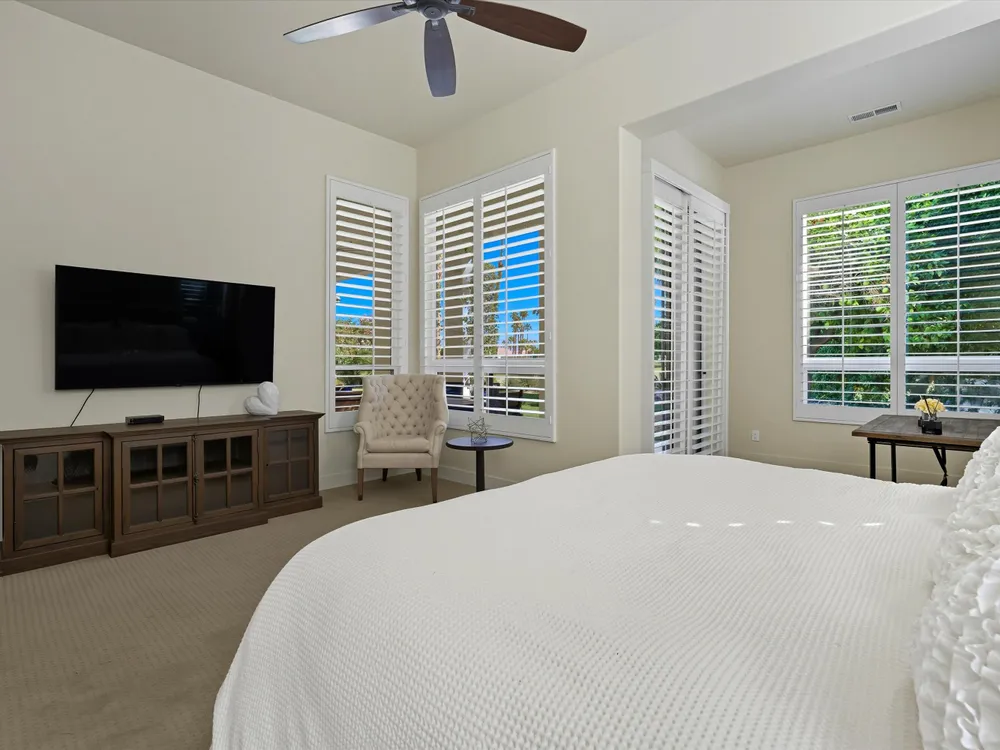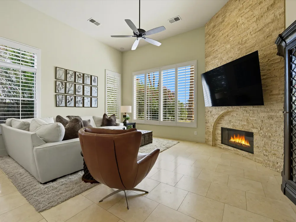 This beautifully reimagined residence sits on a .47-acre estate lot overlooking the 16th hole of the Nicklaus Tournament Course at PGA West. Blending modern sophistication with resort-style living, the home offers 4 bedrooms and 4.5 bathrooms, including 3.5 recently remodeled baths with fine finishes, plus a detached private casita with its own full bath, ideal for guests. The gourmet kitchen features stainless steel appliances, Pental quartz countertops, a dramatic 8' x 8' island with seating for 10, Ann Sacks designer tile, and refinished custom cabinetry. Additional highlights include a wet bar, stacked-stone fireplace, custom built-ins, updated ceiling fans, LED lighting, and a finished epoxy garage. The fourth bedroom, originally designed as an office, has a full bath and can easily serve as additional sleeping quarters. Outdoors, the property is surrounded by lush landscaping with 28 mature palm trees, abundant plantings, and three fruit trees—tangelo, lemon, and grapefruit. The side yard showcases a pebble tech pool and spa with south-facing views of the mountains, while the back yard offers a putting green overlooking the fairway. Two main HVAC units have been replaced within the last three years, ensuring comfort and efficiency. Offered furnished per inventory, this is a one-of-a-kind property that must be experienced in person.