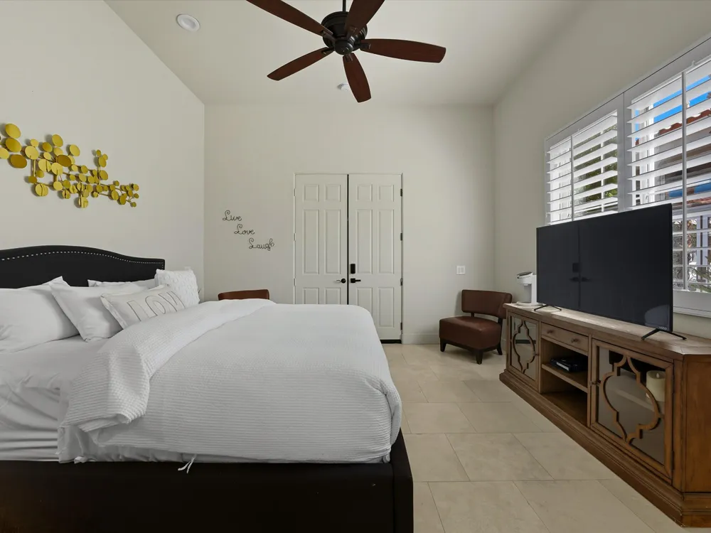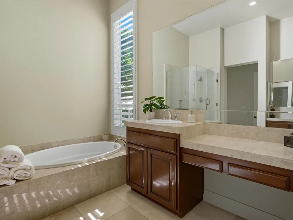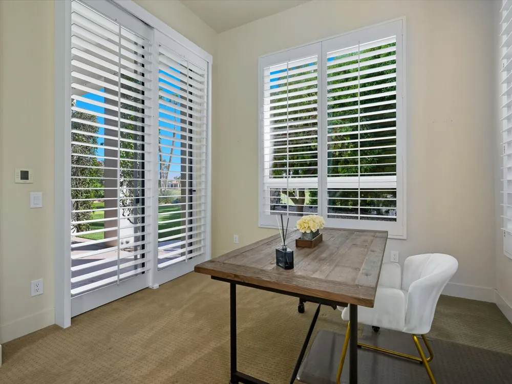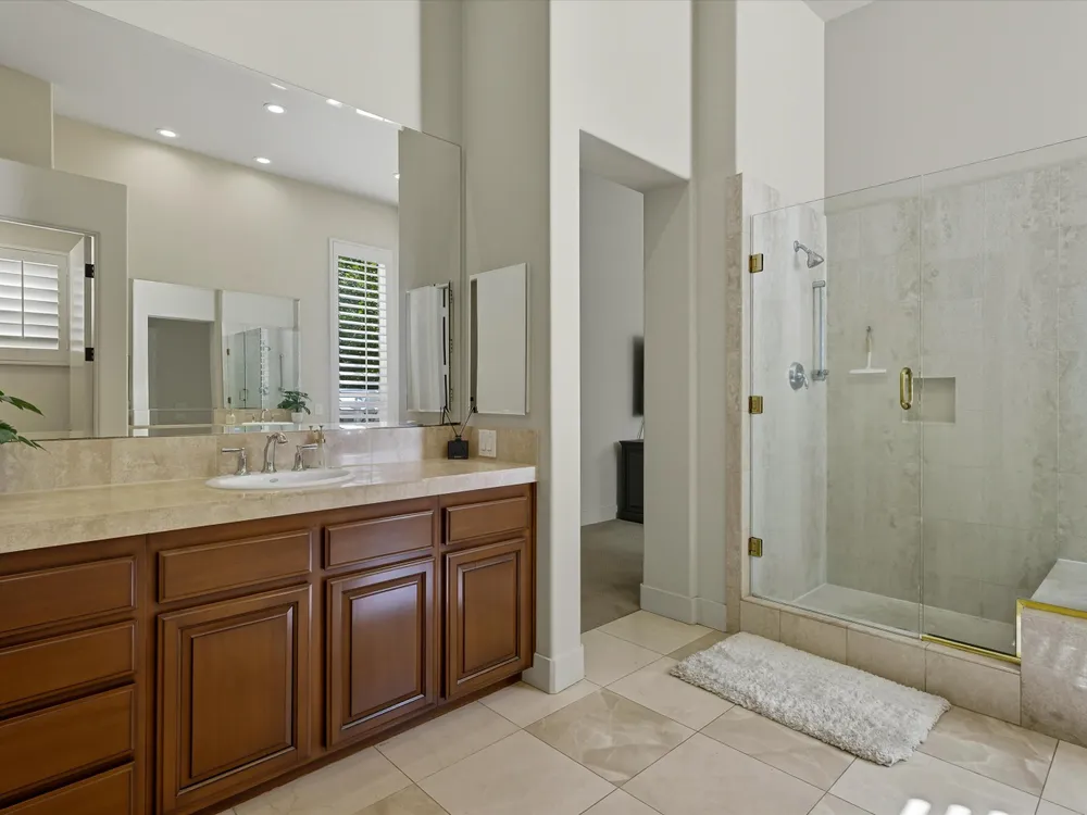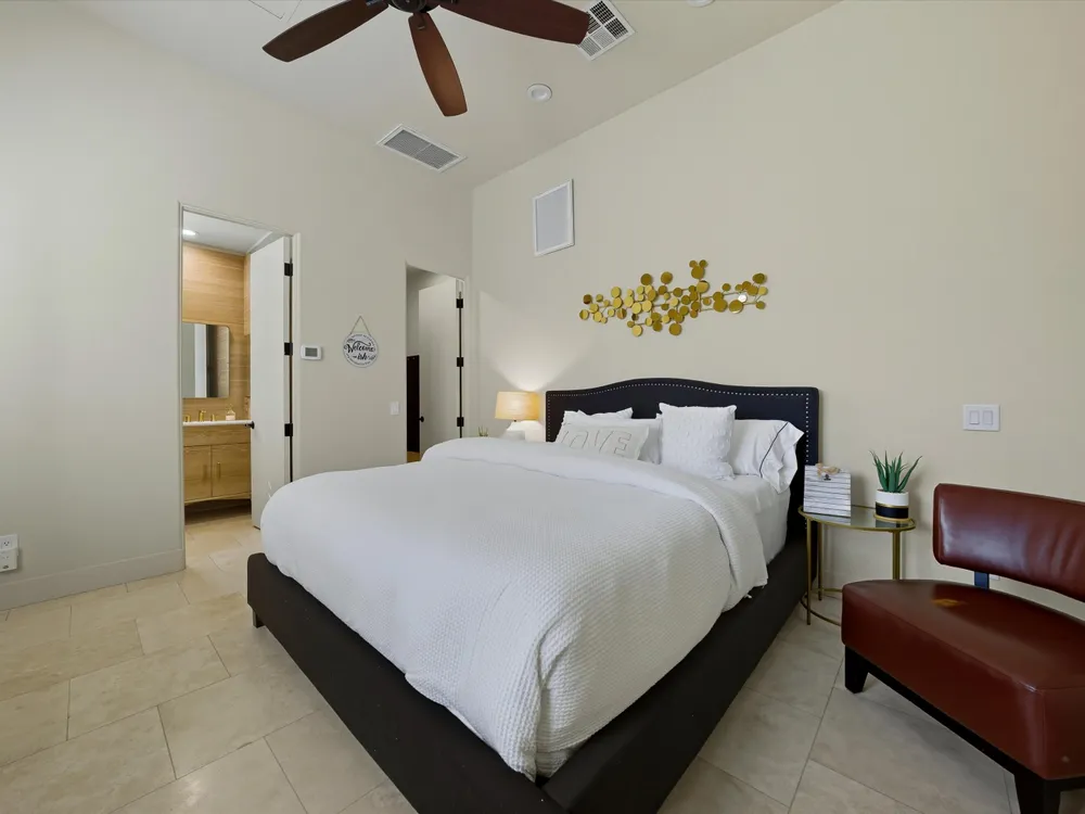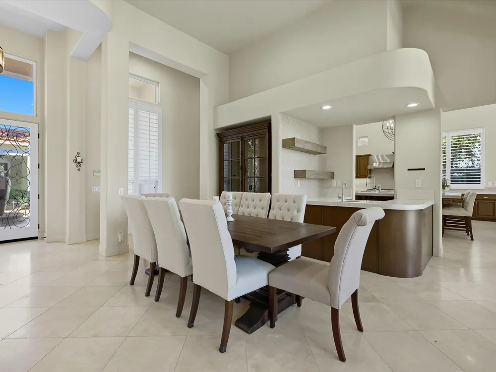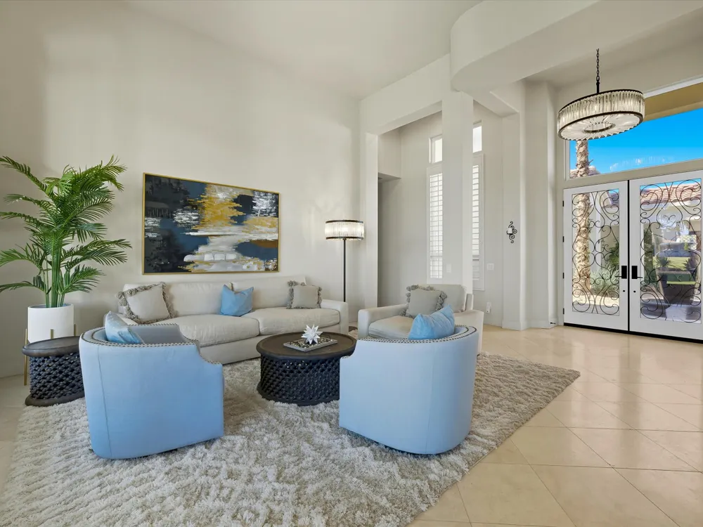 This beautifully reimagined residence sits on a .47-acre estate lot overlooking the 16th hole of the Nicklaus Tournament Course at PGA West. Blending modern sophistication with resort-style living, the home offers 4 bedrooms and 4.5 bathrooms, including 3.5 recently remodeled baths with fine finishes, plus a detached private casita with its own full bath, ideal for guests. The gourmet kitchen features stainless steel appliances, Pental quartz countertops, a dramatic 8' x 8' island with seating for 10, Ann Sacks designer tile, and refinished custom cabinetry. Additional highlights include a wet bar, stacked-stone fireplace, custom built-ins, updated ceiling fans, LED lighting, and a finished epoxy garage. The fourth bedroom, originally designed as an office, has a full bath and can easily serve as additional sleeping quarters. Outdoors, the property is surrounded by lush landscaping with 28 mature palm trees, abundant plantings, and three fruit trees—tangelo, lemon, and grapefruit. The side yard showcases a pebble tech pool and spa with south-facing views of the mountains, while the back yard offers a putting green overlooking the fairway. Two main HVAC units have been replaced within the last three years, ensuring comfort and efficiency. Offered furnished per inventory, this is a one-of-a-kind property that must be experienced in person.