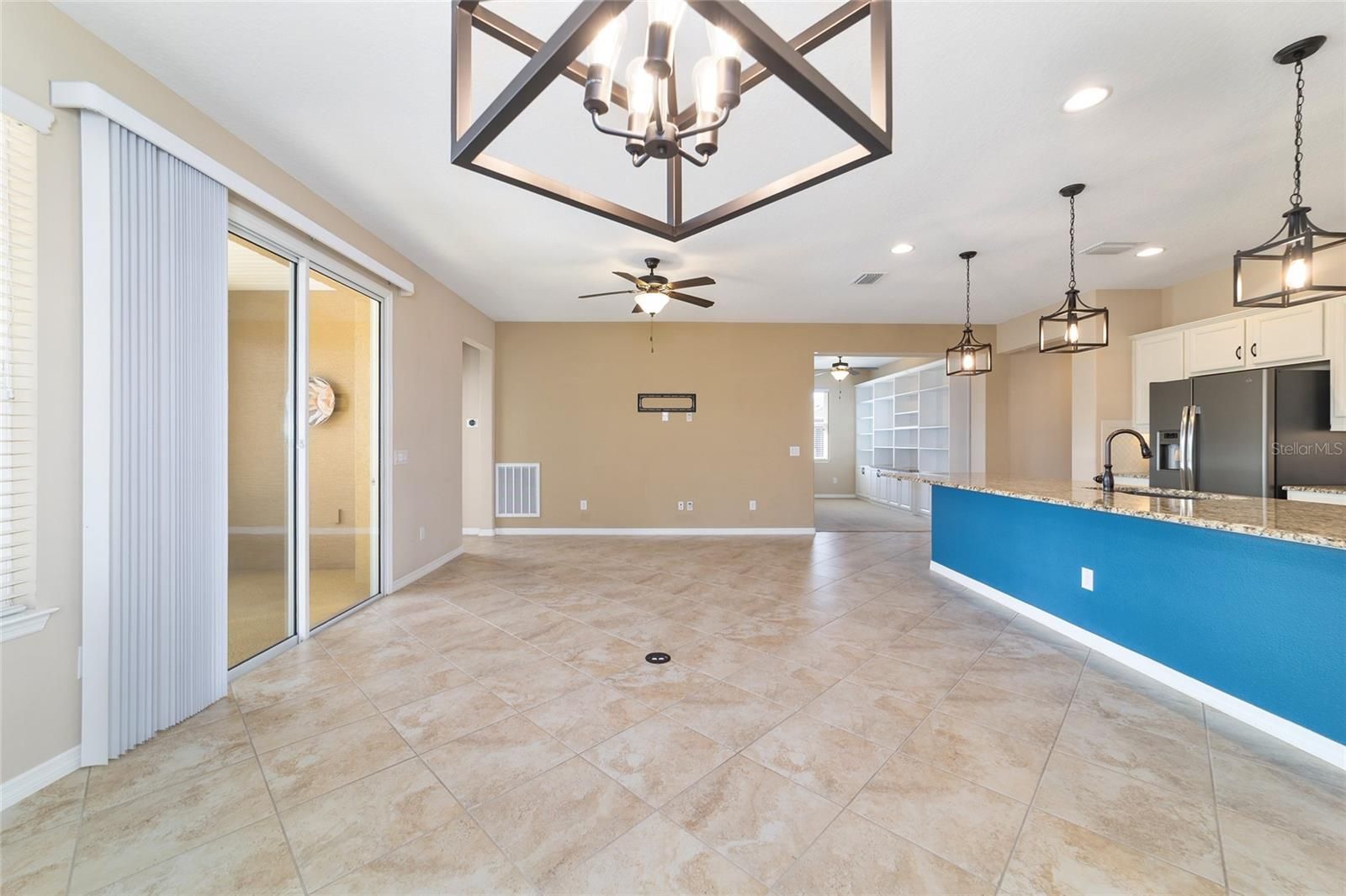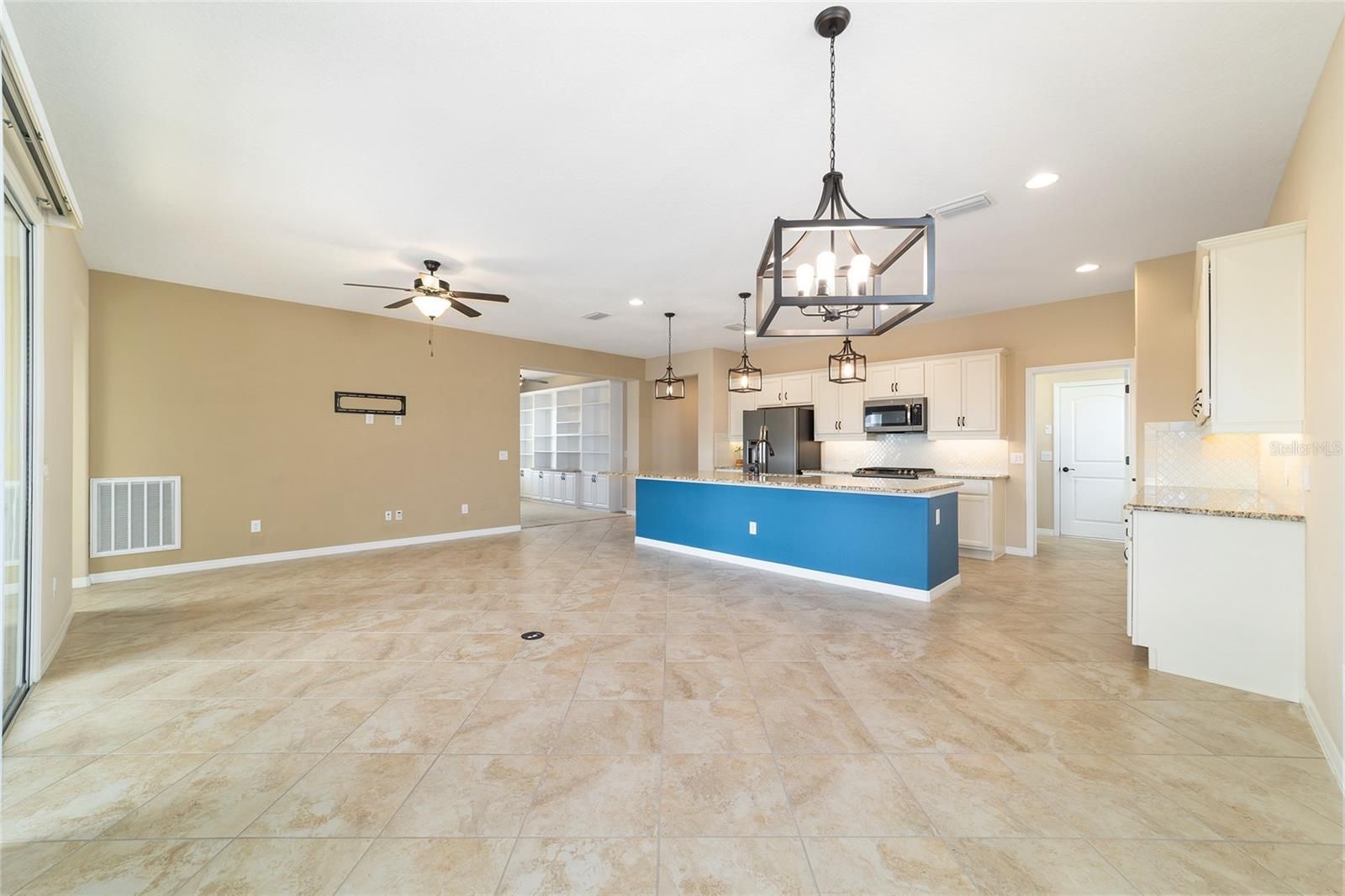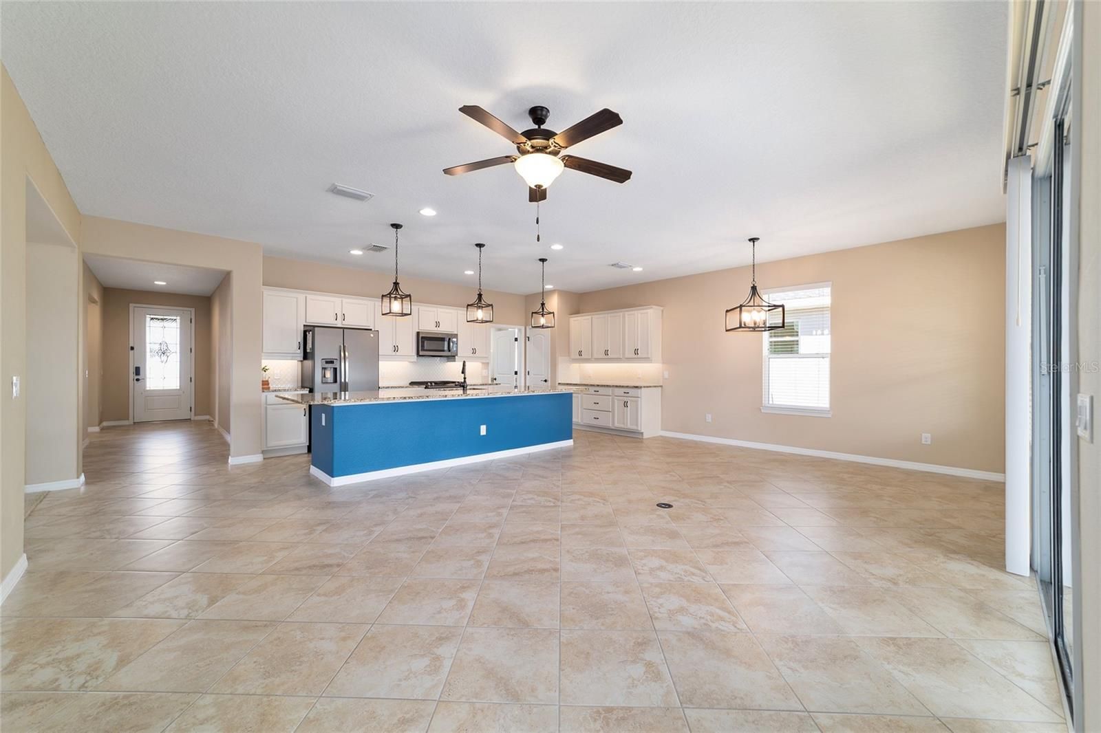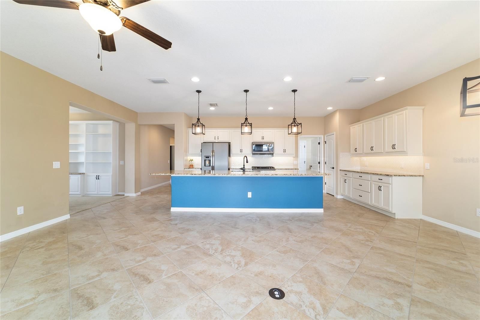- Built-in Features, Ceiling Fan(s), Eat-in Kitchen, High Ceilings, Kitchen/Family Room Combo, Living/Dining Room, Open Floorplan, Main Level Primary, Stone Counters, Thermostat, Walk-In Closet(s), Window Treatments