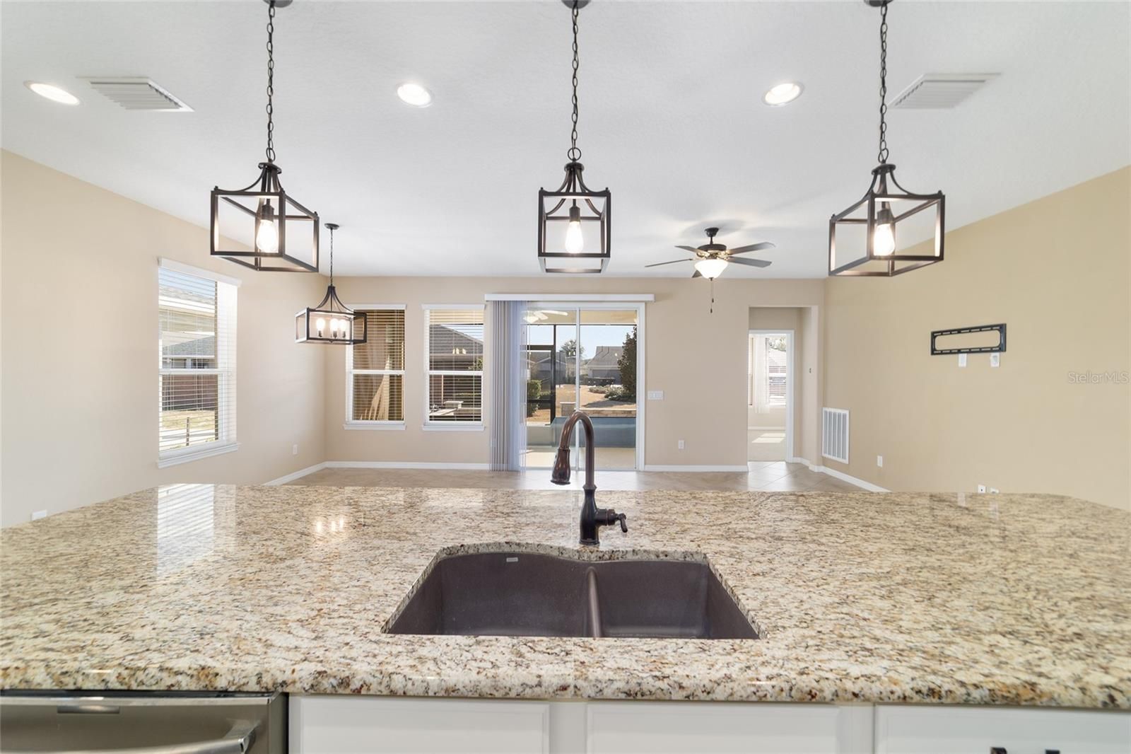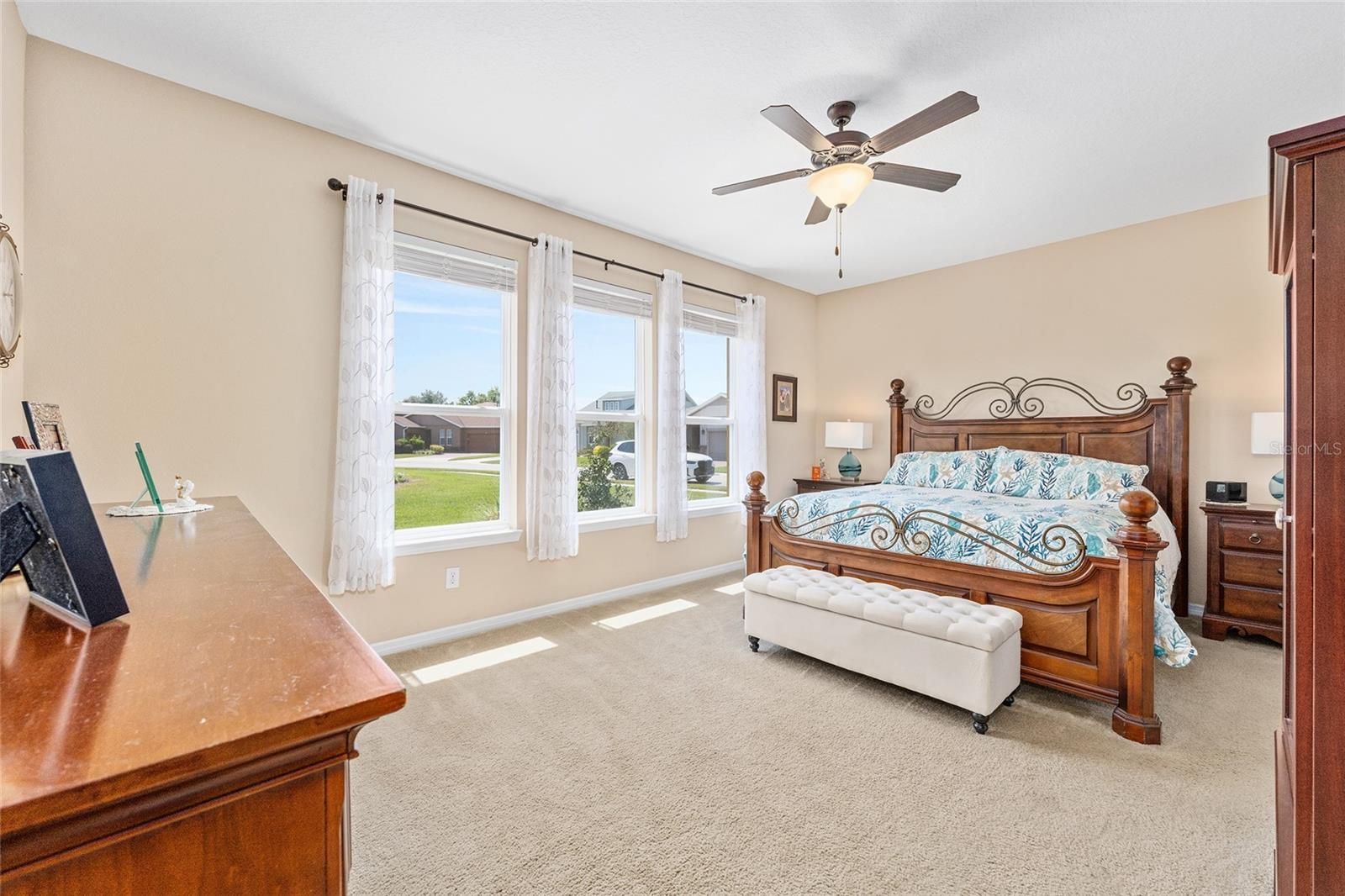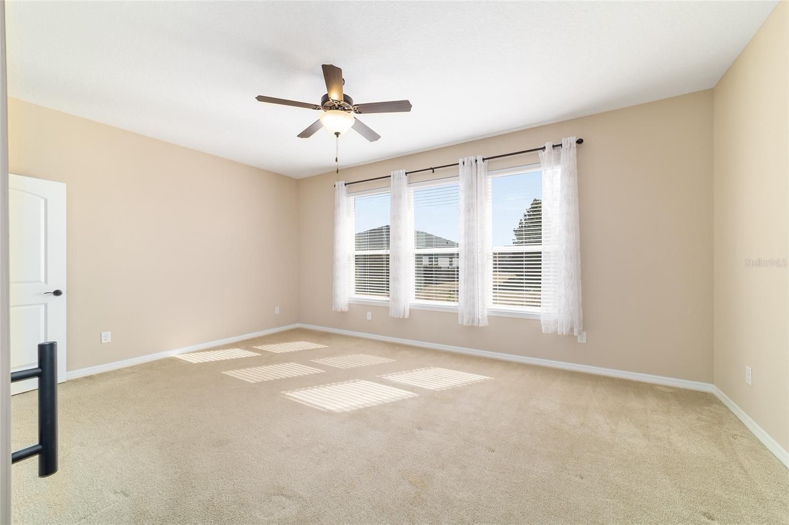 - Built-in Features, Ceiling Fan(s), Eat-in Kitchen, High Ceilings, Kitchen/Family Room Combo, Living/Dining Room, Open Floorplan, Main Level Primary, Stone Counters, Thermostat, Walk-In Closet(s), Window Treatments