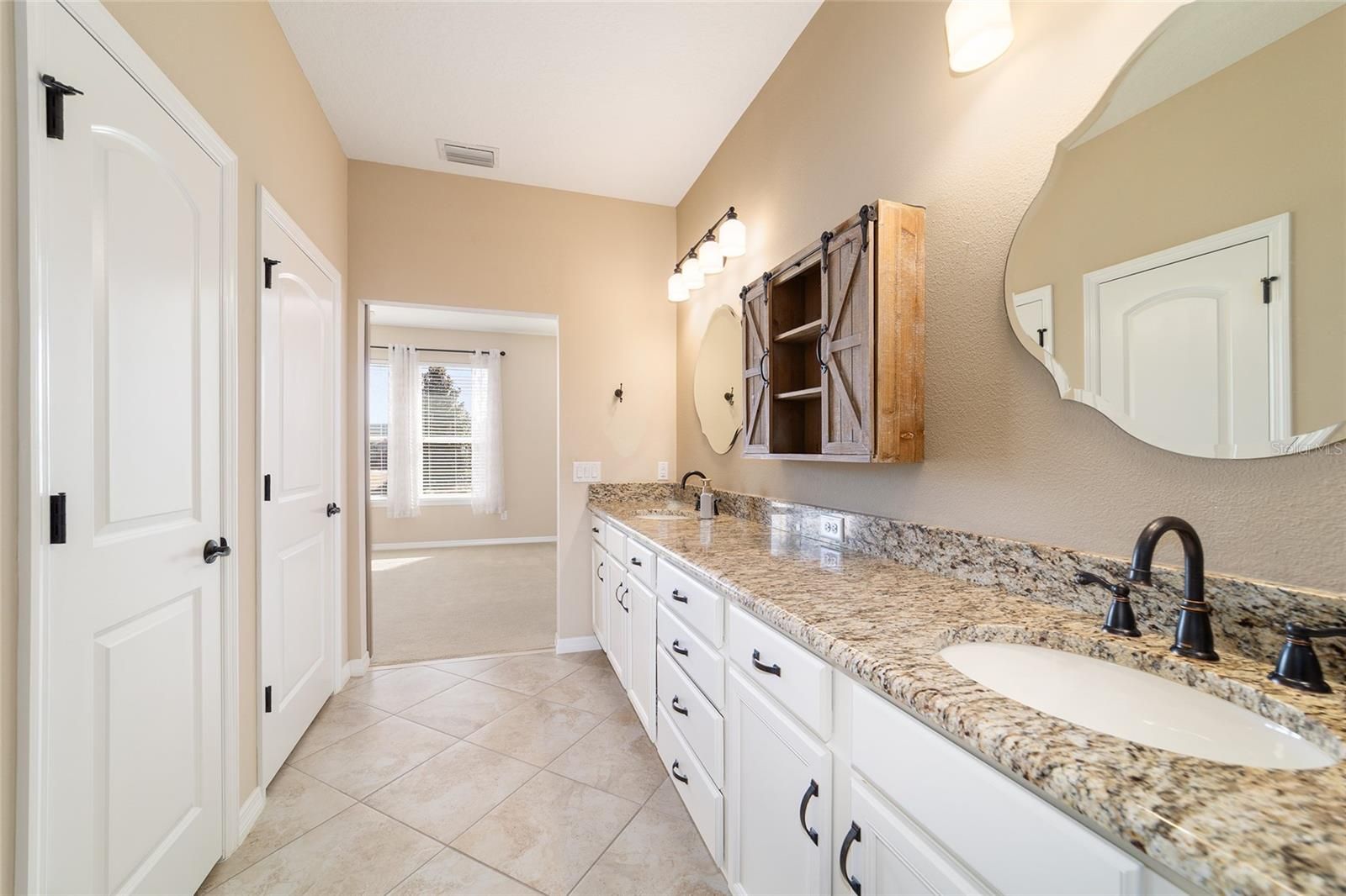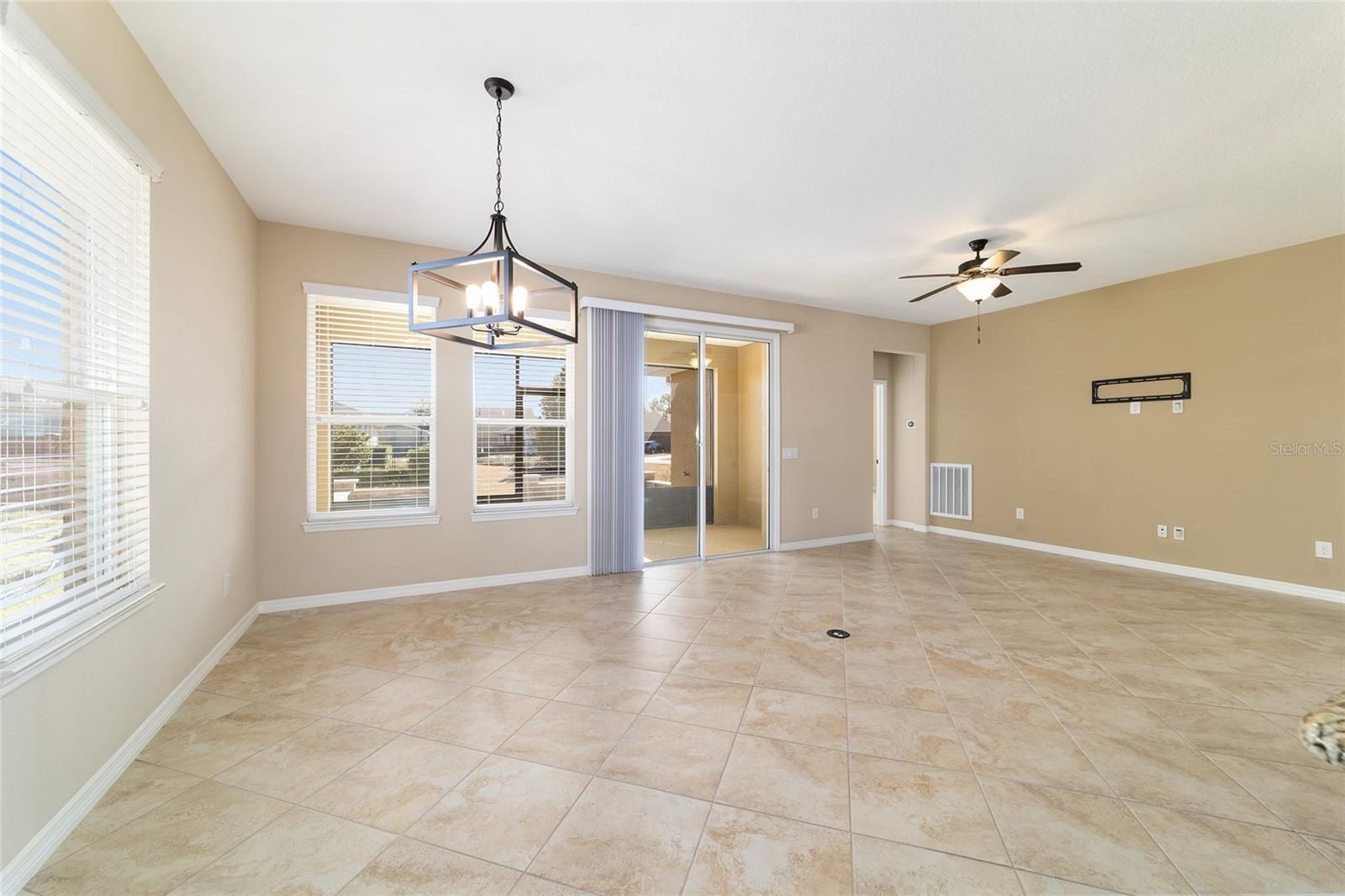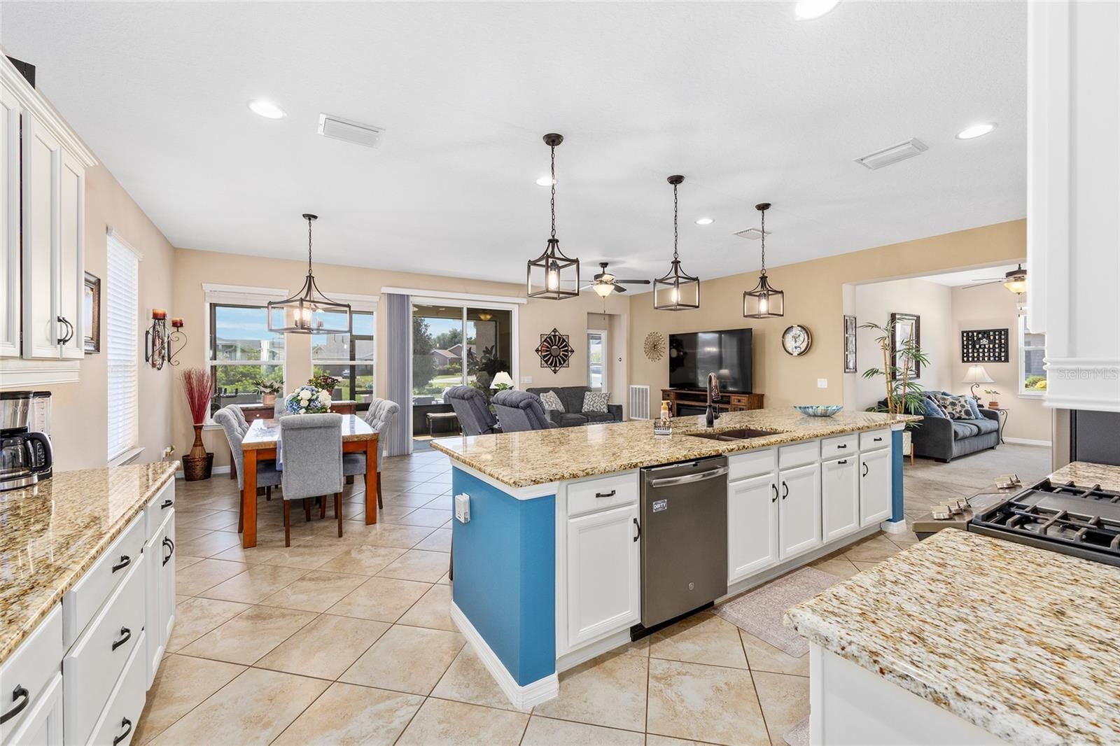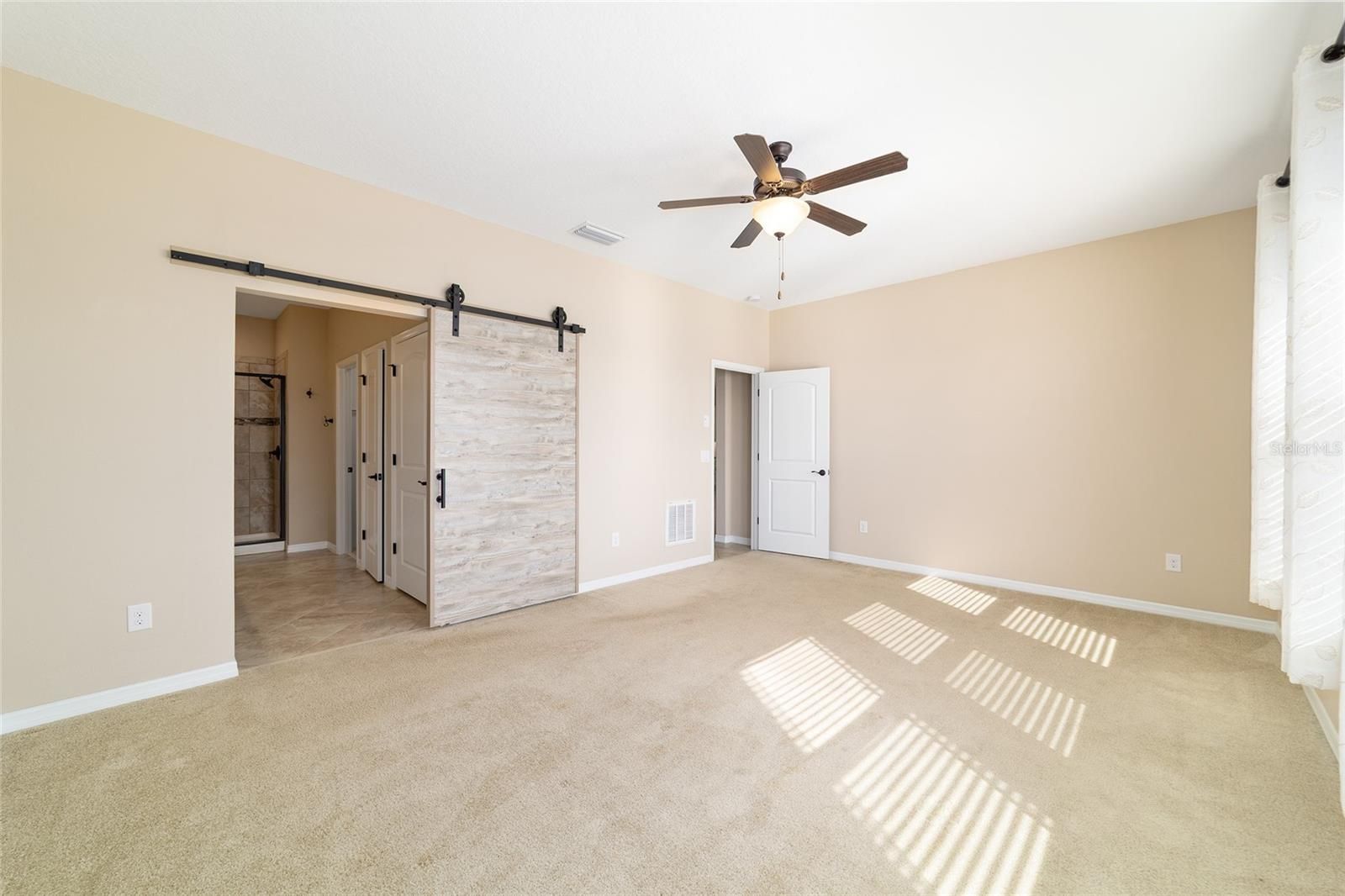 - Built-in Features, Ceiling Fan(s), Eat-in Kitchen, High Ceilings, Kitchen/Family Room Combo, Living/Dining Room, Open Floorplan, Main Level Primary, Stone Counters, Thermostat, Walk-In Closet(s), Window Treatments