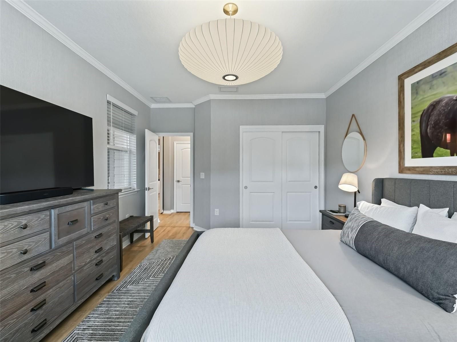 - Ceiling Fan(s), Crown Molding, Eat-in Kitchen, Open Floorplan, Main Level Primary, Solid-Wood Cabinets, Stone Counters, Walk-In Closet(s), Window Treatments