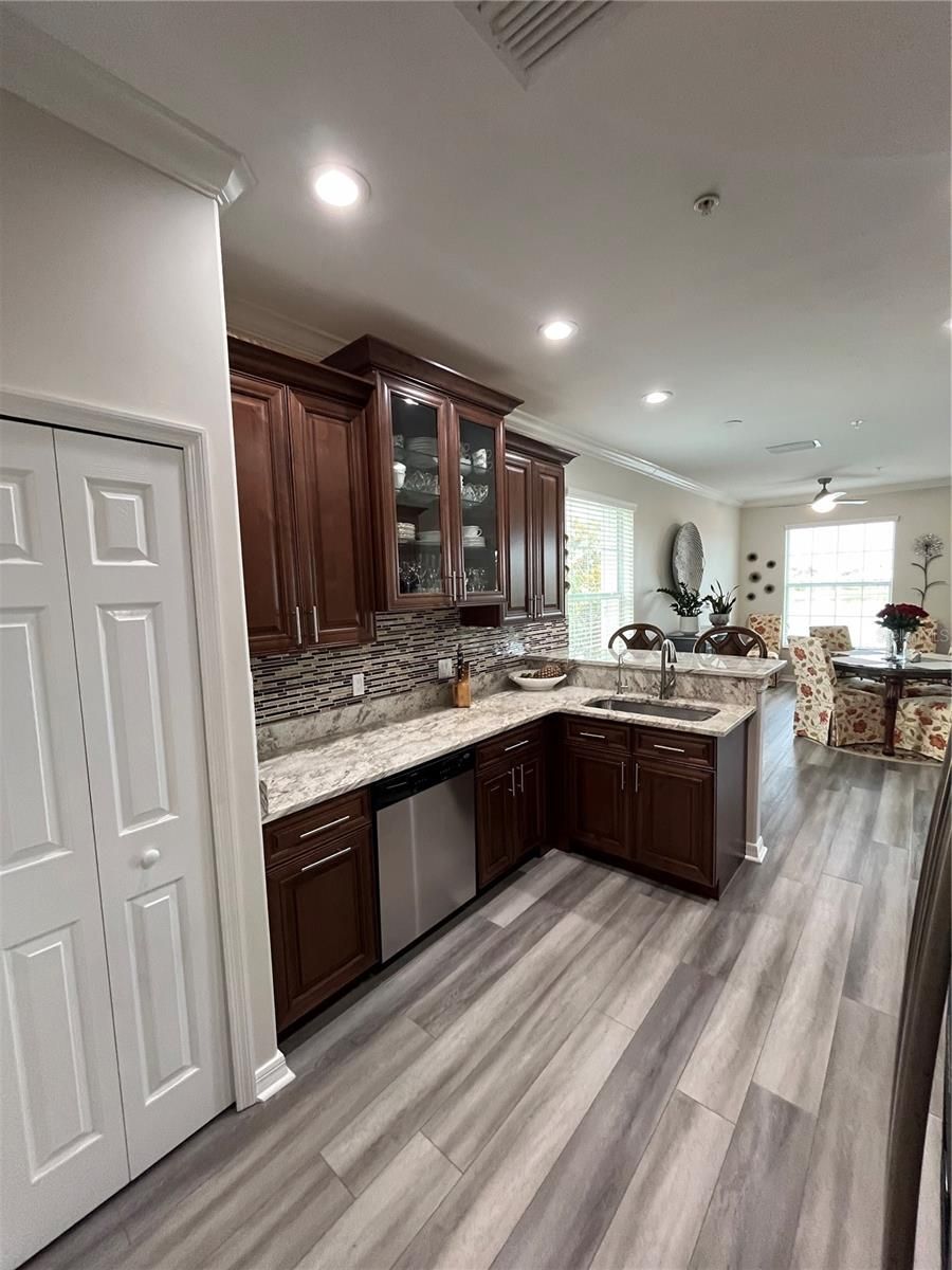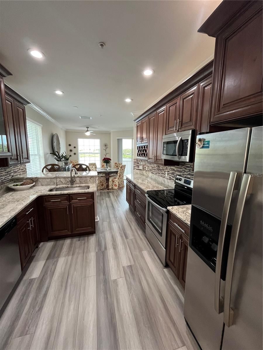 Stunning water views from this immaculate "2-Story" Condo at The Isles on Palmer Ranch-not in a flood zone, minutes away from Siesta Key Beaches! This large 3-bedroom 2-bath, two car garage with storage cabinets and granite work area in the garage. This is a bright and spacious condo that is maintenance free! The location allows for the most exquisite water views, nature & wildlife from the Great Room, Primary Bedroom, Kitchen, Dinette and the screened Lanai. A spacious upgraded kitchen makes cooking and entertaining easy and fun. Kitchen has new cabinets new granite and backsplash with new led lights with Reverse Osmosis Systems (all installed in 2021). A breakfast bar has been enlarged to accommodate underneath two large cabinets. The primary bathroom has dual sinks, a separate shower, a garden large tub, well-organized walk-in-closet. Split Plan with 3 Bedrooms, one of bedroom can be use as office with elegant French Doors. Laundry Room (Washer & Dryer included), Hurricane Shutters that can be closed in 5 minutes from inside of the unit (installed in 2024) & a Security System are added bonuses that includes in HOA dues. Additional Updates include Air conditioner and air handler (installed in 2022). Whole unit has new vinyl flooring, new light fixture and ceiling fans, crown molding (all upgraded in 2021). The Community has resort style amenities including a huge heated lagoon pool, lighted tennis courts, basketball court, bocce courts, pickleball court, playground, walking trails & a shuffleboard court. The clubhouse has meeting/dining/card rooms, kitchen, fitness center & an Activities Director and onsite management. HOA fees covers TV Cable, Internet, ADT Alarm System, Water, Trash removal, Exterior maintenance. All located within the master planned community of Palmer Ranch with nearby shopping, Publix, Costco, medical facilities & I-75 access. This Condo is great for a primary or 2nd home with a maintenance free lifestyle with all the benefits of resort living! Minutes from the recently voted #1 Beach in America (Siesta Key Beach) by Trip Advisor! Also minutes away from Legacy Trails.