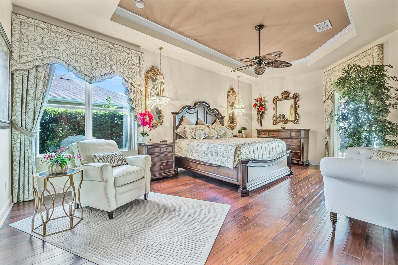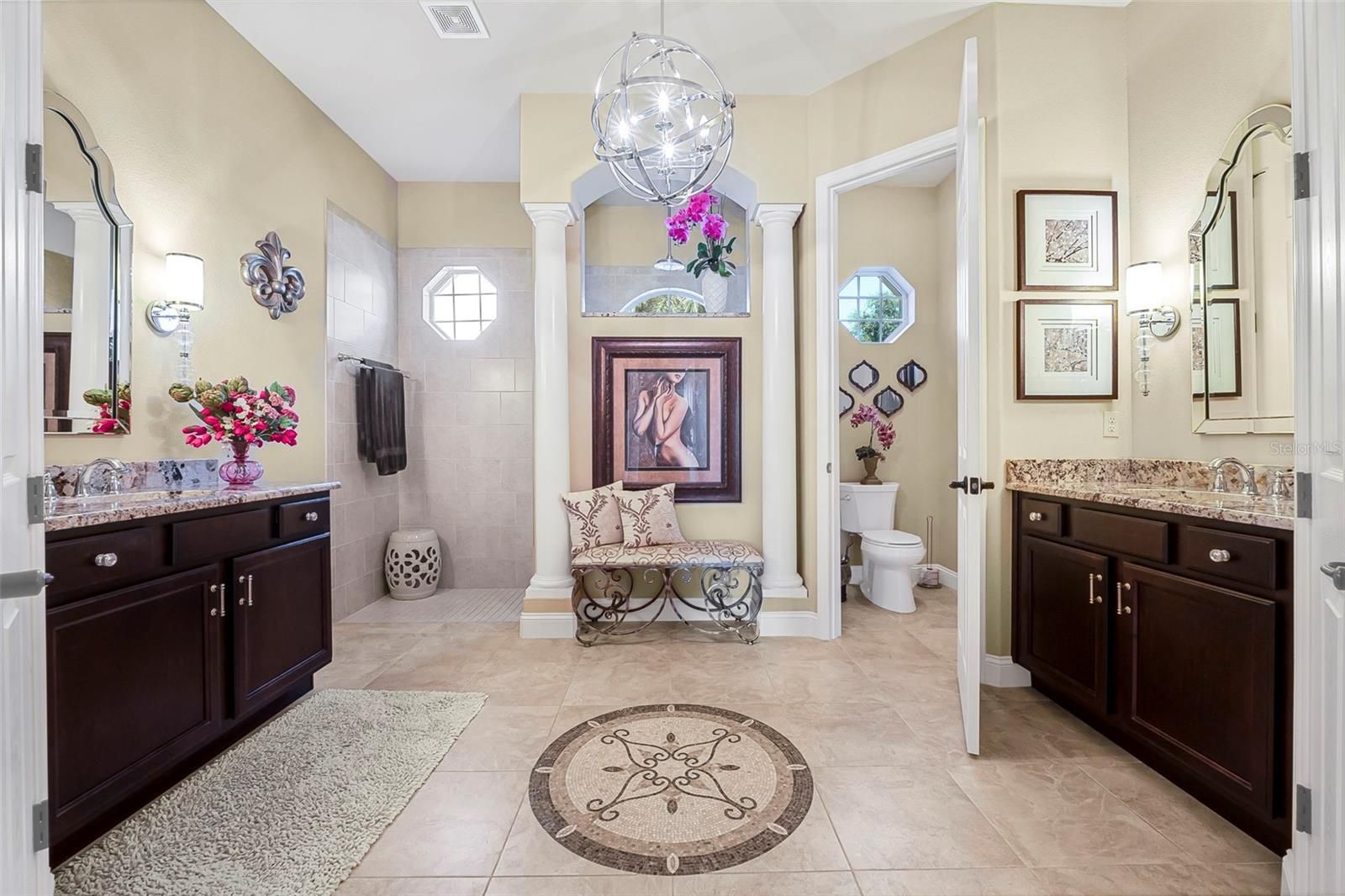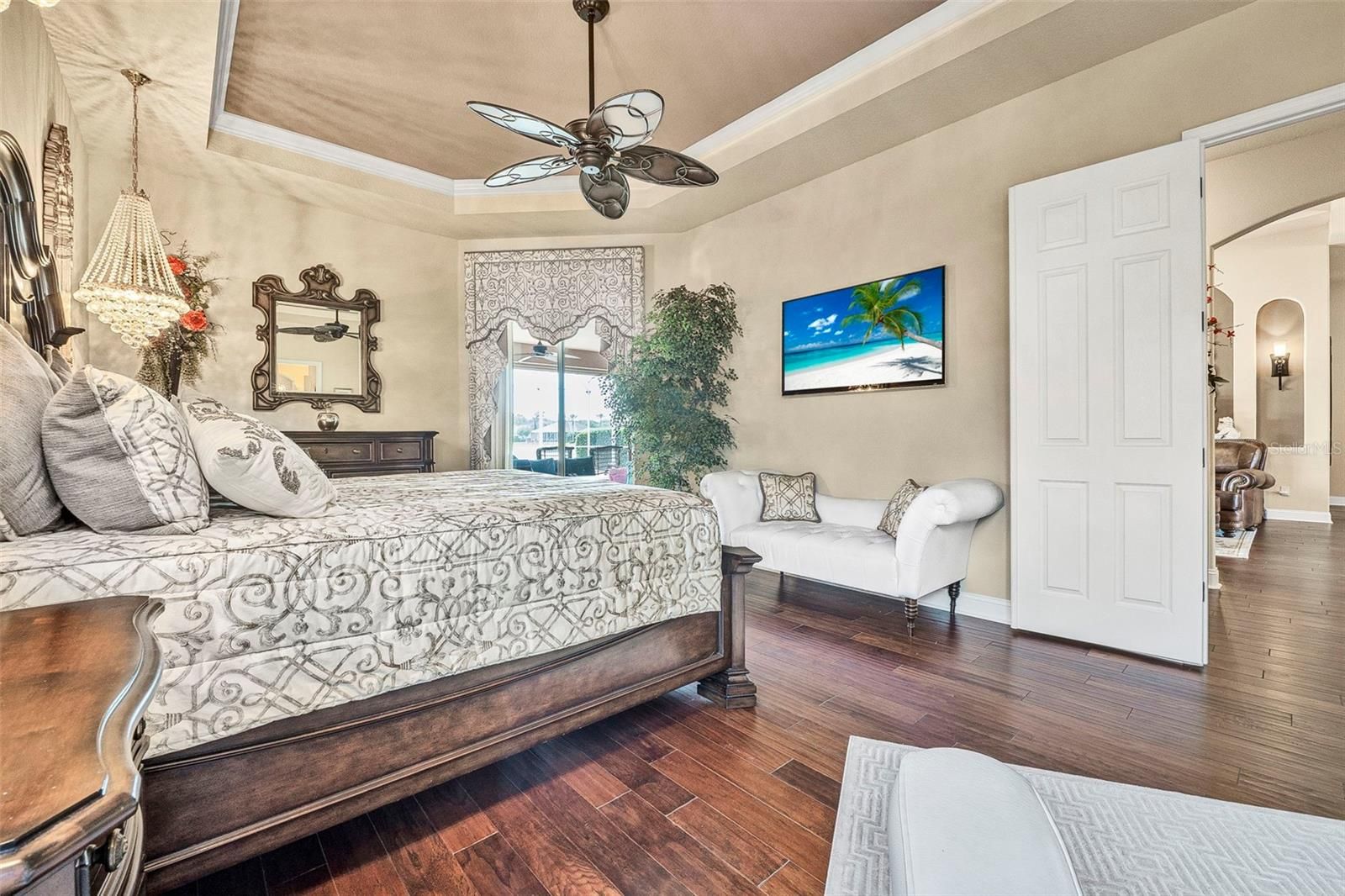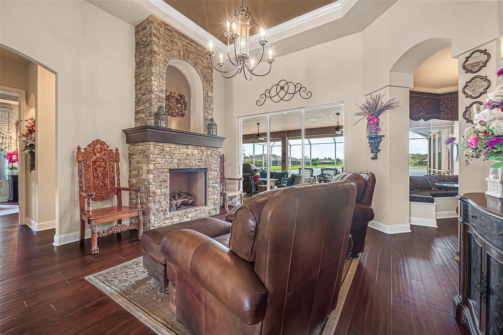Welcome to 568 Luna Bella Lane, a luxurious lakefront estate nestled in the renowned Promenade Parke part of Venetian Bay in New Smyrna Beach. This beautifully appointed custom home offers over 3,200 square feet of air-conditioned living space, combining elegance, comfort, and functionality in one of the most sought-after communities in Volusia County. From the moment you arrive, you'll be captivated by the home’s commanding presence, enhanced by lush landscaping and double leaded glass entry doors. Step inside to discover soaring ceilings and refined architectural details such as coffered ceilings, crown molding, and rounded archways. The spacious split floor plan includes three generously sized bedrooms, three full bathrooms, and a half pool bath, providing the perfect blend of privacy and openness for both everyday living and entertaining. The heart of the home is the gourmet kitchen, thoughtfully designed with a large granite island, custom cabinetry, walk-in pantry, built-in seating with storage, and a separate coffee bar area. It opens seamlessly to the great room and dining area, allowing you to stay engaged with guests while preparing meals. Just off the main living space is a custom-designed wine room that holds up to 200 bottles of wine, offering an ideal climate-controlled space for collectors and enthusiasts. This room can also be easily converted into an office or den to suit your needs. The primary suites offers luxurious retreats, each with walk-in closets and spa-inspired bathrooms. Whether hosting overnight guests or enjoying multigenerational living, this home accommodates it all in style. Every room is crafted with attention to detail, from designer finishes to the custom mural in the formal dining area. tep outside to your private outdoor oasis, designed with entertainment in mind. The covered lanai features a full summer kitchen, wet bar, and a cozy gas fire pit. The screened saltwater pool with solar heating overlooks a tranquil fountained lake, creating a serene backdrop for alfresco dining, weekend gatherings, or peaceful sunset views. The west-facing side of the home also includes electric hurricane shutters for added peace of mind. Additional features include a two-car garage, fully furnished interiors with curated antiques and custom upholstery, and meticulous landscaping framed by concrete borders. Located within Venetian Bay, residents enjoy access to top-tier amenities including an 18-hole championship golf course, fitness center, walking and biking trails, and dining options—all just minutes from New Smyrna Beach’s charming downtown and coastal attractions.