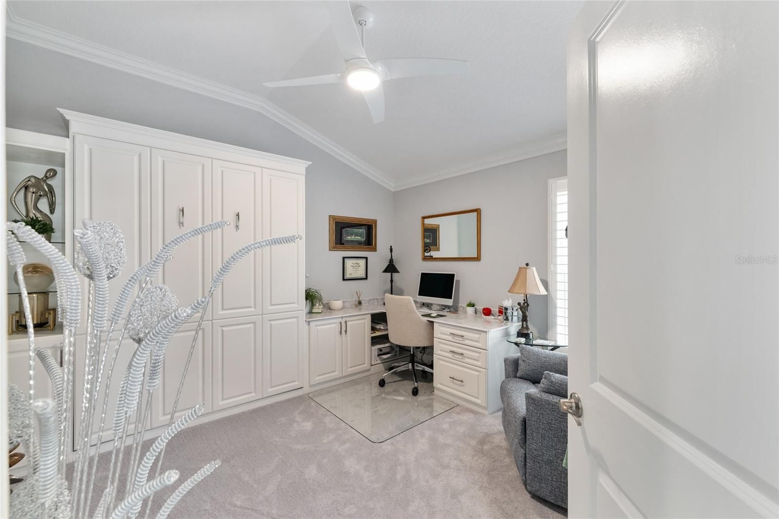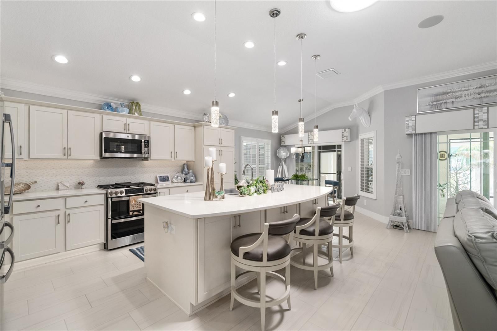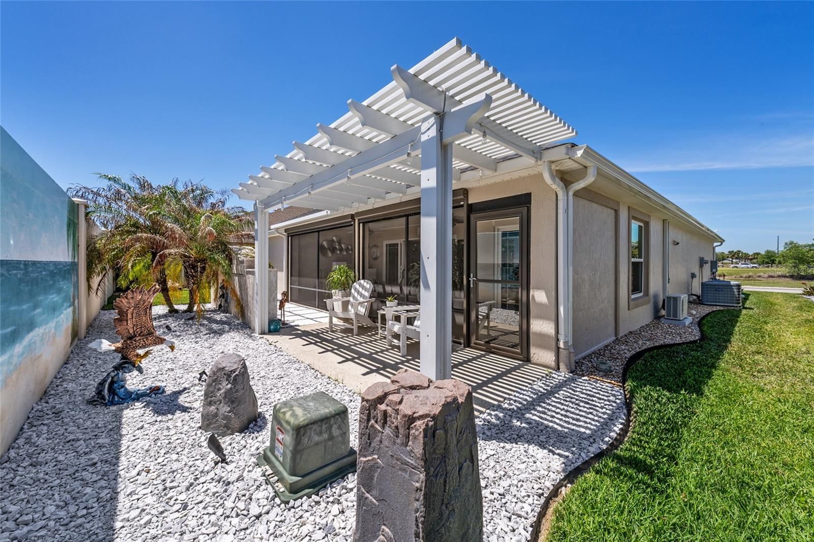 Welcome to this beautifully upgraded 3-bedroom, 2-bath Iris model located in the highly sought-after Village of Linden Isles—an exclusive enclave uniquely situated on its own island within the Village of Linden. WITH A PAID BOND, Built in 2019, this home offers the perfect blend of modern design, luxury upgrades, and everyday comfort. Step inside to discover an open and inviting floor plan featuring tile flooring throughout the main living areas and plush carpeting in the bedrooms. The kitchen is a true showstopper, boasting quartz countertops, stainless steel appliances, a stylish tiled backsplash, under-cabinet lighting, and thoughtfully designed cabinetry with pull-outs and a Lazy Susan for maximum functionality. The home is loaded with high-end finishes including CROWN MOLDING, PLANTATION SHUTTERS, custom valances, and upgraded lighting and fixtures throughout. A custom-built entertainment center with an electric fireplace anchors the living space, while a second fireplace on the lanai creates the perfect setting for relaxing or entertaining year-round. Natural light pours in through 4 SOLAR TUBES thoughtfully placed throughout the home—including the living area, laundry room, master closet, guest bath, and garage—creating a bright and airy atmosphere. The spacious primary suite features tray ceilings with custom lighting, a beautifully updated walk-in tiled shower, and a CUSTOM DESIGNED CLOSET SYSTEM. Bedrooms two and three also include custom closets, with bedroom two offering a convenient Murphy bed for flexible guest space. Enjoy Florida living at its finest on the climate-controlled lanai, complete with a MINI SPLIT A/C and heat, ELECTRIC SHADE SCREENS, and a peaceful ambiance with the lanai over looking a tranquil WATERFALL FOUNTAIN. The home also includes a full-house surround sound system, a smart garage door opener, epoxy-coated garage floors, attic access with MAGIC ATTIC STAIRS AND LIFT, radiant barrier insulation, and a whole-home water filtration system. Outside, you’ll love the exceptional curb appeal with mature landscaping, a PERGOLA OVER YOUR CONCRETE GRILL PAD, decorative rock beds, a paver driveway, and tranquil water features in both the front and back. Plus, enjoy serene water views from the front of the home, a true BONUS. This meticulously maintained, move-in-ready home offers luxury, functionality, and an unbeatable location with close proximity to BROWNWOOD, SAWGRASS, FENNEY, MIDDLETON, & EASTPORT. It was truly placed perfectly —schedule your private showing today!