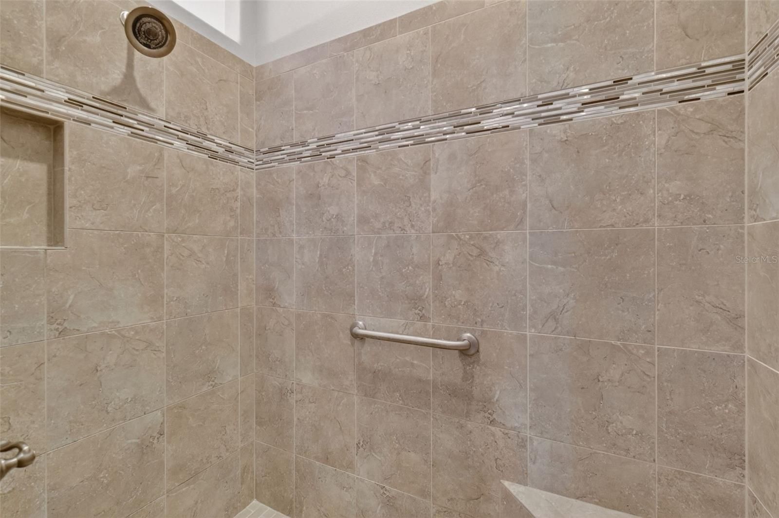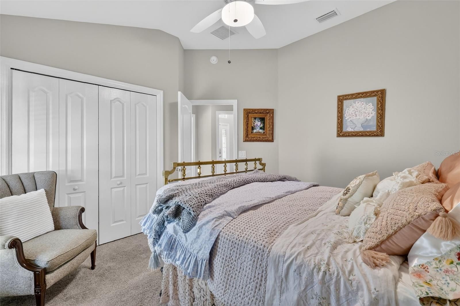- Ceiling Fan(s), Eat-in Kitchen, High Ceilings, Living/Dining Room, Open Floorplan, Main Level Primary, Split Bedrooms, Stone Counters, Thermostat, Vaulted Ceiling(s), Walk-In Closet(s)