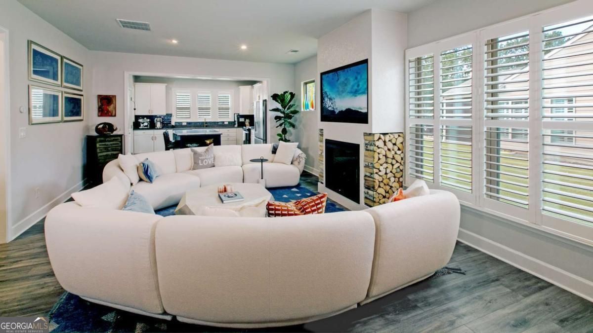 Welcome to this bright and inviting home, ideally located on a premium lot in a quiet cul-de-sac with peaceful wooded views backing up to Duncan Creek! Nestled in the sought-after 55+ community of Del Webb Chateau Elan, this residence offers over 1,900 square feet of thoughtfully designed living space, enhanced by numerous upgrades showcasing style and comfort. Inside, the open-concept floor plan features a spacious living room anchored by a stunning gas fireplace with aspen logs. A cozy flex area provides the perfect spot for reading or games. The kitchen is a true standout, showcasing white cabinetry with custom hardware and backsplash, under-cabinet lighting, quartz countertops paired with bold navy island cabinetry, a Lazy Susan for added convenience, and premium appliances-including an LG refrigerator with four ice options (including craft ice), KitchenAid microwave, gas stove, and dishwasher. The owner's suite offers a relaxing retreat. The bathroom features dual vanities, a walk-in shower with bench seating, and a generous walk-in closet. The home also includes a well-appointed guest bedroom and bath, along with a dedicated office-perfect for work, hobbies, or quiet relaxation. Thoughtful upgrades throughout the home include plantation shutters, custom lighting in several rooms, dimmer switches throughout, ceiling fans in both bedrooms and the covered patio, and an instant hot water feature. Upstairs, you'll find a spacious loft with custom built-in twin beds, ideal for grandkids or a multipurpose retreat. Additional storage shelving was installed off the loft room. The two-car garage is painted and includes an EV charger for modern convenience. Outdoor living is a true highlight, with a screened-in covered patio perfect for year-round enjoyment and an extended patio with a gas line for grilling. Enjoy resort-style community amenities including a clubhouse with an indoor pool, jacuzzi, fitness center, library, kitchen and several multi-function rooms, an outdoor pool and grilling area, pickleball and tennis courts, bocci ball and amphitheater. Don't miss the opportunity to make this beautiful home in Del Webb Chateau Elan your own.