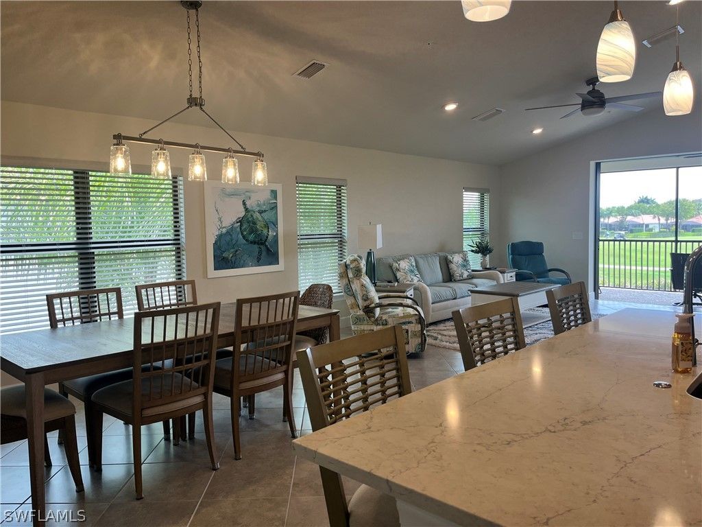 TURNKEY! WATER + GOLF VIEWS! END UNIT CONDO IN DEL WEBB NAPLES. Move right into this beautifully upgraded 2-story condo that lives like a single-family home and shows like a model. Ideally positioned with long lake and golf course views, this light-filled end unit offers privacy, space, and one of the best settings in the community. The open-concept layout features large tile flooring, volume ceilings, and seamless indoor-outdoor living. The kitchen is a standout with quartz countertops, white cabinetry, stainless steel appliances, and a large island perfect for entertaining. Sliding glass doors open to a screened lanai with panoramic water and golf course views—an ideal backdrop for morning coffee or sunset evenings. Upstairs, generously sized bedrooms provide comfortable space for owners and guests, all offered TURNKEY furnished with stylish coastal décor—ready for immediate enjoyment or seasonal use. Paver driveway, attached garage, and low-maintenance living complete the package. Perfect as a full-time residence, winter retreat, or lock-and-leave lifestyle—this is one of the best values in Del Webb Naples. Del Webb’s vibrant 55+ lifestyle includes pickleball, tennis, bocce, golf simulator, lap pool, resort pool, sauna, steam room, fitness center, library, billiards, and a full social calendar — all just a golf cart ride into the heart of Ave Maria for dining, shopping, and entertainment. As we say: "Ave Maria ~ Once you get here you "get it."
