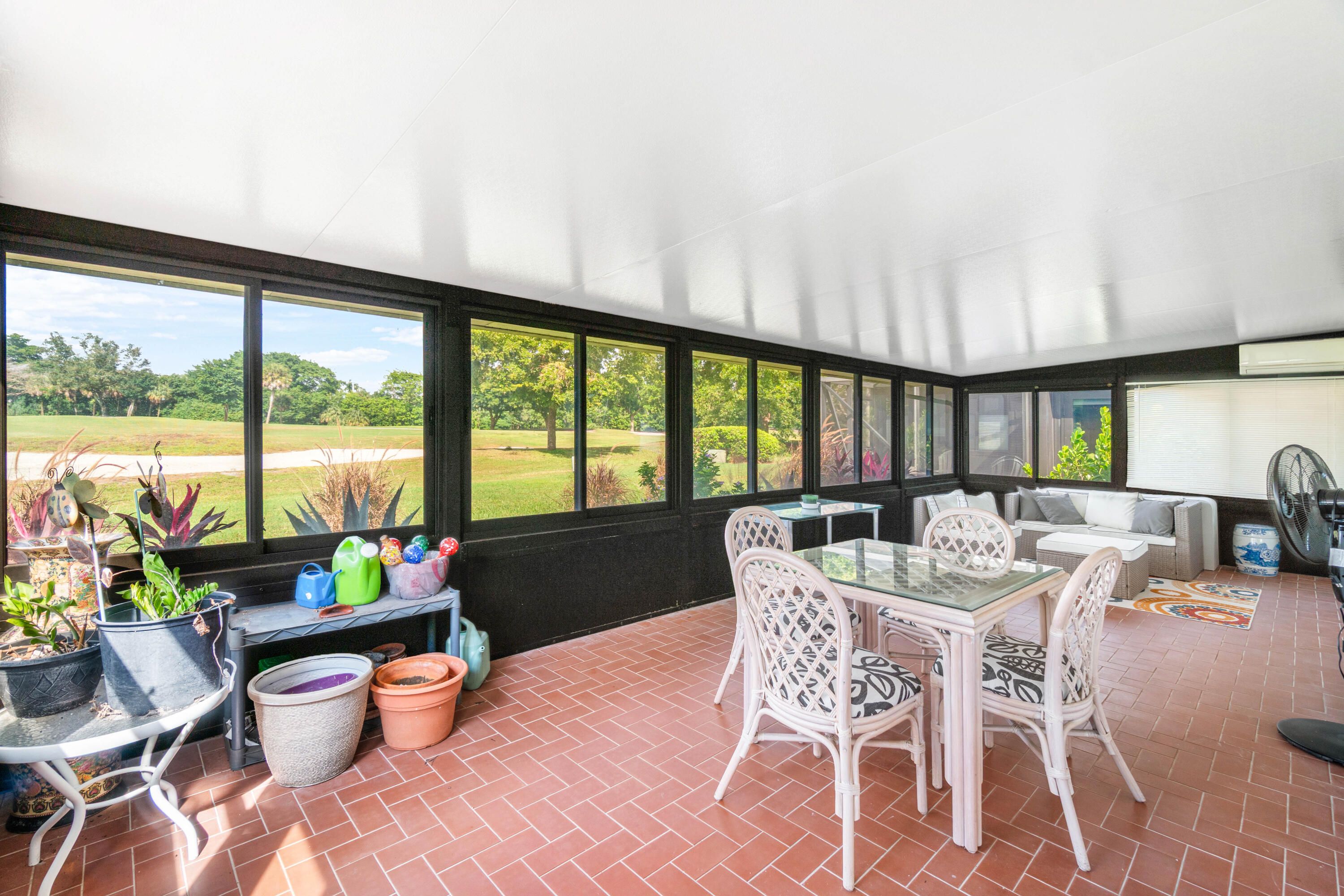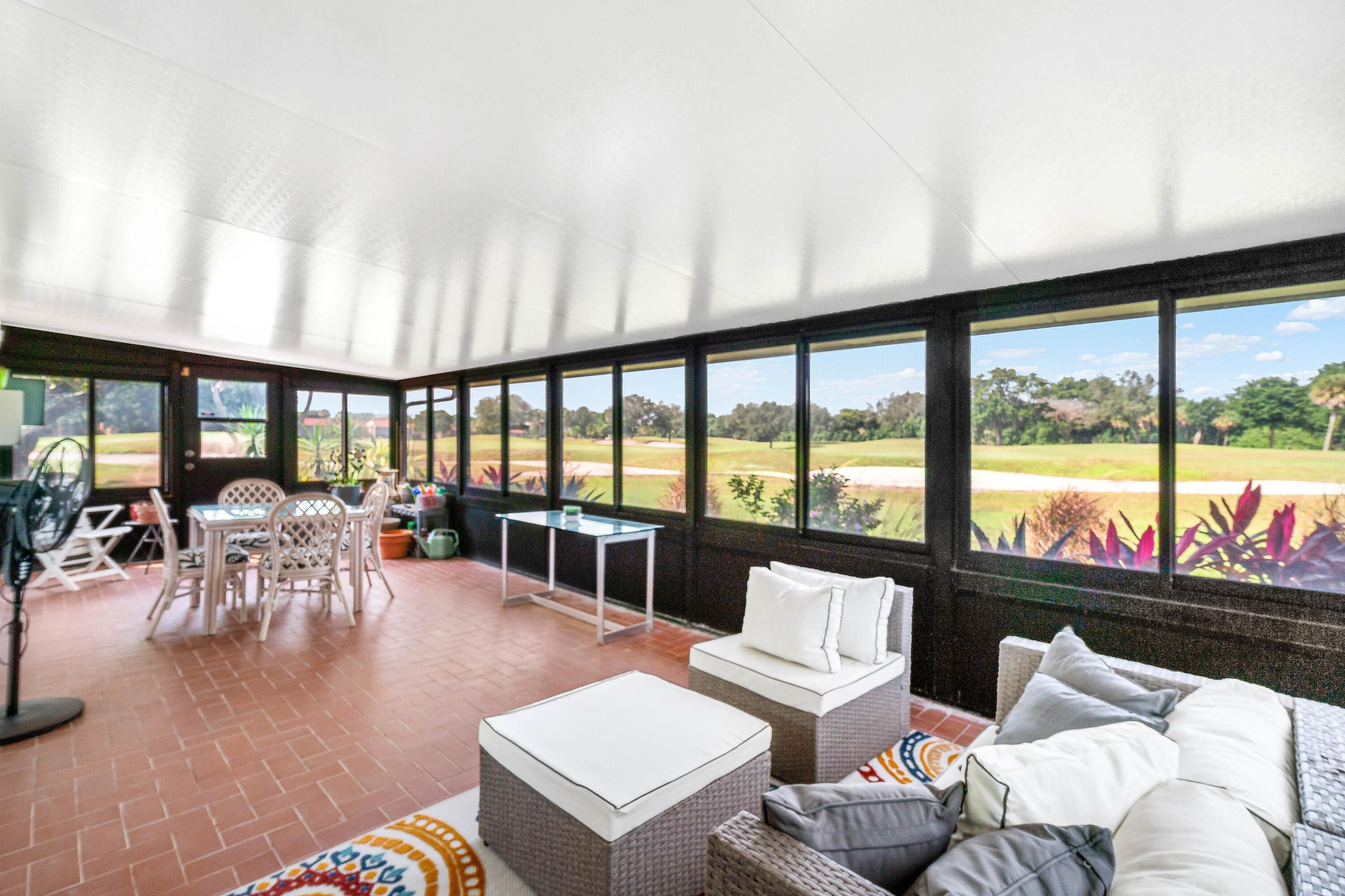 Beautiful golf course views surround this bright and inviting three-bedroom, two-bathroom single-story home. This renovated residence features a stunning modern kitchen with quartz countertops, newer appliances, induction cooktop, and impact windows and sliders throughout. The open floor plan includes a sunken living room, custom closets, and a built-in bar, with no carpeting anywhere in the home. An additional air-conditioned enclosed - patio offers a versatile 270 sq ft bonus room—perfect for relaxing or entertaining while enjoying the serene golf views. Thoughtfully designed for accessibility, the home includes a wheelchair-friendly ramp from the garage and a roll-in shower. Light, bright, and private—this home is move-in ready and beautifully updated inside and out