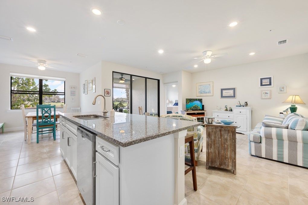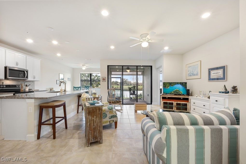 5698 MAYFLOWER WAY, Unit #403 - (RARELY AVAILABLE---> GUEST BATHROOM HAS A TUB/SHOWER Combo) FURNISHED TURNKEY! TASTEFULLY DECORATED HOME w/GOLF COURSE & WATER VIEWS!! - 1st Floor HERON Model Carriage Home; Move-In Ready! A SUPER-GREAT VALUE! Water, Cable TV & High Speed Internet INCLUDED in Condo fees! Features 3 Bedrooms, 2 Full Bathrooms, Accordian Style Hurricane Shutters Providing Maximum Storm Protection. Screened Lanai w/Fabric Roll Down Protection, Tiled in Main Areas, Luxury Vinyl Tile in Bedrooms, Plantation Shutters, Breakfast Nook. Screened Entry w/added Glass Insert in Front Door. East Exposure Provides Premium Year Round Sunrises!! This 55+ Active LifeStyle Community Condominium Complex is Complemented With it's Own Beautiful Exclusive Private Community Pool, Hot Tub, Restrooms & Grills/Dining Area (Exclusive to Mayflower Way Condo Unit Owners). Walking Distance To South Park w/Nature Trails, Lakes and Dog Park. Public 18 Hole Championship Golf Course is Close By, Memberships available. The Del Webb Oasis Club Resort Style Amenity Center features 2 Clubhouses, Activity Director, Resort Style Pool, Lap Pool, Fitness Center, Sauna/Steam Room, Salon, Business Center/Library, Catering Kitchen, Community Patio w/Grill, TV, Fire Pit, Pickle Ball/Bocce/Tennis Courts. Well Managed Condo Association!