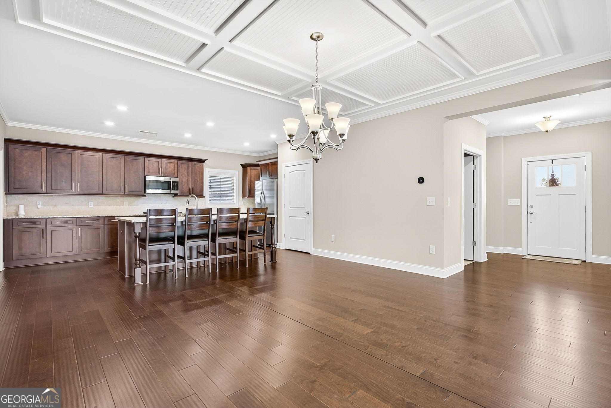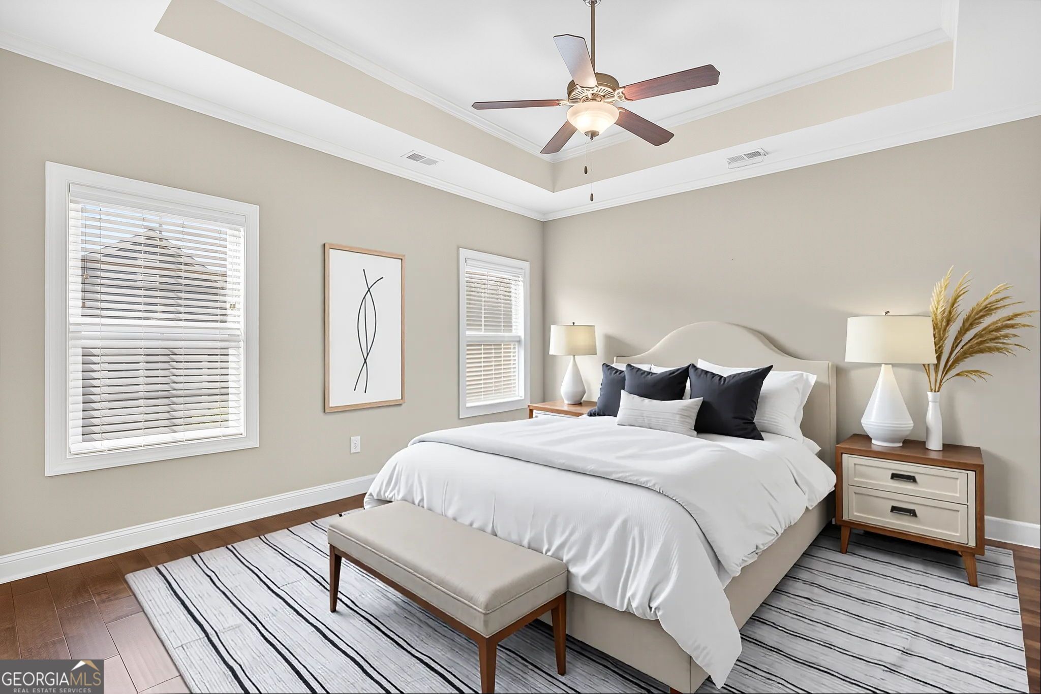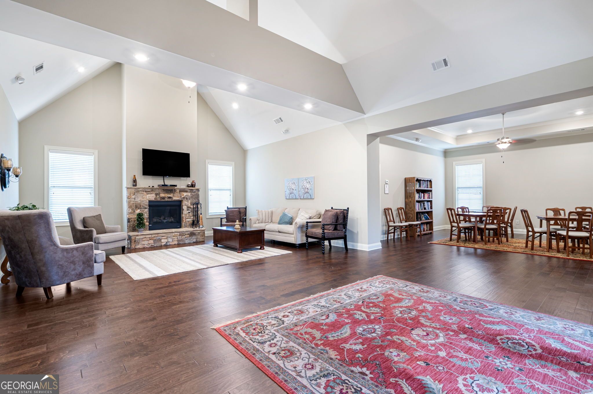 Welcome to 57 Cedarcrest Village Lane, a beautifully appointed home in the sought-after Cedarcrest Village active adult community. This residence combines thoughtful design, timeless finishes, and a prime location near neighborhood amenities. Step onto the inviting covered front porch with epoxy flooring and sunshades-perfect for morning coffee or evening relaxation. Inside, the home greets you with high ceilings, crown molding, and rich hardwood floors that extend throughout the main living areas, creating a warm and open atmosphere. A cozy remote-controlled gas fireplace anchors the open-concept great room that flows seamlessly into the dining area, highlighted by an elegant coffered ceiling. The gourmet kitchen is designed for both everyday living and entertaining, featuring a large center island with a breakfast bar, granite countertops, gallery stainless steel appliances, and a large pantry. The primary suite is a true retreat, featuring a tray ceiling, a luxurious ensuite bath complete with a double vanity and a stepless tile shower with a bench, as well as a spacious walk-in closet with a convenient pass-through to the laundry room. A guest bedroom or home office with access to a full bathroom completes the main level. Upstairs, a versatile flex room with its own full private bathroom offers endless possibilities-whether as a third bedroom, media room, or craft space. Additional highlights include a large walk-in floored attic and two-car garage with epoxy flooring and storage. Close walk to the community clubhouse, which features a lounge, fitness center, catering kitchen, and library. Bentwater Golf Club, Acworth Health Park, shopping, and dining are just minutes away. With its thoughtful layout and low-maintenance design, this home is perfect for those seeking to simplify their lifestyle without sacrificing style or comfort. Schedule a showing today!
