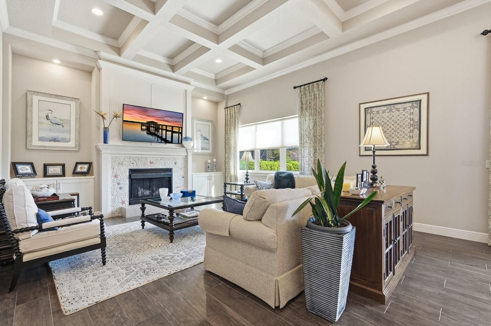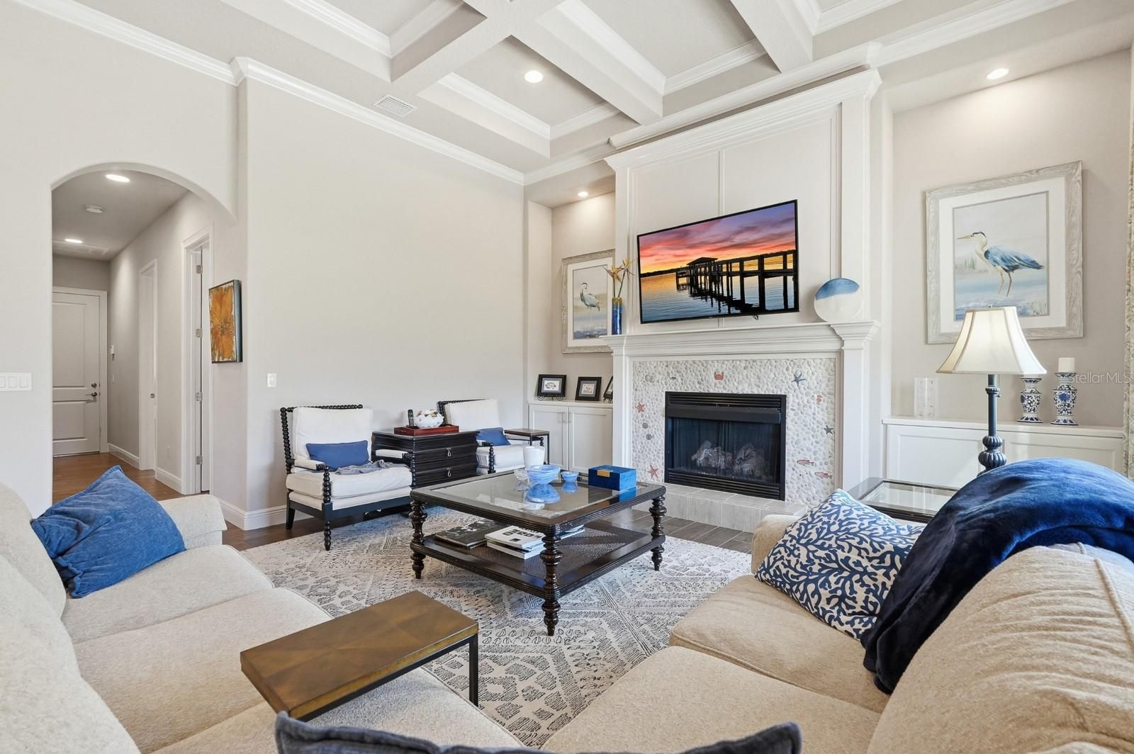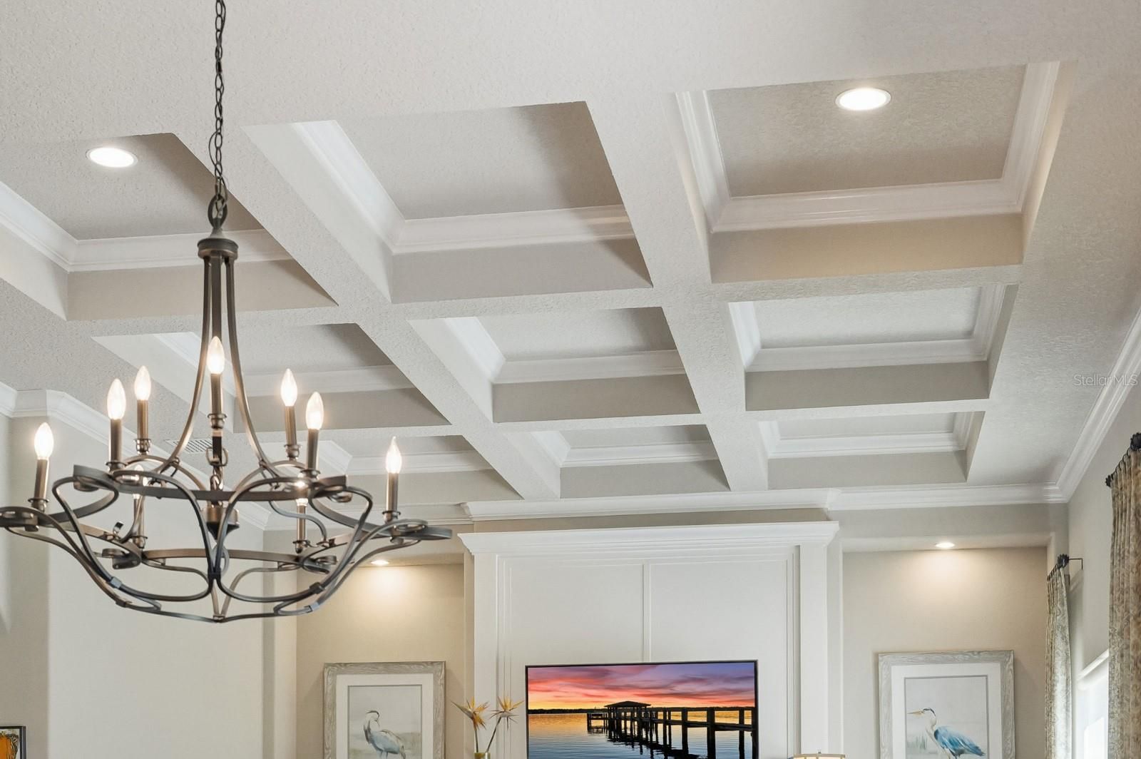 - Coffered Ceiling(s), Crown Molding, High Ceilings, Kitchen/Family Room Combo, Living/Dining Room, Open Floorplan, Main Level Primary, Solid Surface Counters, Solid-Wood Cabinets, Split Bedrooms, Walk-In Closet(s), Window Treatments