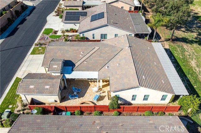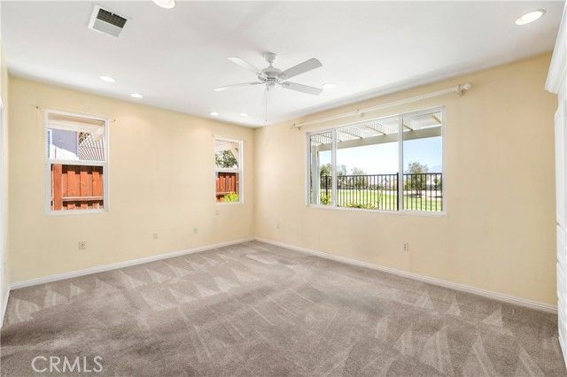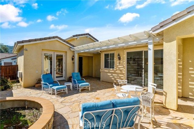 Experience resort-style living in this beautiful Championship 2 floor plan located in the highly desirable, gated Four Seasons Hemet 55+ community with scenic golf course and mountain views. This home offers 3 bedrooms and 2.5 bathrooms, including a detached casita with its own ¾ bath, perfect for guests or a private office. The spacious great room features custom built-ins and ceiling fans throughout, while the kitchen is appointed with granite countertops, a 2-drawer dishwasher and a 5-burner stove. The primary suite includes custom built-ins, a pocket door for added privacy, and an organized closet system. Additional highlights include sound-insulated interior walls, central vacuum, and a garage with epoxy flooring and extensive cabinetry. Enjoy outdoor living in the flagstone courtyard with fountain and covered patios in both the courtyard and backyard, ideal for relaxing or entertaining. Residents enjoy exceptional amenities including 24-hour security, Bistro, ballroom, theatre, fitness center, pool, spa, and multiple recreation courts, all within close proximity to Diamond Valley Lake and Temecula Wine Country.