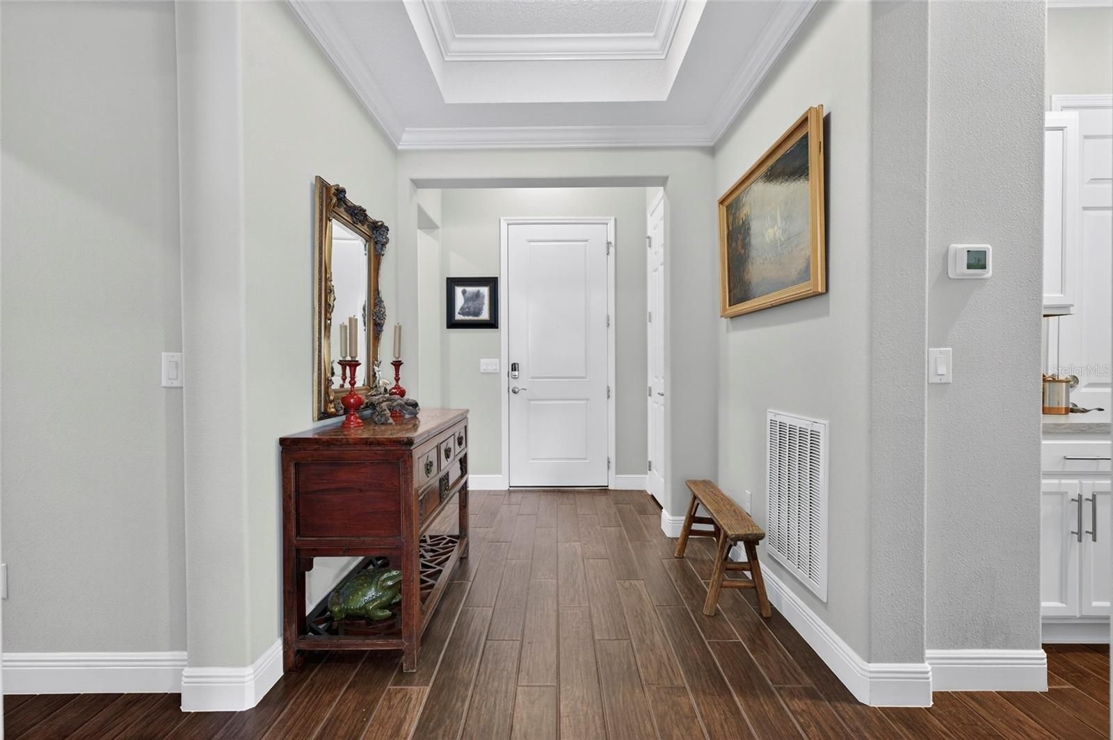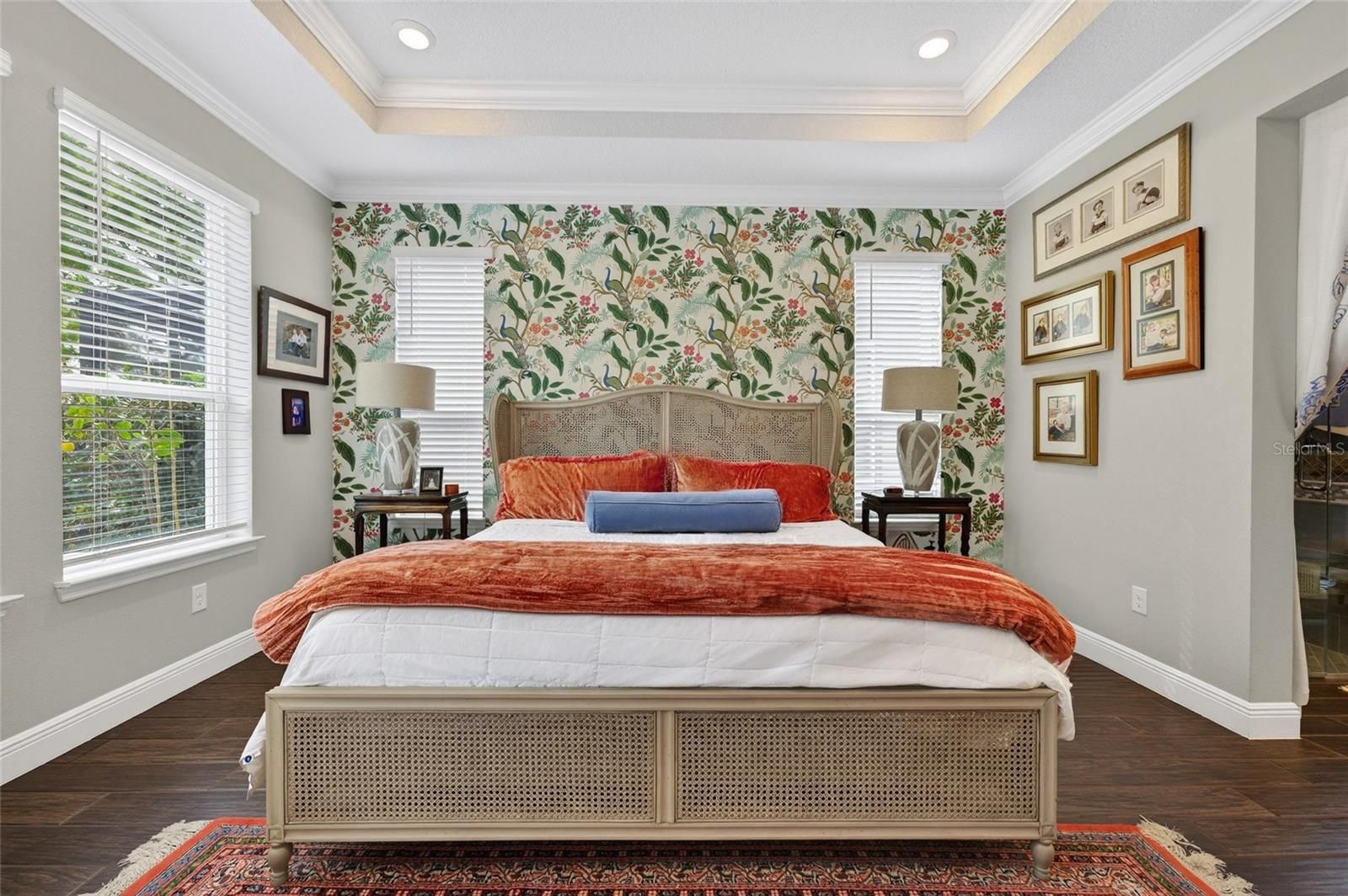 - Eat-in Kitchen, Kitchen/Family Room Combo, Open Floorplan, Solid Surface Counters, Solid-Wood Cabinets, Split Bedrooms, Stone Counters, Thermostat, Tray Ceiling(s), Walk-In Closet(s), Wet Bar