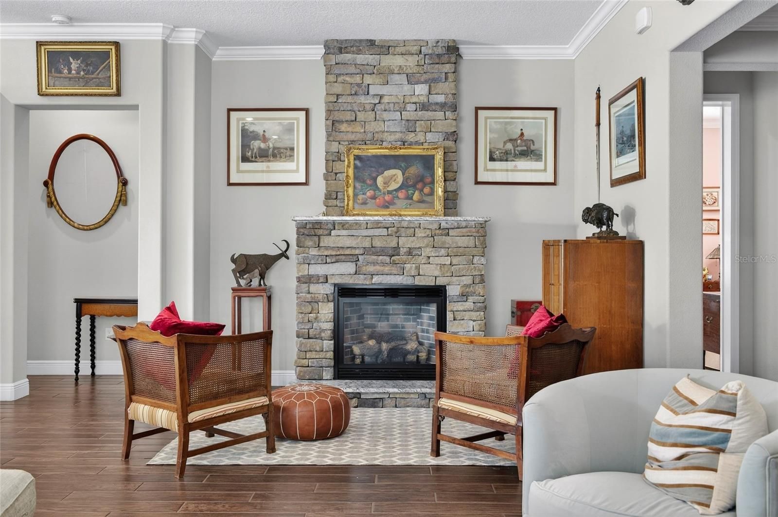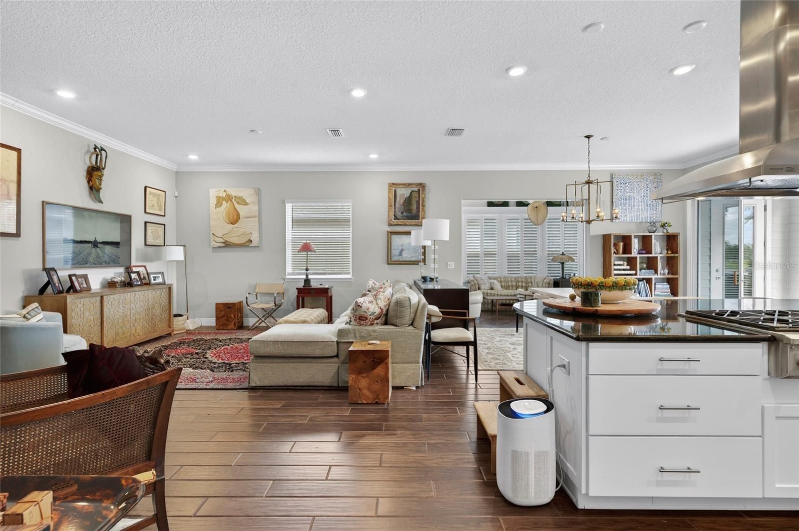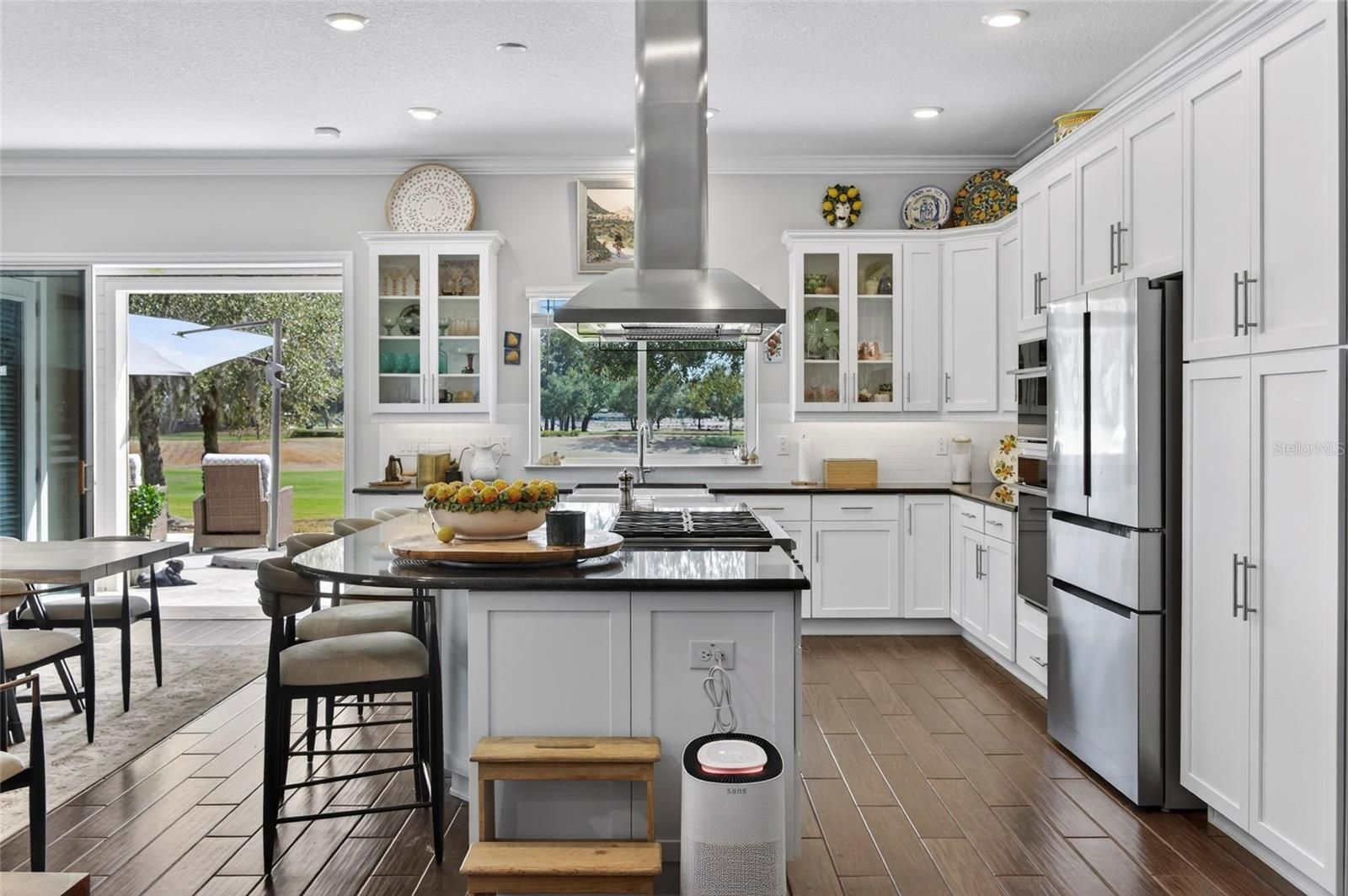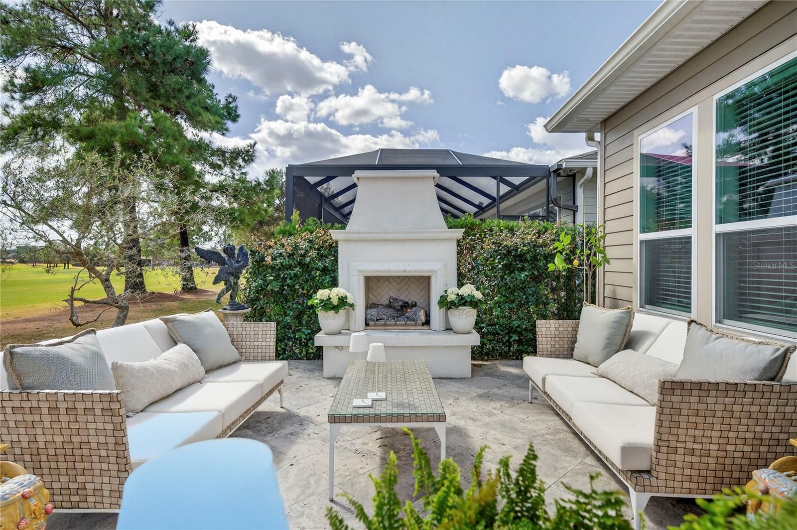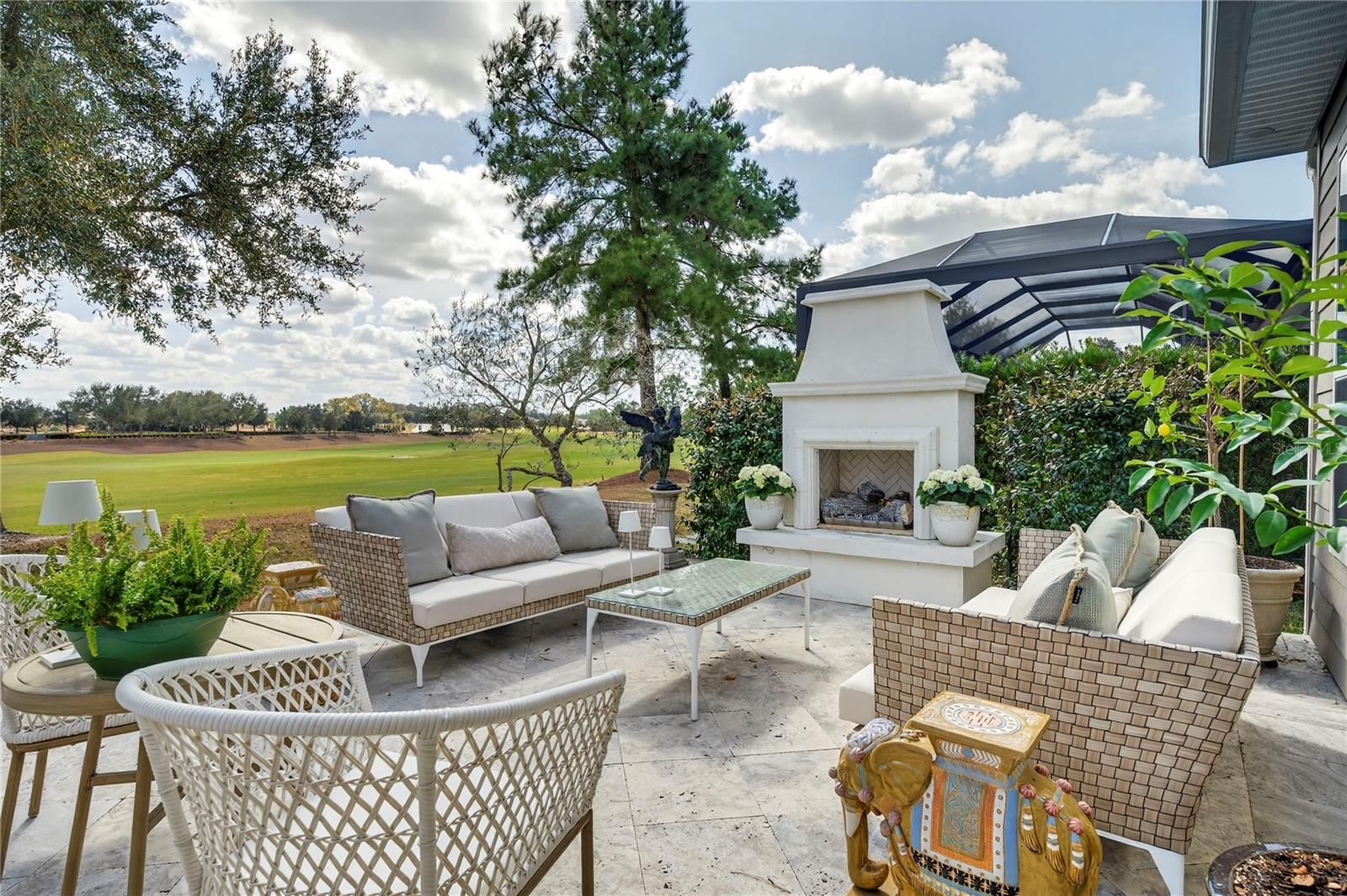 Welcome to this gorgeous golf course home ideally positioned on the 14th hole, offering beautiful views and a relaxed Florida lifestyle. This thoughtfully designed residence features 3 bedrooms, 2½ baths, plus a versatile flex room perfect for an office, hobby space, or additional guest area. Elegant tray ceilings, crown molding, and ceramic tile throughout most of the home create a refined yet comfortable atmosphere, with carpet in two bedrooms for added warmth. The chef's kitchen is a standout, showcasing high-end Bosch and GE appliances, a six-burner stove, farmhouse sink, and upscale finishes that make both everyday living and entertaining a pleasure. A remote controlled gas fireplace in the seating area by the kitchen adds warmth and charm. Stackable sliders open to the lanai, complete with remote-controlled electric privacy screens, while 3M sun tint on the rear and side windows enhances comfort and efficiency. Plantation shutters accent the sunroom, and all closets feature California Custom Closet systems for exceptional organization. Outdoor living is equally impressive with custom travertine tile hardscape on the lanai, a fully equipped outdoor kitchen with a high-end wine cooler, concrete counters, seating for six, and a remote-controlled gas fireplace - perfect for entertaining or unwinding after a day on the course. Additional features include an extended driveway and whole-home water softener. In addition to the golf course, residents enjoy other outstanding community amenities including tennis and pickleball courts, bocce ball, fitness center, Avid Fit Pod, spa, on-site restaurant, Veterans Park, and numerous member-run clubs. Sit back, relax, and enjoy the lifestyle you've been waiting for.
