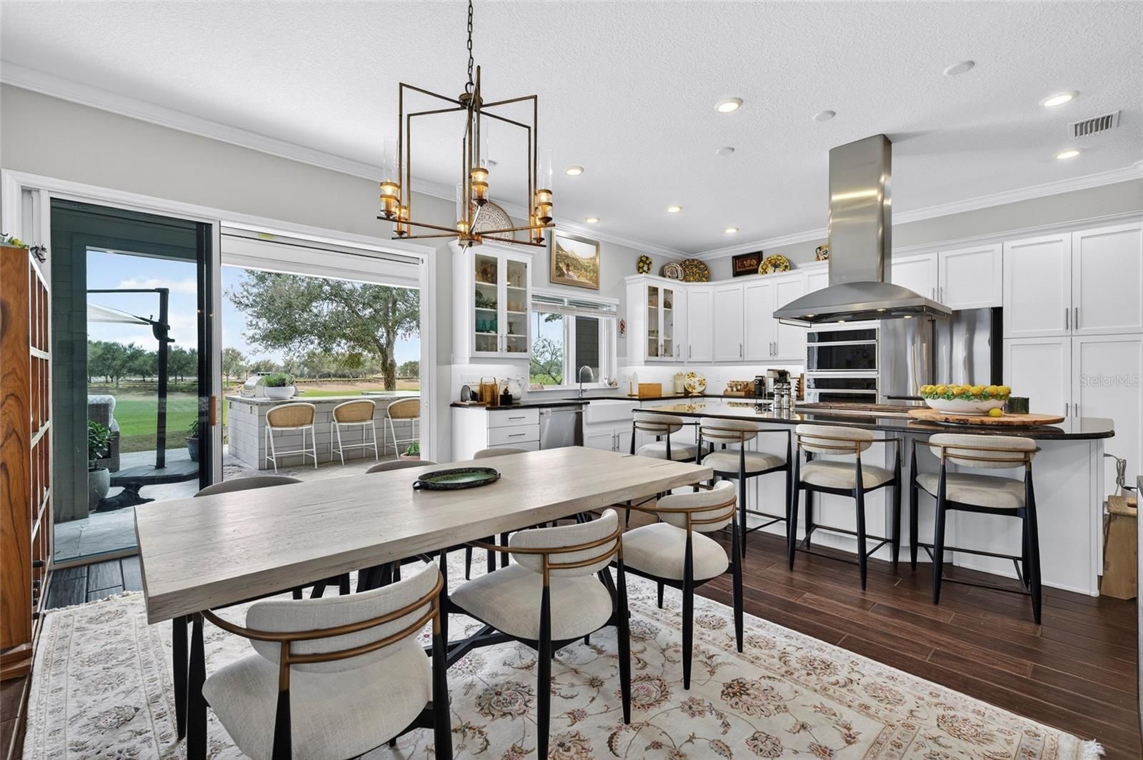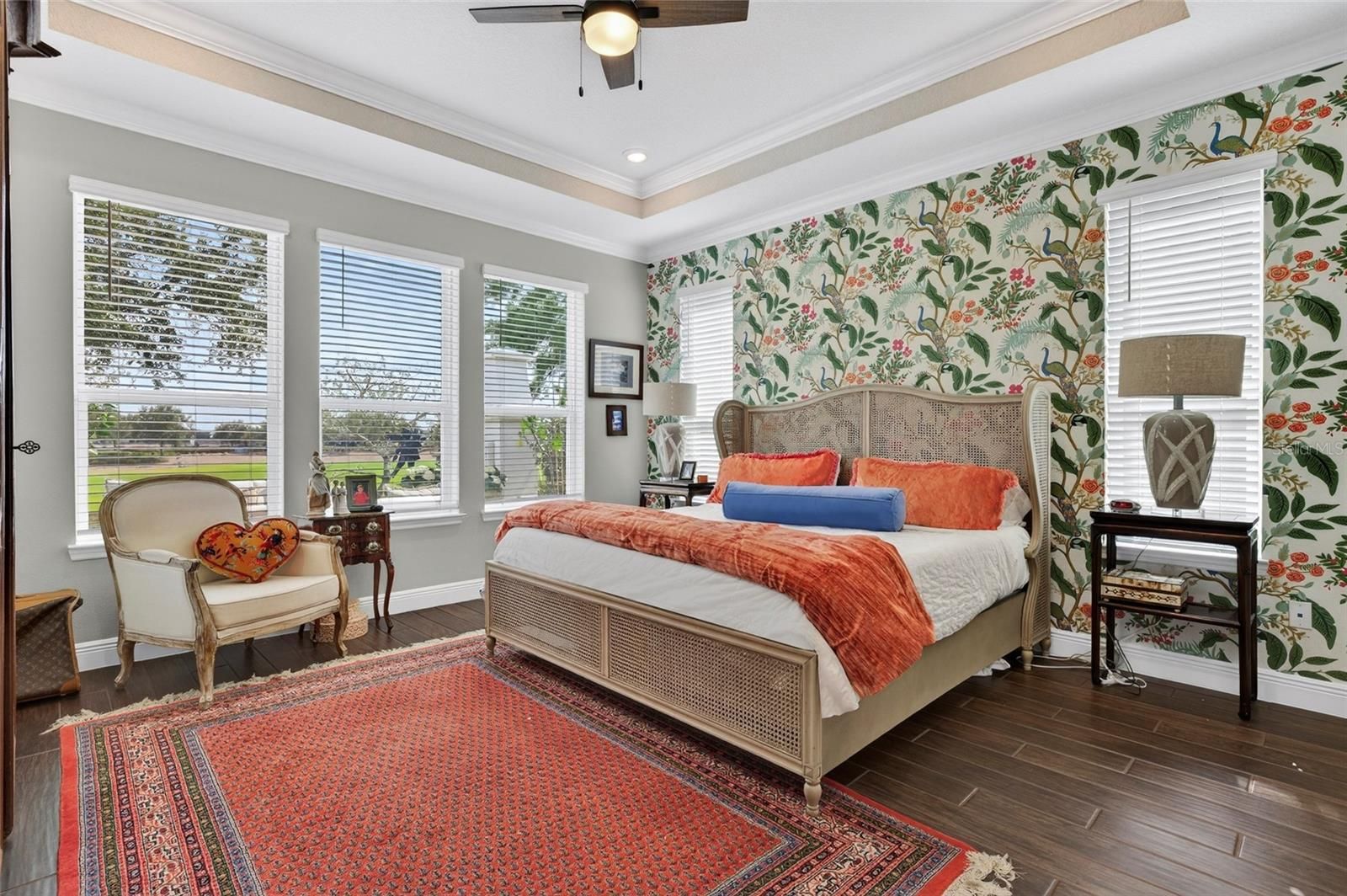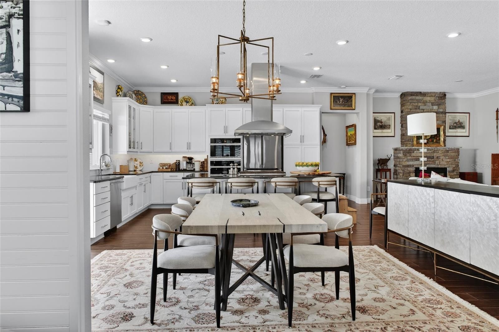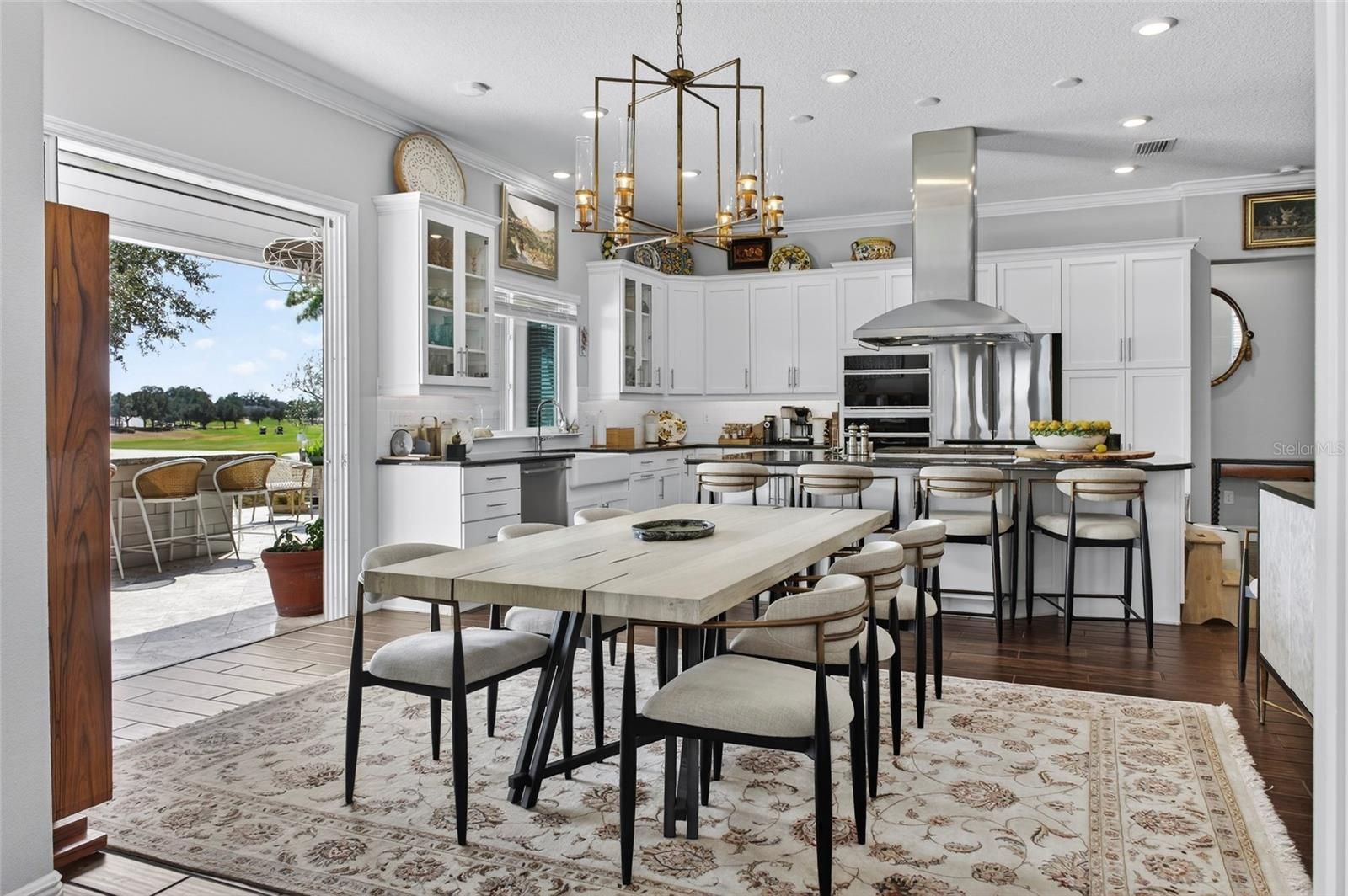 Welcome to this gorgeous golf course home ideally positioned on the 14th hole, offering beautiful views and a relaxed Florida lifestyle. This thoughtfully designed residence features 3 bedrooms, 2½ baths, plus a versatile flex room perfect for an office, hobby space, or additional guest area. Elegant tray ceilings, crown molding, and ceramic tile throughout most of the home create a refined yet comfortable atmosphere, with carpet in two bedrooms for added warmth. The chef's kitchen is a standout, showcasing high-end Bosch and GE appliances, a six-burner stove, farmhouse sink, and upscale finishes that make both everyday living and entertaining a pleasure. A remote controlled gas fireplace in the seating area by the kitchen adds warmth and charm. Stackable sliders open to the lanai, complete with remote-controlled electric privacy screens, while 3M sun tint on the rear and side windows enhances comfort and efficiency. Plantation shutters accent the sunroom, and all closets feature California Custom Closet systems for exceptional organization. Outdoor living is equally impressive with custom travertine tile hardscape on the lanai, a fully equipped outdoor kitchen with a high-end wine cooler, concrete counters, seating for six, and a remote-controlled gas fireplace - perfect for entertaining or unwinding after a day on the course. Additional features include an extended driveway and whole-home water softener. In addition to the golf course, residents enjoy other outstanding community amenities including tennis and pickleball courts, bocce ball, fitness center, Avid Fit Pod, spa, on-site restaurant, Veterans Park, and numerous member-run clubs. Sit back, relax, and enjoy the lifestyle you've been waiting for.