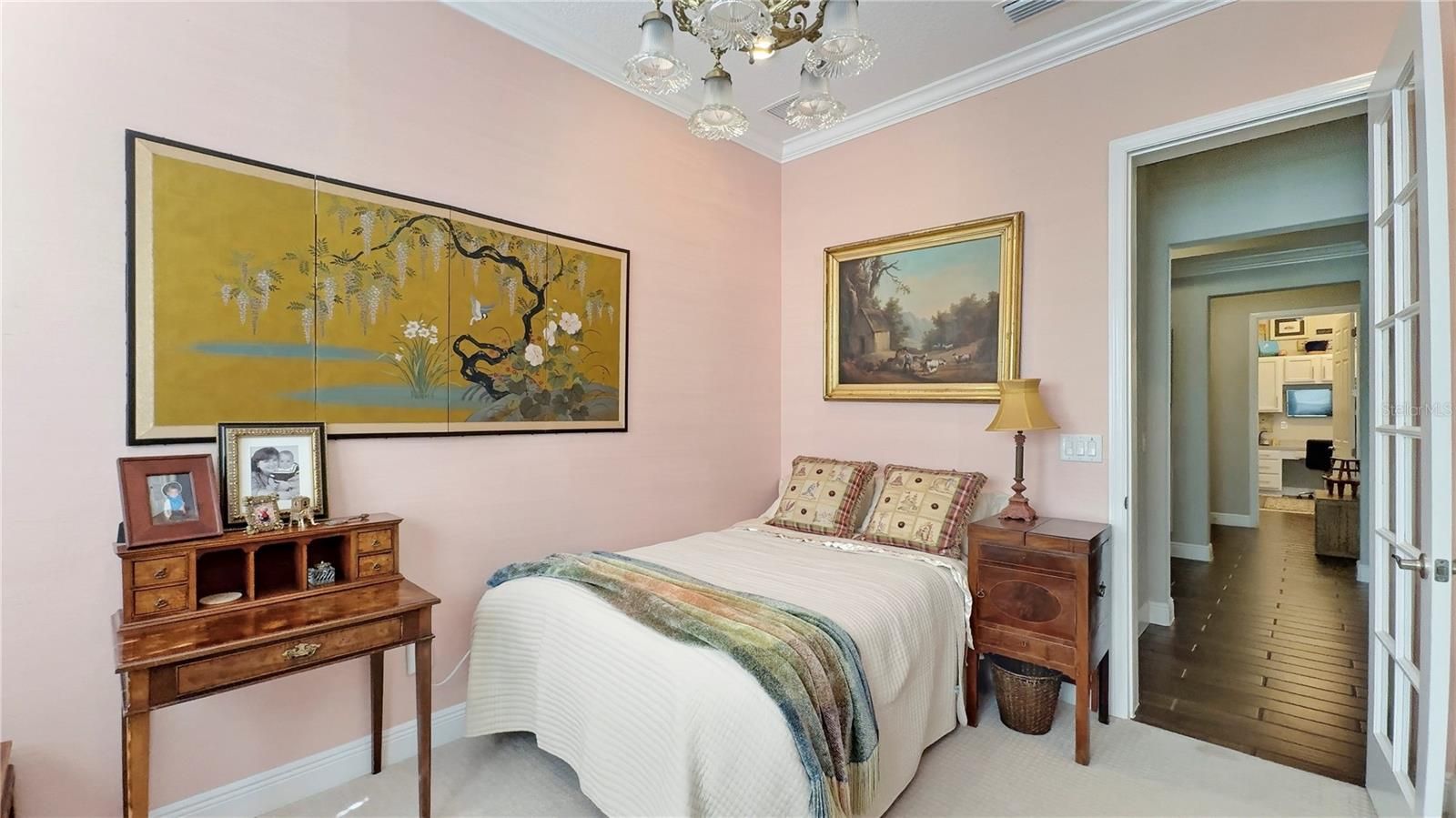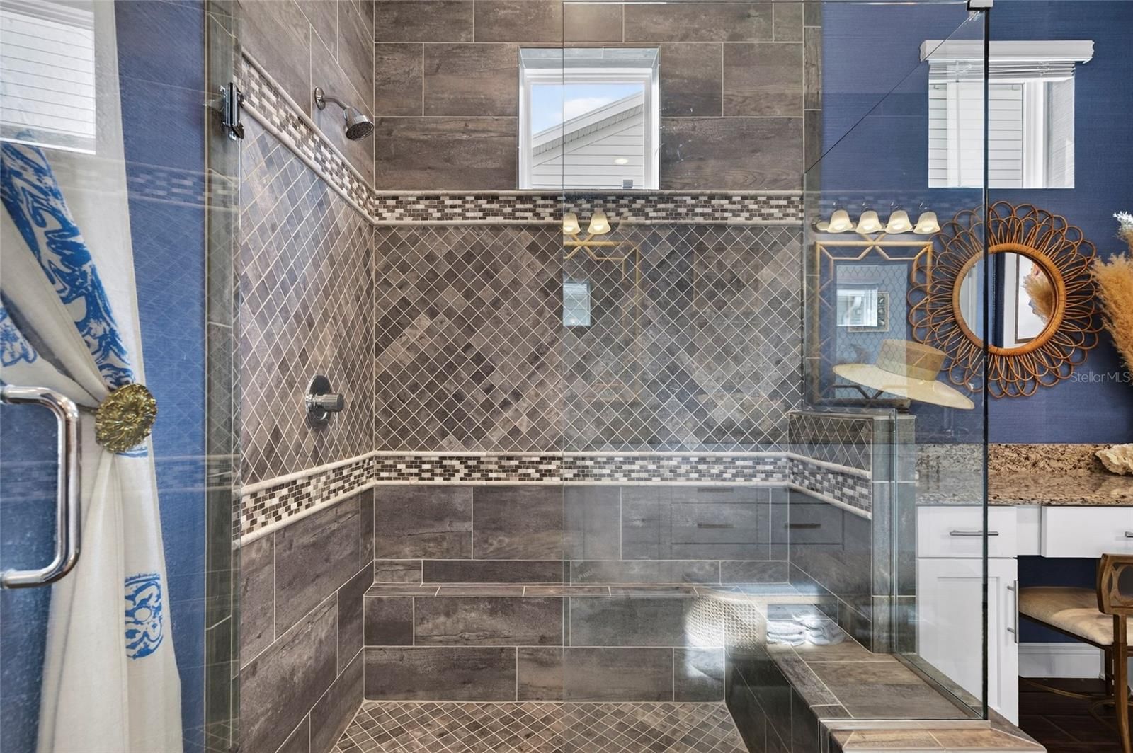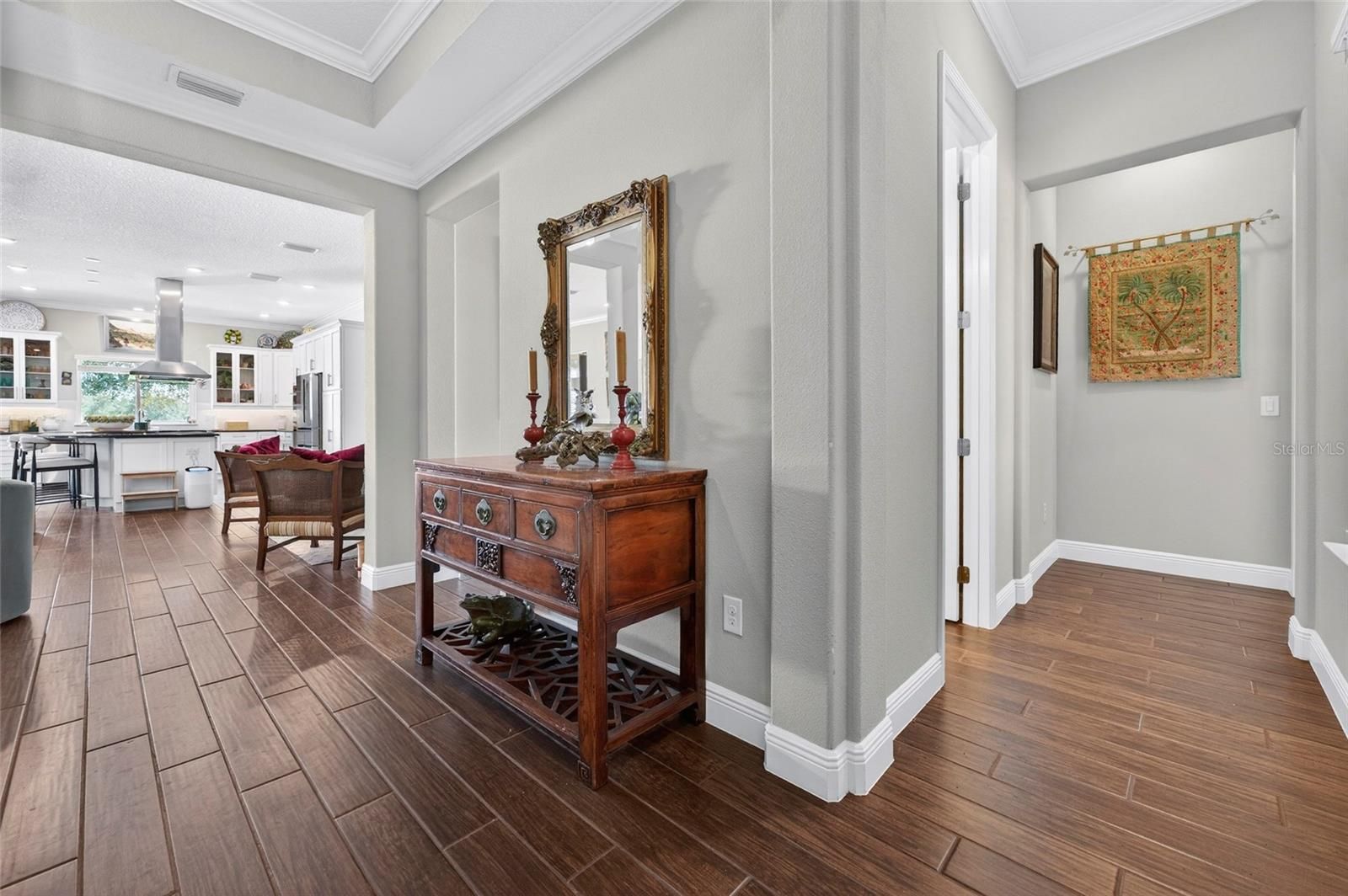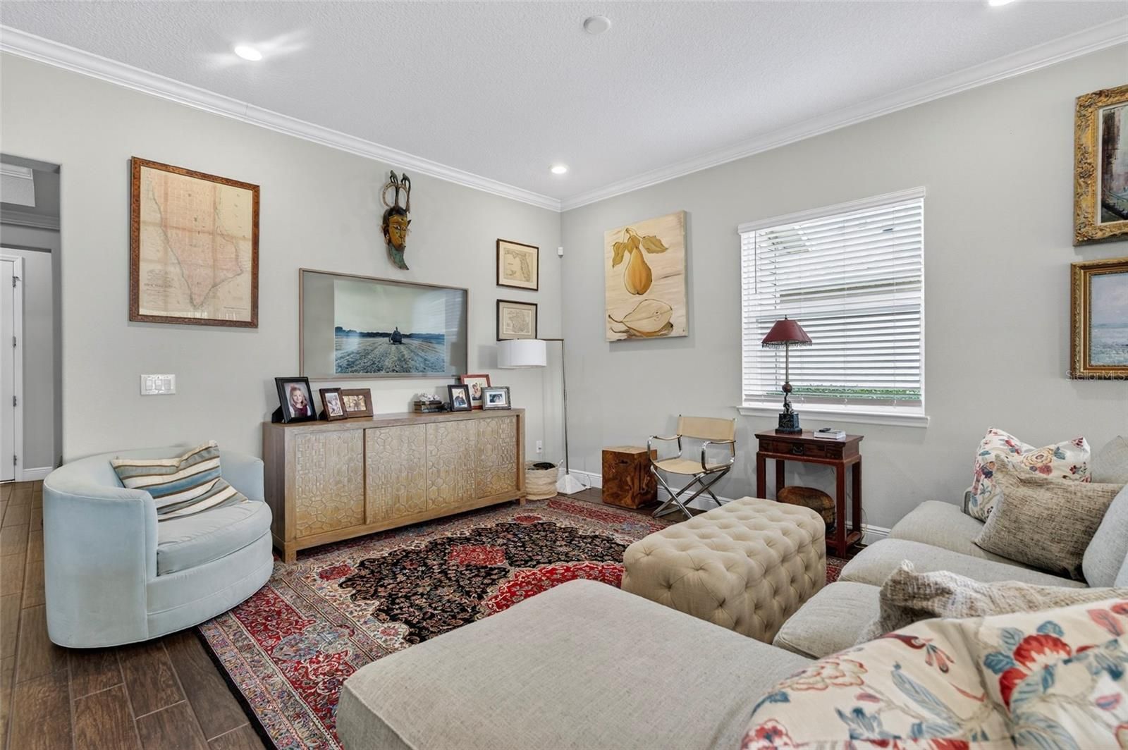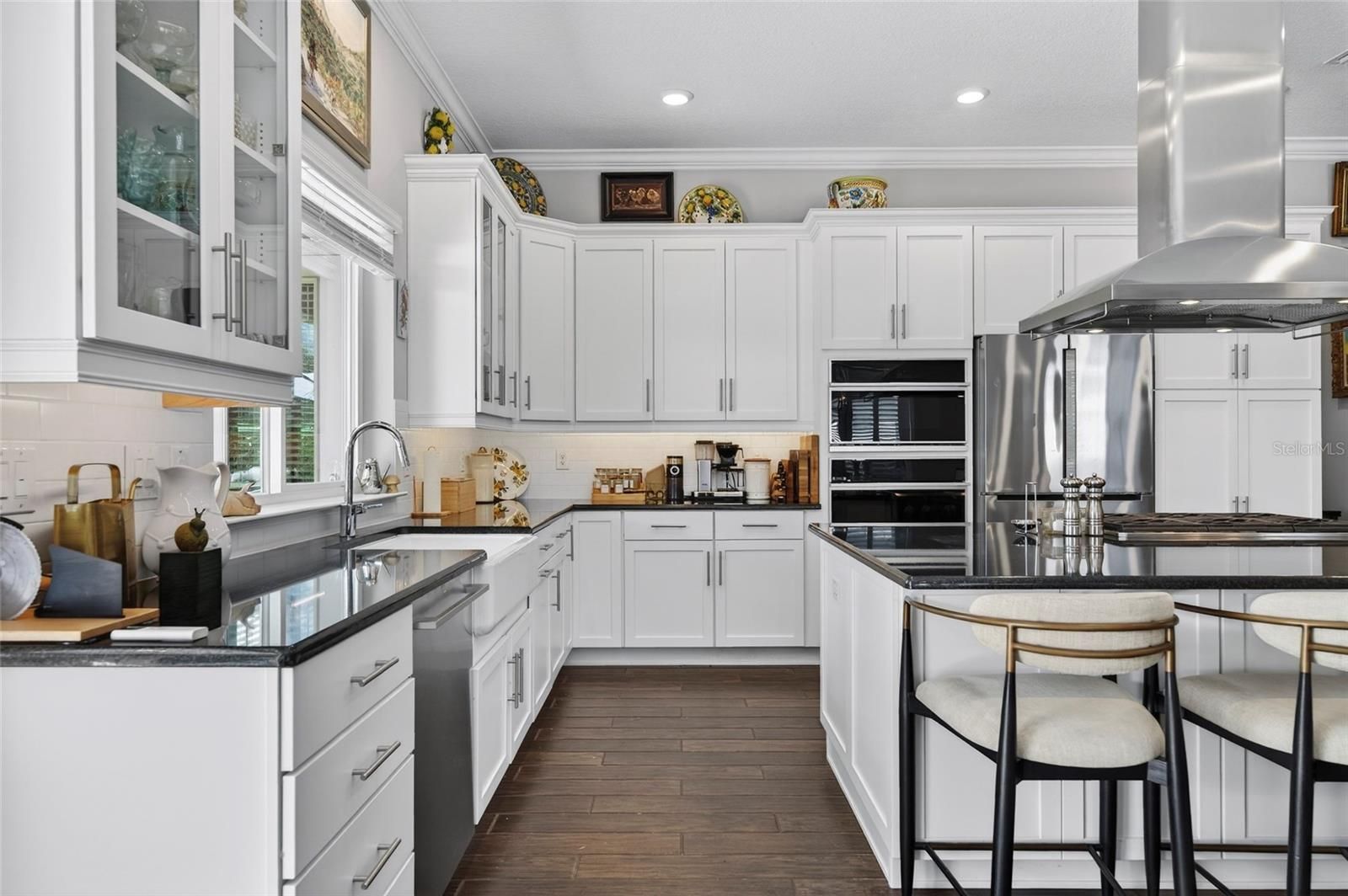 Welcome to this gorgeous golf course home ideally positioned on the 14th hole, offering beautiful views and a relaxed Florida lifestyle. This thoughtfully designed residence features 3 bedrooms, 2½ baths, plus a versatile flex room perfect for an office, hobby space, or additional guest area. Elegant tray ceilings, crown molding, and ceramic tile throughout most of the home create a refined yet comfortable atmosphere, with carpet in two bedrooms for added warmth. The chef's kitchen is a standout, showcasing high-end Bosch and GE appliances, a six-burner stove, farmhouse sink, and upscale finishes that make both everyday living and entertaining a pleasure. A remote controlled gas fireplace in the seating area by the kitchen adds warmth and charm. Stackable sliders open to the lanai, complete with remote-controlled electric privacy screens, while 3M sun tint on the rear and side windows enhances comfort and efficiency. Plantation shutters accent the sunroom, and all closets feature California Custom Closet systems for exceptional organization. Outdoor living is equally impressive with custom travertine tile hardscape on the lanai, a fully equipped outdoor kitchen with a high-end wine cooler, concrete counters, seating for six, and a remote-controlled gas fireplace - perfect for entertaining or unwinding after a day on the course. Additional features include an extended driveway and whole-home water softener. In addition to the golf course, residents enjoy other outstanding community amenities including tennis and pickleball courts, bocce ball, fitness center, Avid Fit Pod, spa, on-site restaurant, Veterans Park, and numerous member-run clubs. Sit back, relax, and enjoy the lifestyle you've been waiting for.