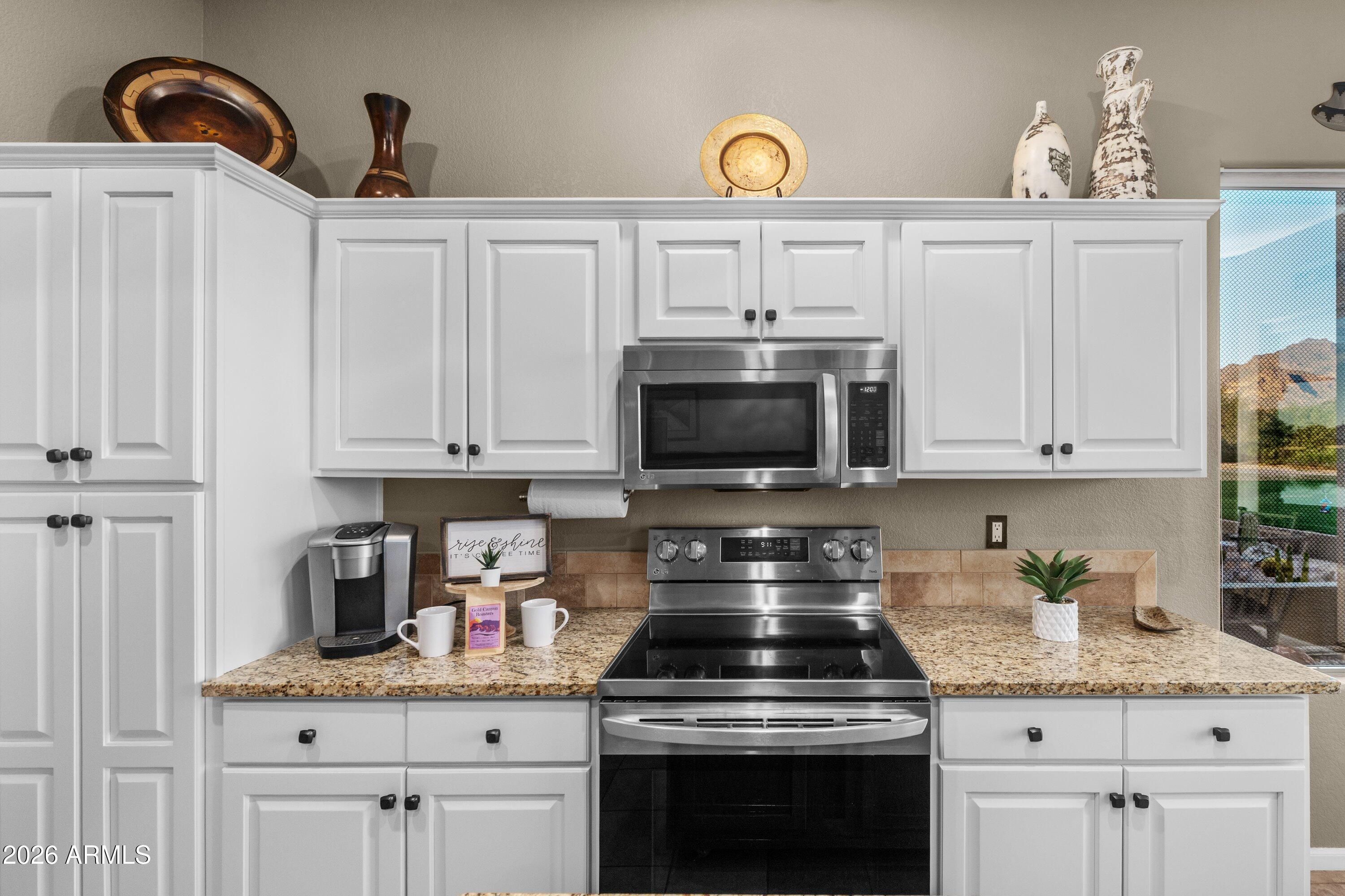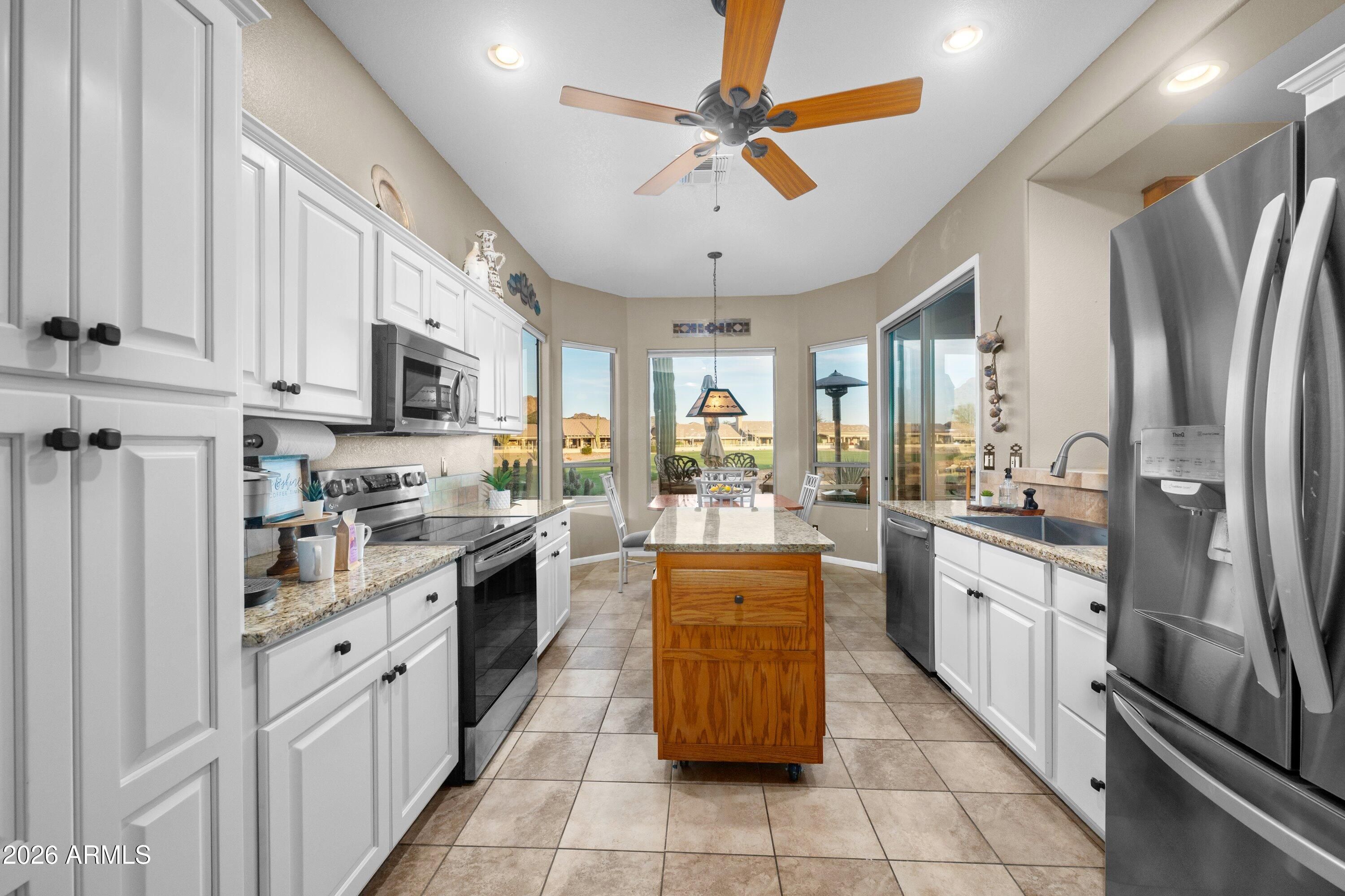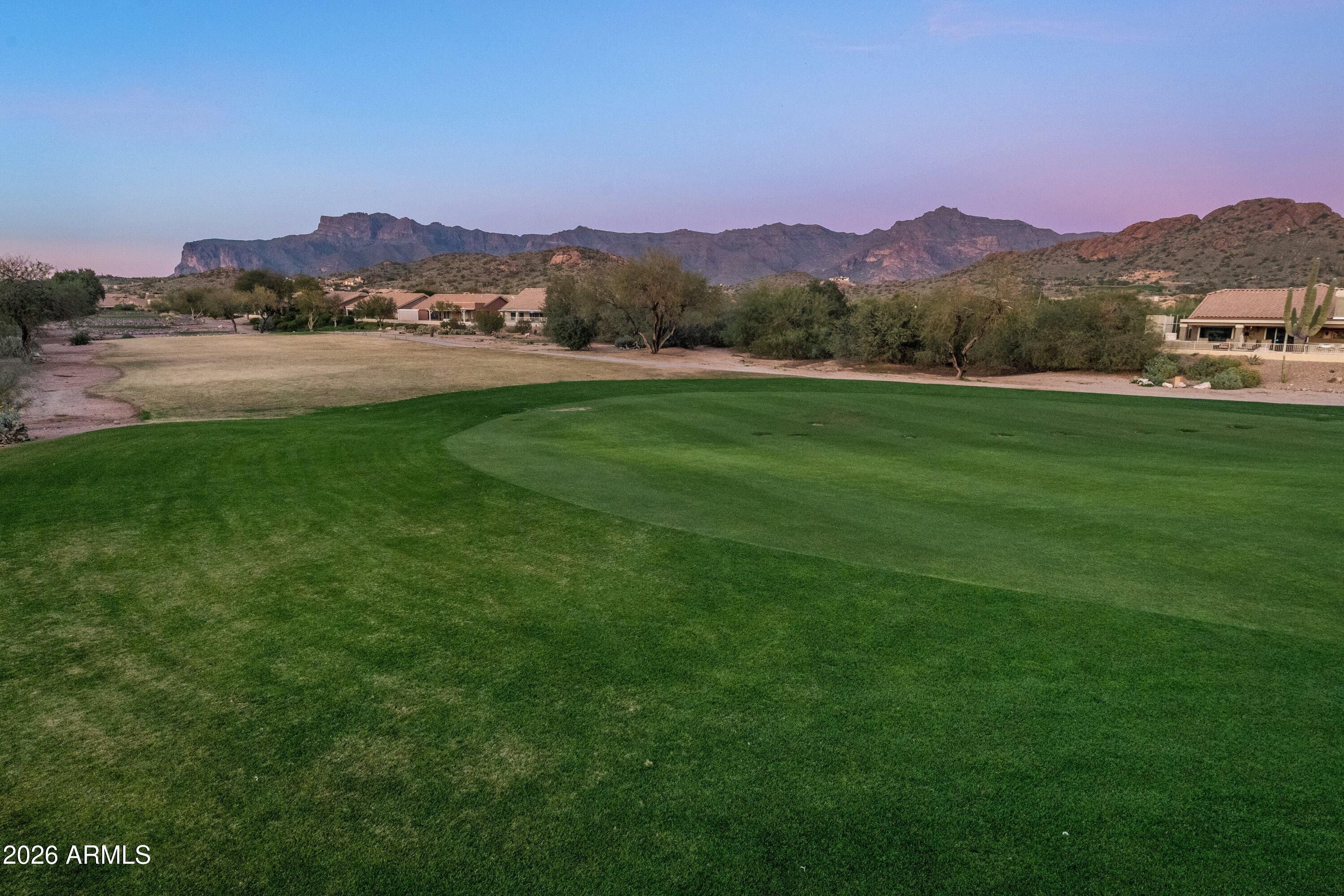 Life in Gold Canyon is meant to be savored, and this beautifully updated 2-bedroom, 2-bath home offers a truly captivating setting along the GOLF COURSE, where lush green fairways, a PEACEFUL POND, and stunning, UNOBSTRUCTED VIEWS of the Superstition and Dinosaur MOUNTAINS create a breathtaking backdrop. As the day winds down, vibrant desert sunsets wash over the mountains and greens, delivering a daily show that never gets old. Designed for memorable moments, the outdoor living spaces are an entertainer's dream. The SCREENED-IN PATIO extends the living area outdoors with a comfortable dining space overlooking the golf course pond, creating the perfect setting for leisurely meals framed by desert skies. Just beyond, a high-top gathering table invites sunset toasts as the mountains glow in the distance, while a dedicated lounge area offers a peaceful place to relax, read, or simply take in the view. A CUSTOM BAR CART, along with a SMOKER & GRILL make hosting effortlesswhether it's an intimate evening under the stars or a lively gathering of friends enjoying the beauty of Gold Canyon. Inside, the home is offered FULLY FURNISHED and completely turnkey, making it ideal for full-time living, a seasonal retreat, or a lock-and-leave golf getaway. TILE flooring THROUGHOUT enhances the clean, cohesive feel of the home, while thoughtfully selected furnishings and accents add warmth and character. Custom HANDCRAFTED WOOD VALANCES frame the windows beautifully, and the dining area is complemented by a stylish custom buffet, perfect for entertaining and displaying local treasures. At the heart of the home, the kitchen has been tastefully upgraded with stunning GRANITE countertops, FRESHLY PAINTED CABINETS (inside and out), NEWER APPLIANCES, custom island and quality finishes that balance elegance with everyday ease. Both bathrooms reflect the same level of care, featuring GRANITE counters and beautifully TILED SHOWERS, creating spa-like spaces to unwind after a day on the course or trails. Major updates provide peace of mind and long-term value, including a NEWER ROOF, HVAC, Water Softener and H20 Heater. Even the GARAGE has been thoughtfully refreshed, showcasing NEW PAINT from top to bottom, reinforcing the pride of ownership found throughout the home. The HOA includes front landscape maintenance and exterior paint, allowing for low-maintenance living while preserving the community's beauty. Whether you're enjoying morning coffee overlooking the greens, hosting friends after a round of golf, or watching the sun dip behind the mountains, this home delivers a lifestyle defined by comfort, scenery, and effortless desert living.