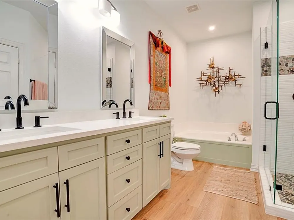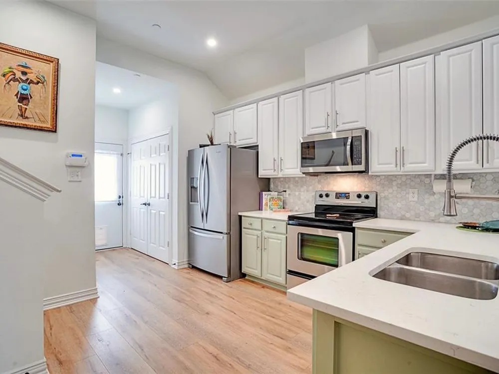 This townhome delivers where it counts—design, layout, location, and finish. Every space feels intentional, starting with wide-plank White Oak LVP floors that run through an open main level built for everyday living. The kitchen is clean and sharp—custom cabinetry, quartz counters, marble tile that adds texture, and stainless appliances that fit the space. Nothing wasted, nothing overdone. Down the hall, a laundry closet fits full-size machines without forcing a puzzle, and there’s direct access to a two-car garage that’s already wired for your EV—future-ready from day one. The primary suite is on the main floor, private and separate from the rest. No shared walls, no awkward corners—just a well-designed bedroom that offers plenty of space. The primary bathroom is clean and grown-up, with a walk-in shower, separate bath tub, dual vanities with custom storage, and a generously sized walk-in closet. Upstairs, two more bedrooms and a large flex space offer room to grow, host, or create—use it how you want; the layout doesn’t box you in. Outside, a private fenced patio gives you a spot to read, grill, unwind, or let the dog out—easy and low-maintenance. The community offers a full set of amenities—pool, gym, clubhouse, basketball court, playground—all well-kept and just steps away. And the location puts you right where you want to be: minutes to Highway 75, Whole Foods, Fairview Town Center, Allen Outlets, and Pin Stack. Everything is close. This isn’t just a place to live. It’s a home that runs smoothly—smart, solid, and ready for what’s next.