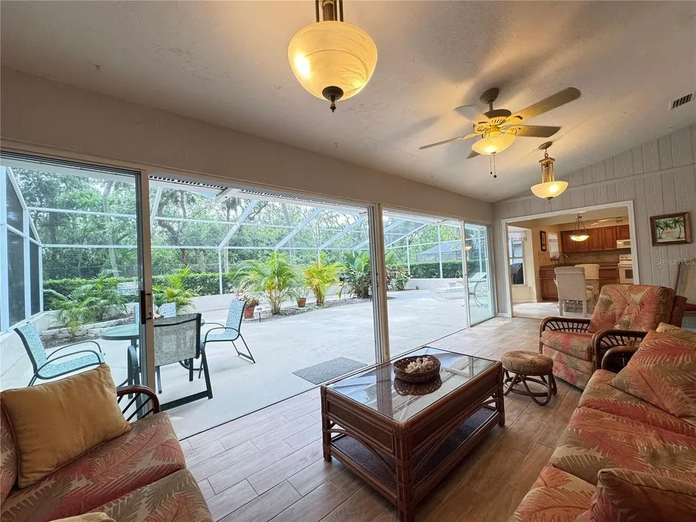 Step into the Florida vacation lifestyle in this beautifully updated home, nestled within the gated, resort-style community of Garden Lakes. Move-in ready and freshly painted, this inviting home features neutral tile throughout and a thoughtfully designed split floor plan that maximizes comfort, privacy, and convenience. The spacious living and dining area is perfect for both relaxation and entertaining, seamlessly flowing into the air-conditioned Florida room. From there, enjoy tranquil views of the oversized screened lanai and the serene natural backdrop beyond. The kitchen features beautiful updated cabinetry, gleaming quartz countertops, and newer appliances. A cozy breakfast nook overlooks the lanai and backyard, creating the perfect spot to start your day with coffee and sunshine. Storage is no issue here, with abundant cabinets, abundant drawers, and a large walk-in pantry/laundry room to keep everything organized. You'll enjoy coming home to the spacious master suite, complete with dual closets and a beautifully renovated bathroom featuring a new vanity, sink, and a luxurious no-threshold shower with elegant stone-look tile. The home also offers generous storage, including ample closet space and a well-appointed garage. Outdoor living is a dream with the expansive screened courtyard—ideal for hosting dinner parties or simply unwinding with a good book and a refreshing drink while taking in the peaceful surroundings. Plus, if you’re interested, the stylish home furnishings are available as a separate option. Beyond your doorstep, Garden Lakes offers an unbeatable lifestyle with winding walking paths shaded by majestic oaks, a recently updated clubhouse, and a wealth of activities. Stay active with tennis, pickleball, shuffleboard, fitness classes, and water aerobics, or join community groups for arts & crafts, cards, and social gatherings. The heated pool invites you to take a leisurely swim or just float and relax under the Florida sun. Conveniently located near top shopping, dining, medical facilities, golf courses, and entertainment, this charming community offers both tranquility and easy access to everything you need. Don't miss your chance to call this exceptional home yours—schedule your showing today!
